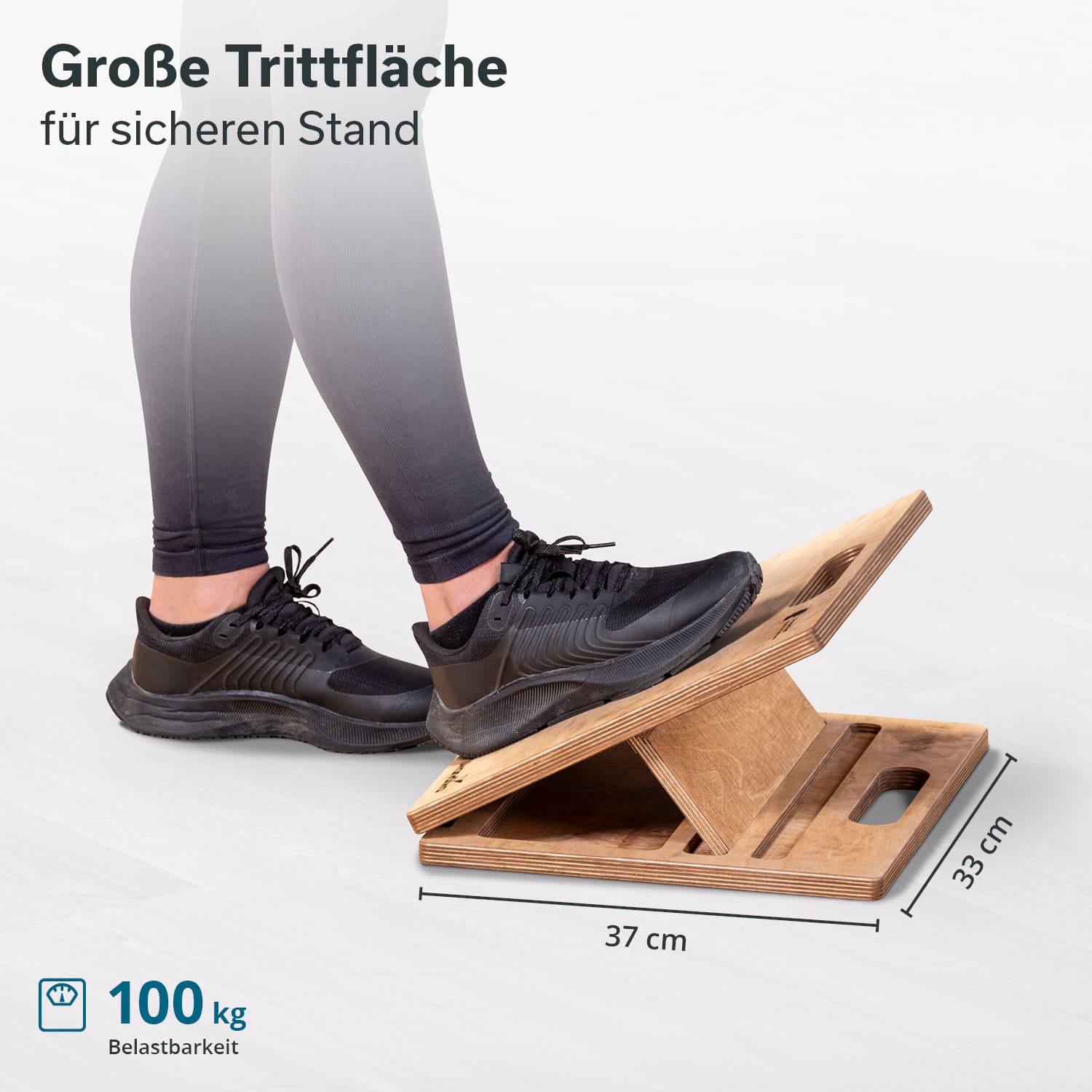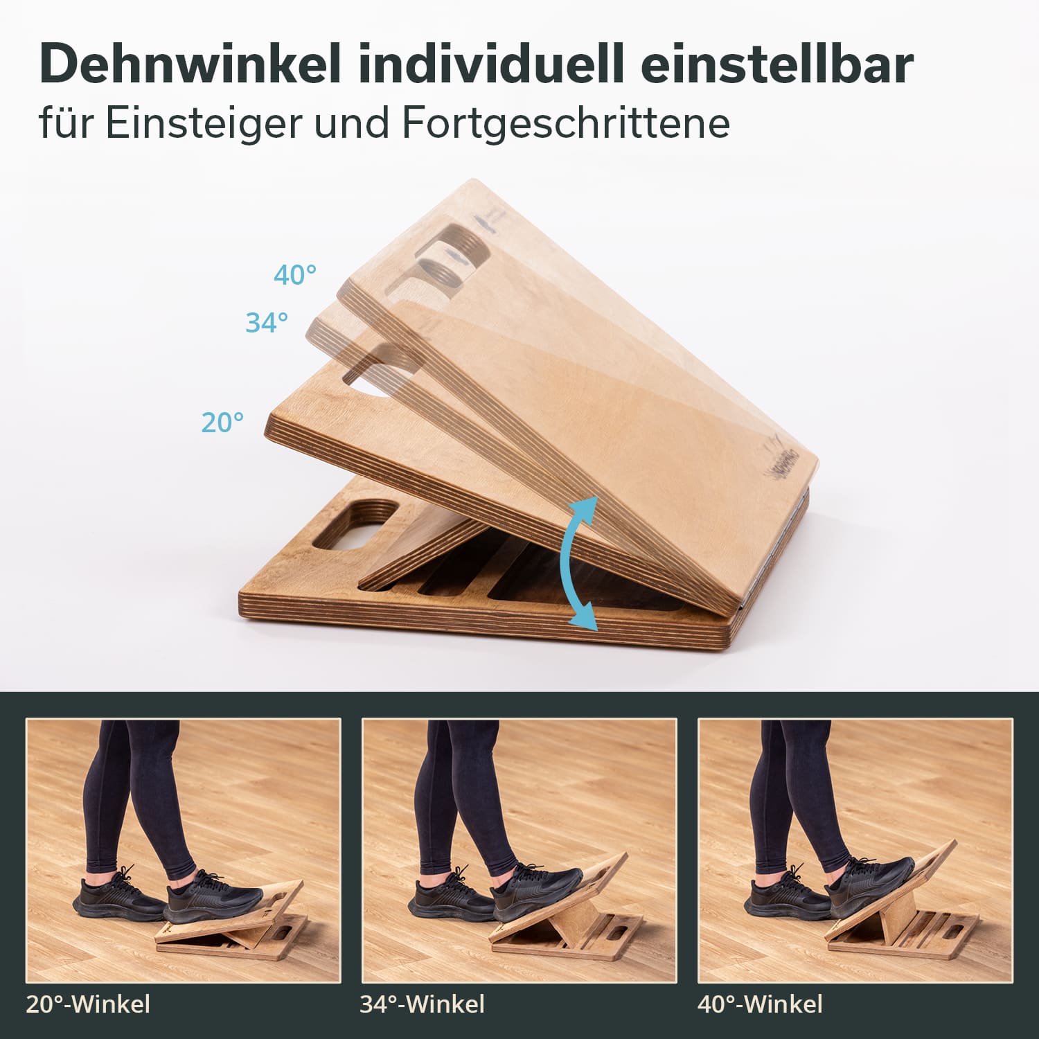Die clevere Klappfunktion des Wadendehners mit 3 verschiedenen Stufen sorgt dafür, dass die Stehfläche in verschiedenen Winkeln ausgerichtet werden kann. So ist der Wadendehner ganz leicht an verschiedene Fitnessstufen und Dehnübungsbedürfnisse anpassbar.