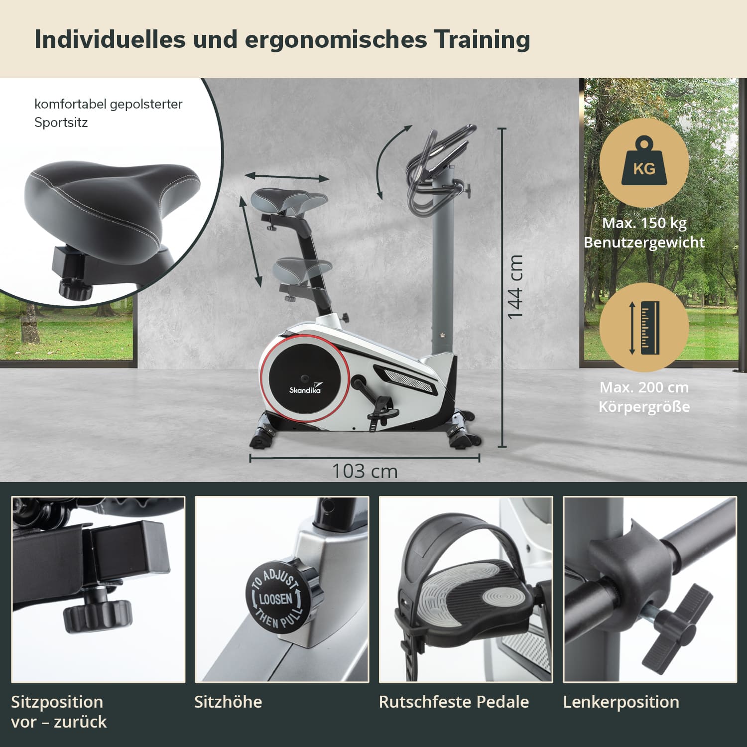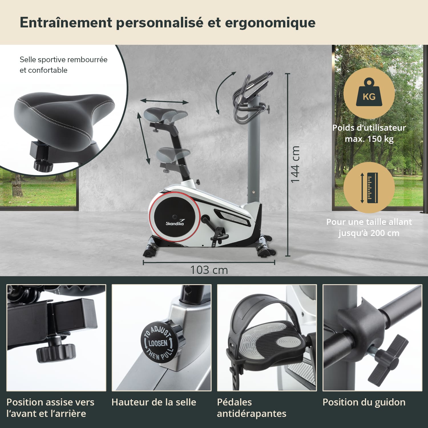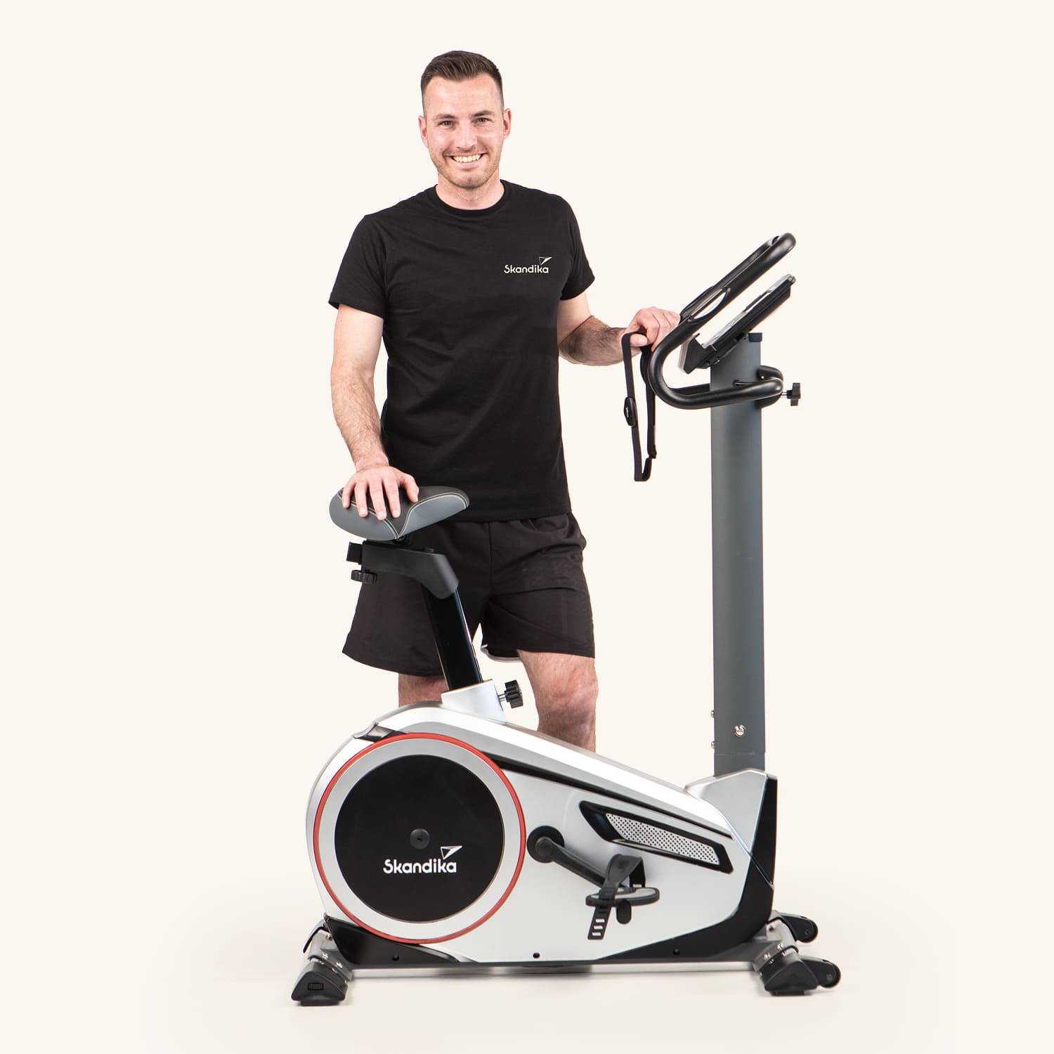 - Comfortable, padded saddle, pulse sensors in the handlebars, transport wheels, Skandika chest strap