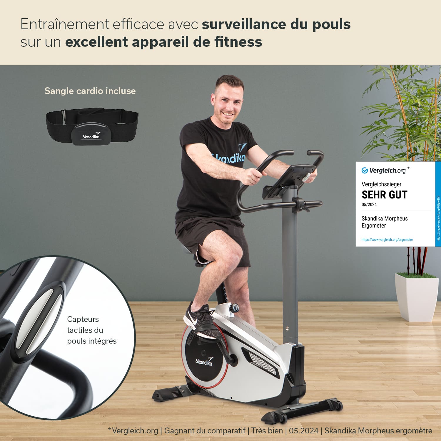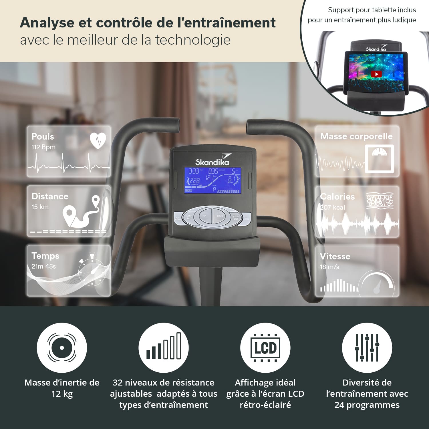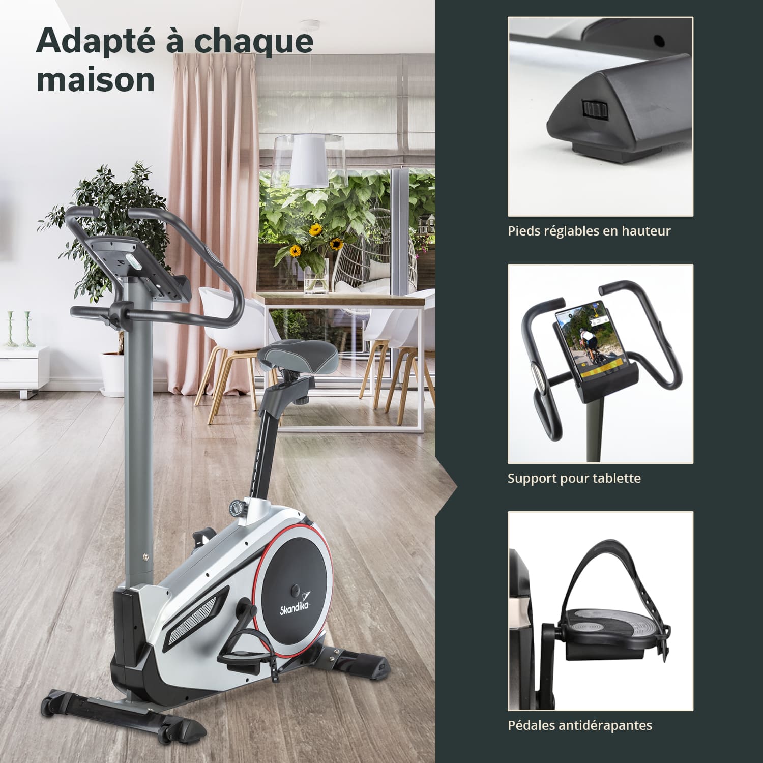 - Comfortable, padded saddle, pulse sensors in the handlebars, transport wheels, Skandika chest strap