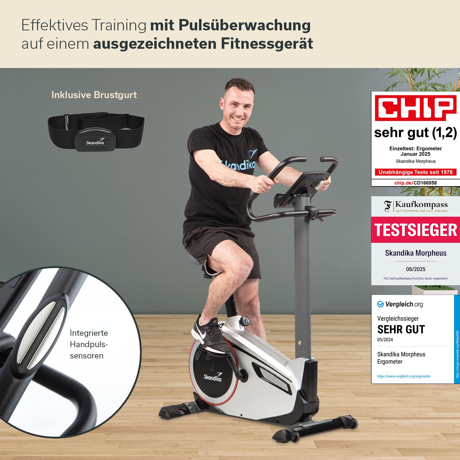 For even more effective training, the pulse is measured via the four stainless steel sensors integrated in the handlebars and displayed in real time on the training computer. Alternatively, a chest strap for heart rate measurement is also included in the scope of delivery.