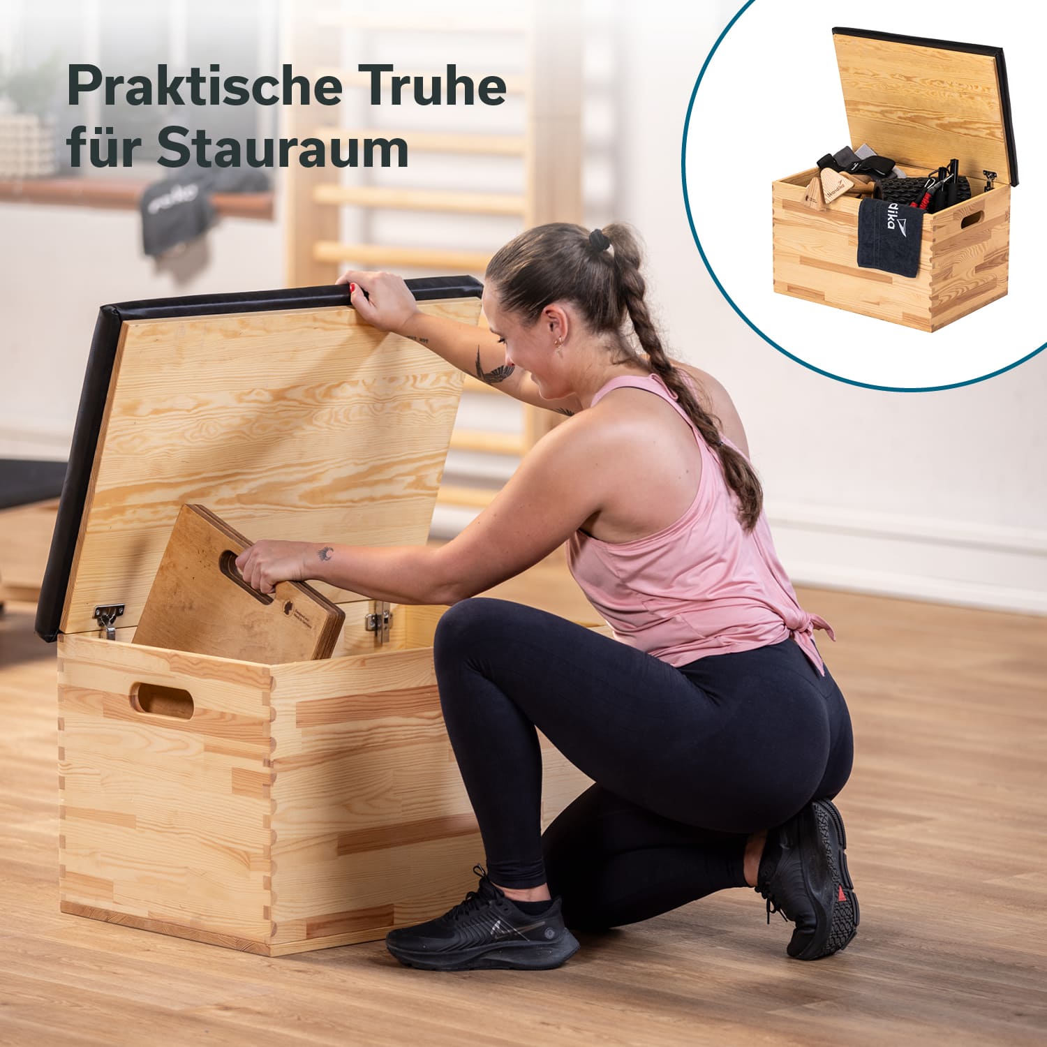Der Sprungkasten bietet dank seines hochklappbaren Deckels großzügigen Stauraum für Fitnesszubehör wie Hanteln, Wadendehner und Widerstandsbänder. So bleibt der Trainingsbereich stets aufgeräumt und das Equipment ist jederzeit griffbereit.