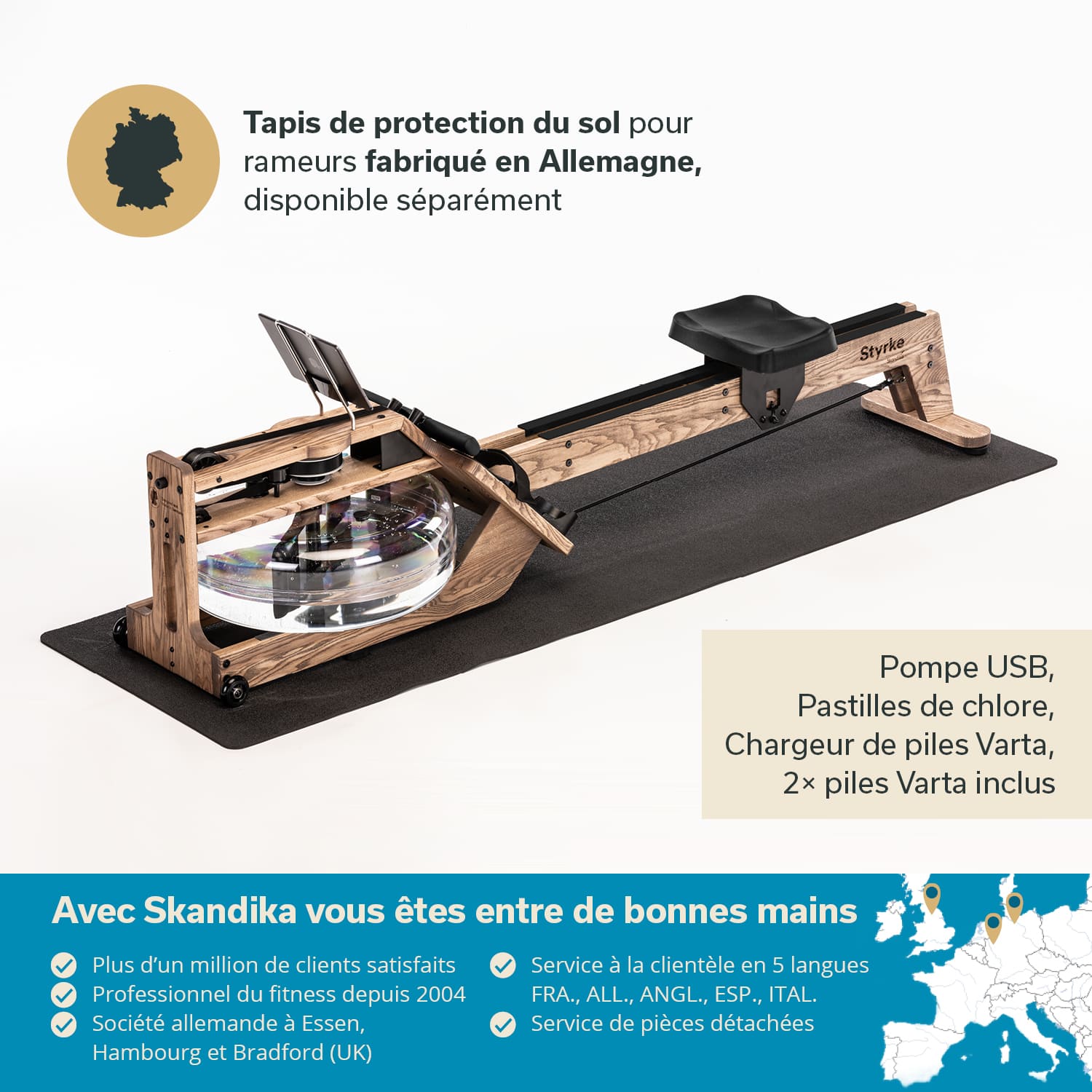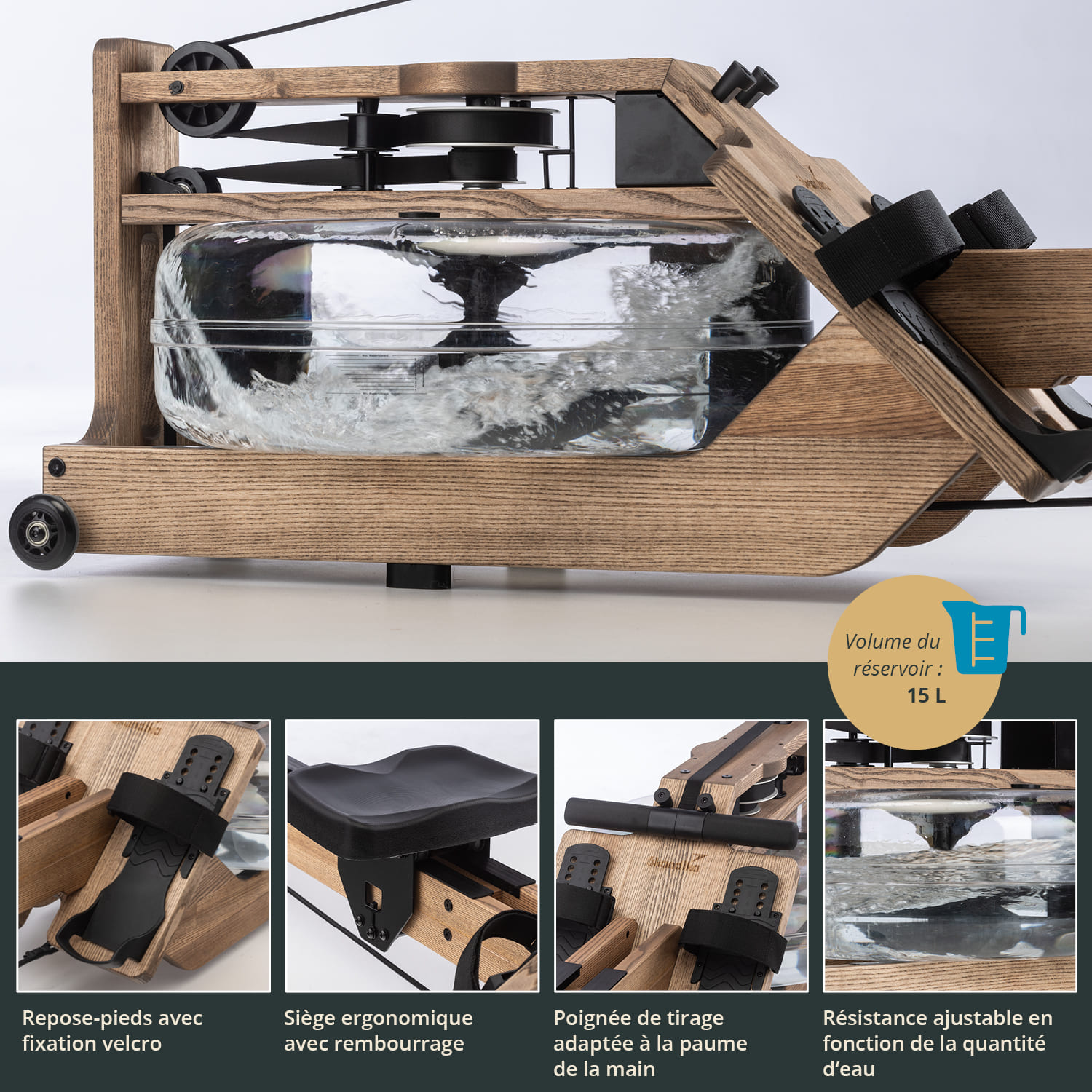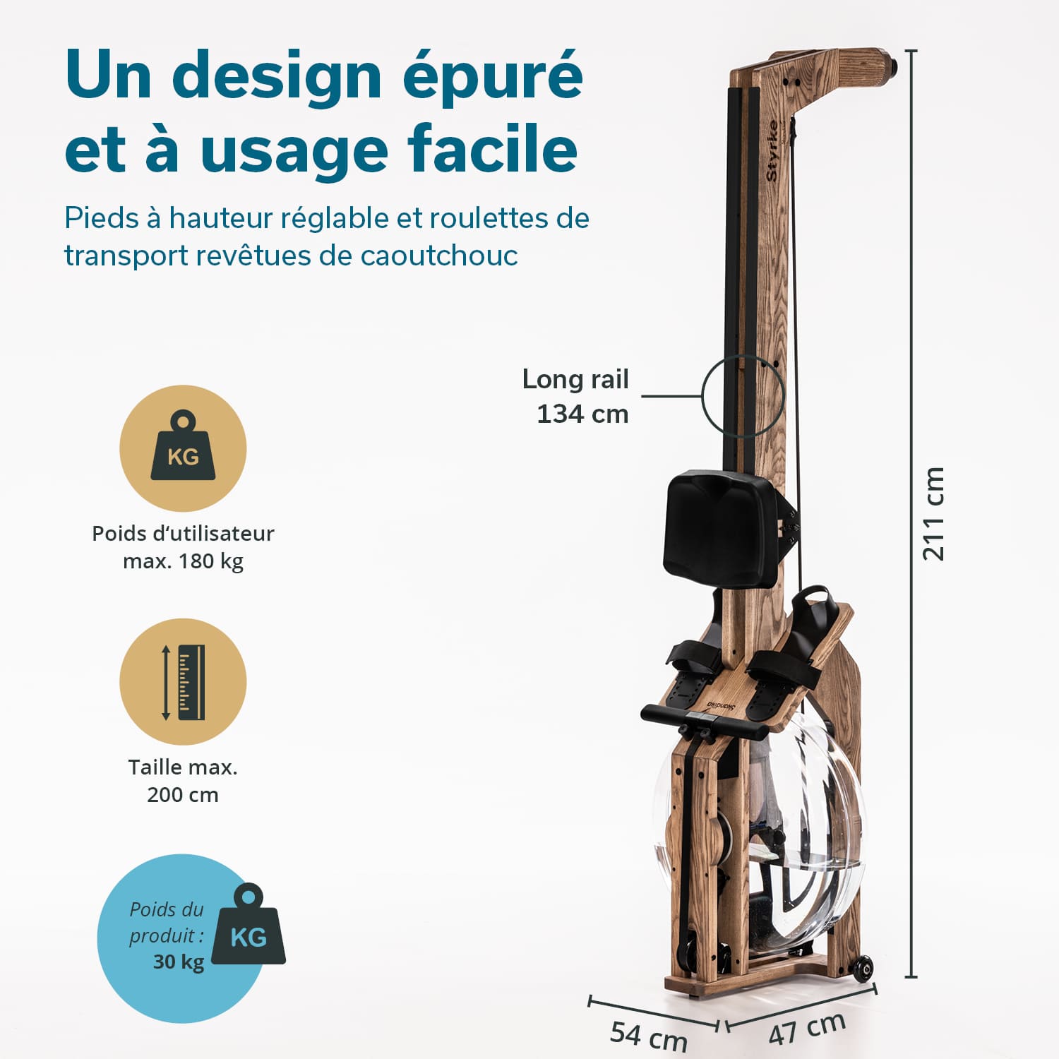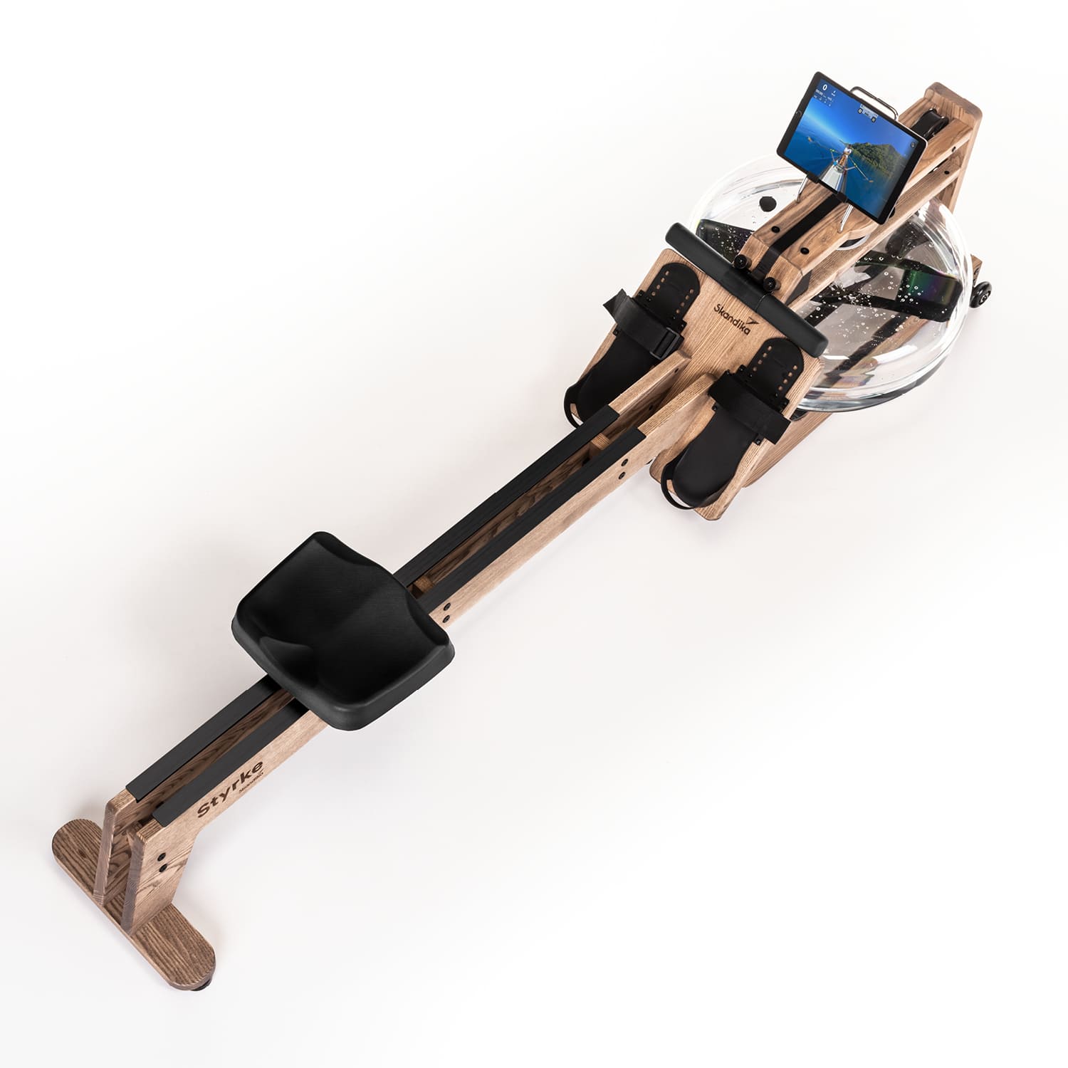 The water-braked pull system with even water noise, the low seating position and our unique double rail with inclination ensure that rowing on the Styrke feels authentic. For those who want to row upstream, need more resistance or are already advanced rowers, a stronger (red marked) pull strap is also included.