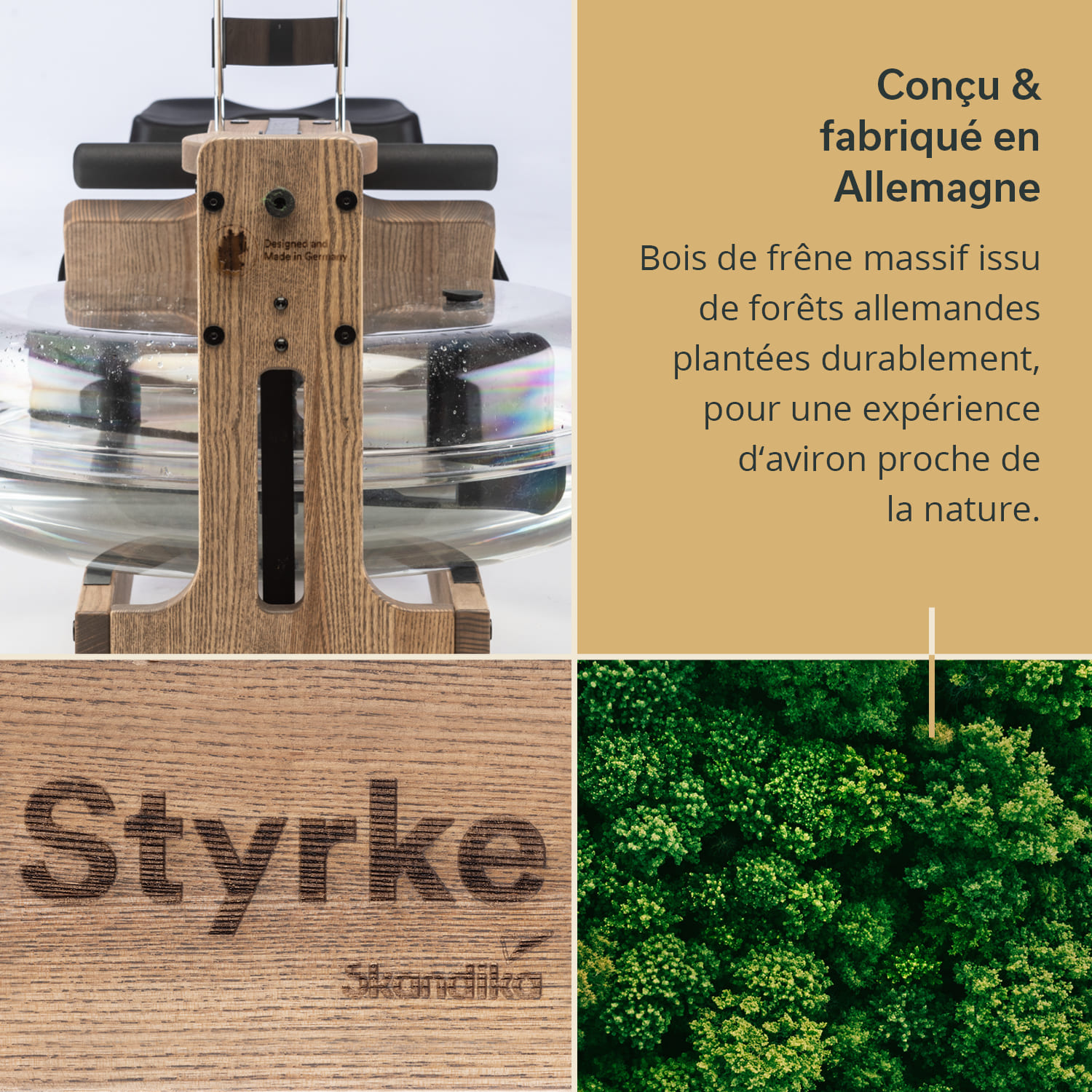 The latest generation of our premium Styrke rowing machine made of solid ash now not only combines stylish design with professional standards of ergonomics, aesthetics and performance, but also raises quality and standards to an even higher level with its "Made in Germany" title. In addition, sustainable, German forests and low-waste, local processing bring awareness of our environment to the fore. The result: a maximally authentic rowing experience in symbiosis with German craftsmanship and a love for our planet.