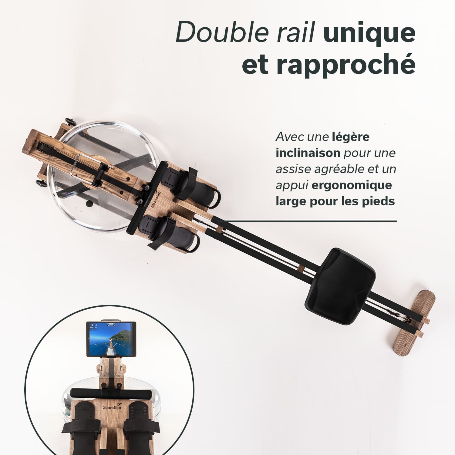 The completely new double rail, which lies together, allows the feet to stand as wide as the pelvis. The result: ergonomically correct movement sequences for pain-free completion of long and intensive sessions. Matching this: an ergonomically shaped, padded seat and the rowing handle with anti-slip coating, which is moulded to fit the palms of the hands.
