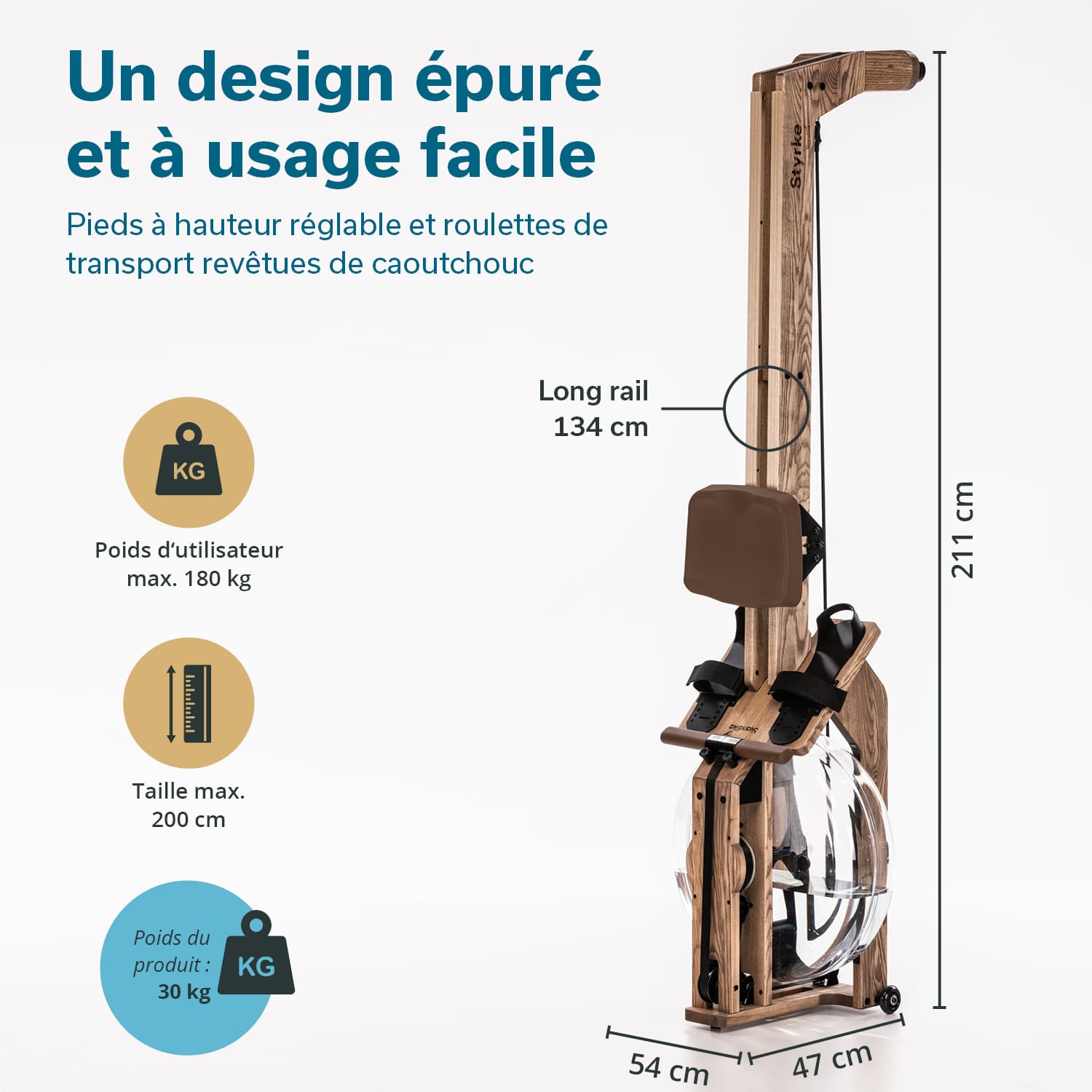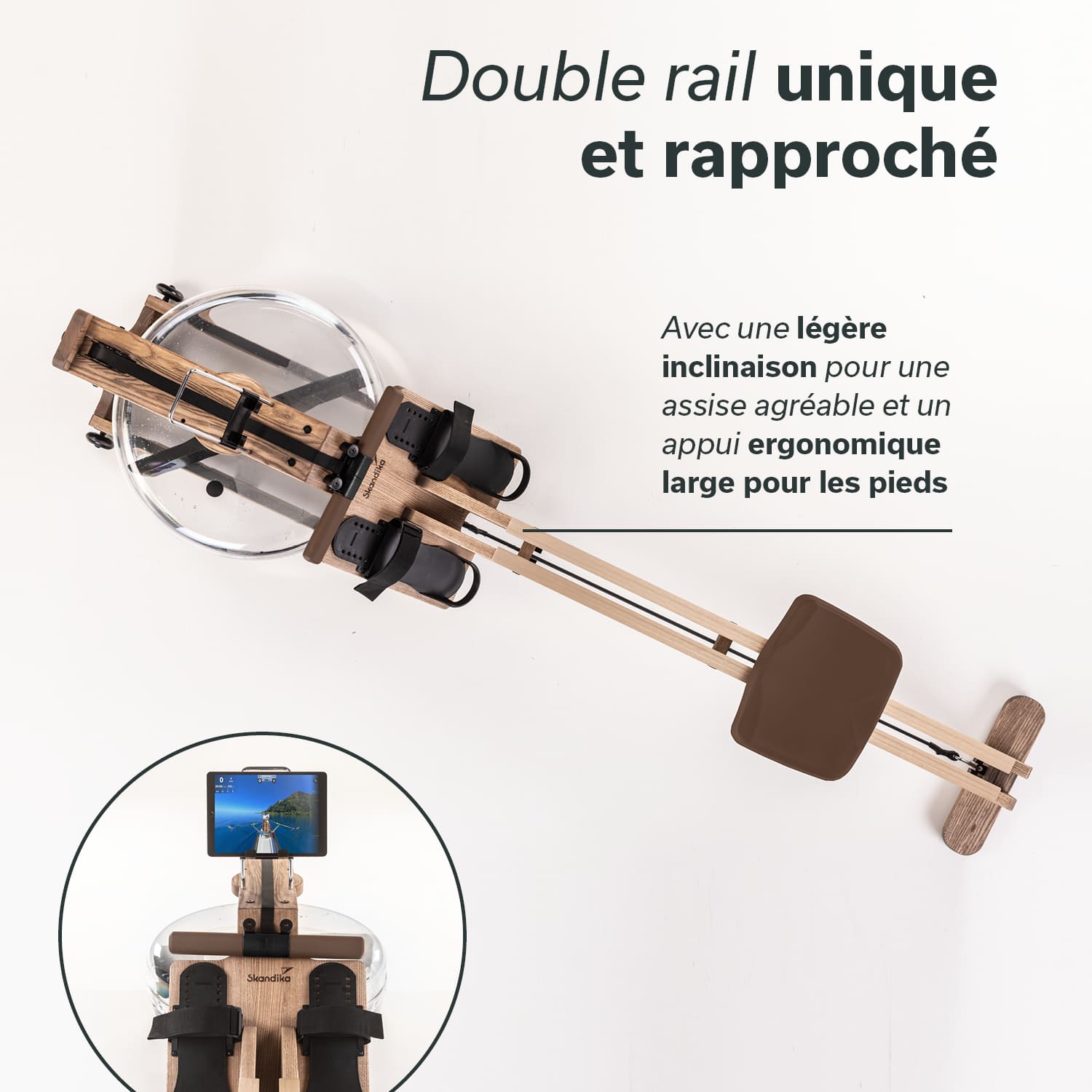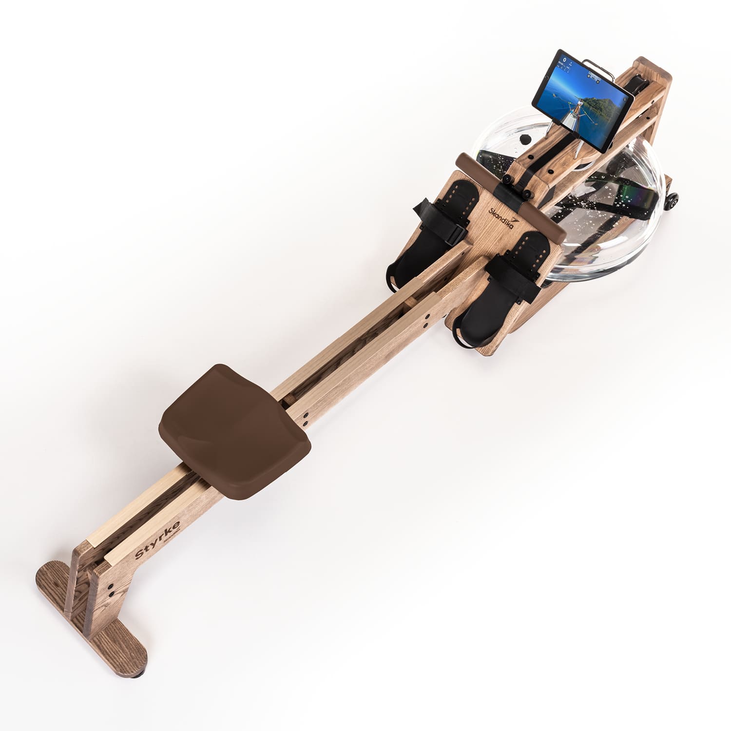The water-braked pull system with even water noise, the low seating position and our unique double rail with inclination ensure that rowing on the Styrke feels authentic. For those who want to row upstream, need more resistance or are already advanced rowers, a stronger (red marked) pull strap is also included.