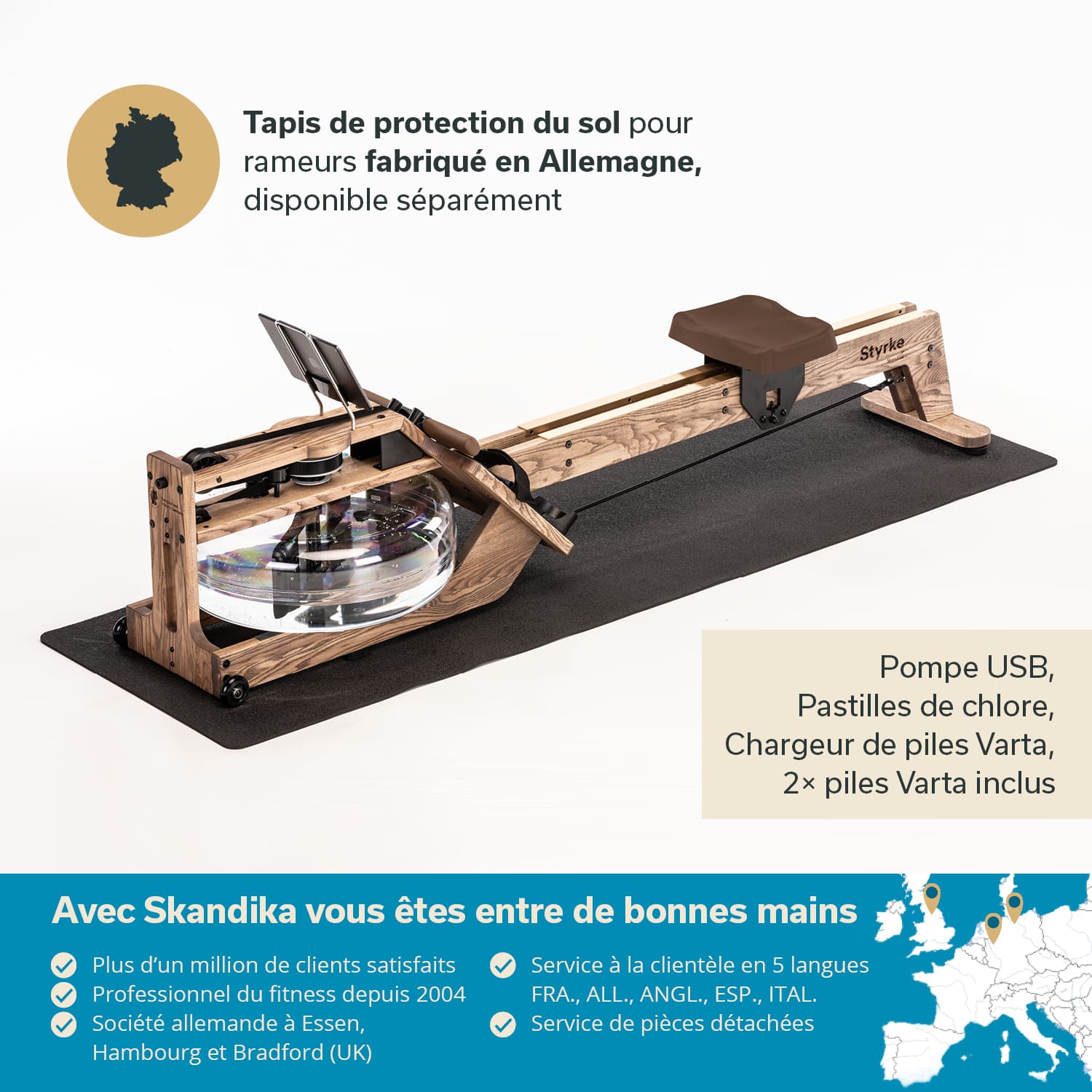 Styrke comes with an electric USB pump and the corresponding Bluetooth receiver. Two AAA Varta rechargeable batteries (incl. Varta quick charger) for the Bluetooth transmitter ensure that Styrke is ready for use immediately after a short set-up time. Detailed instructions are also included in the scope of delivery.