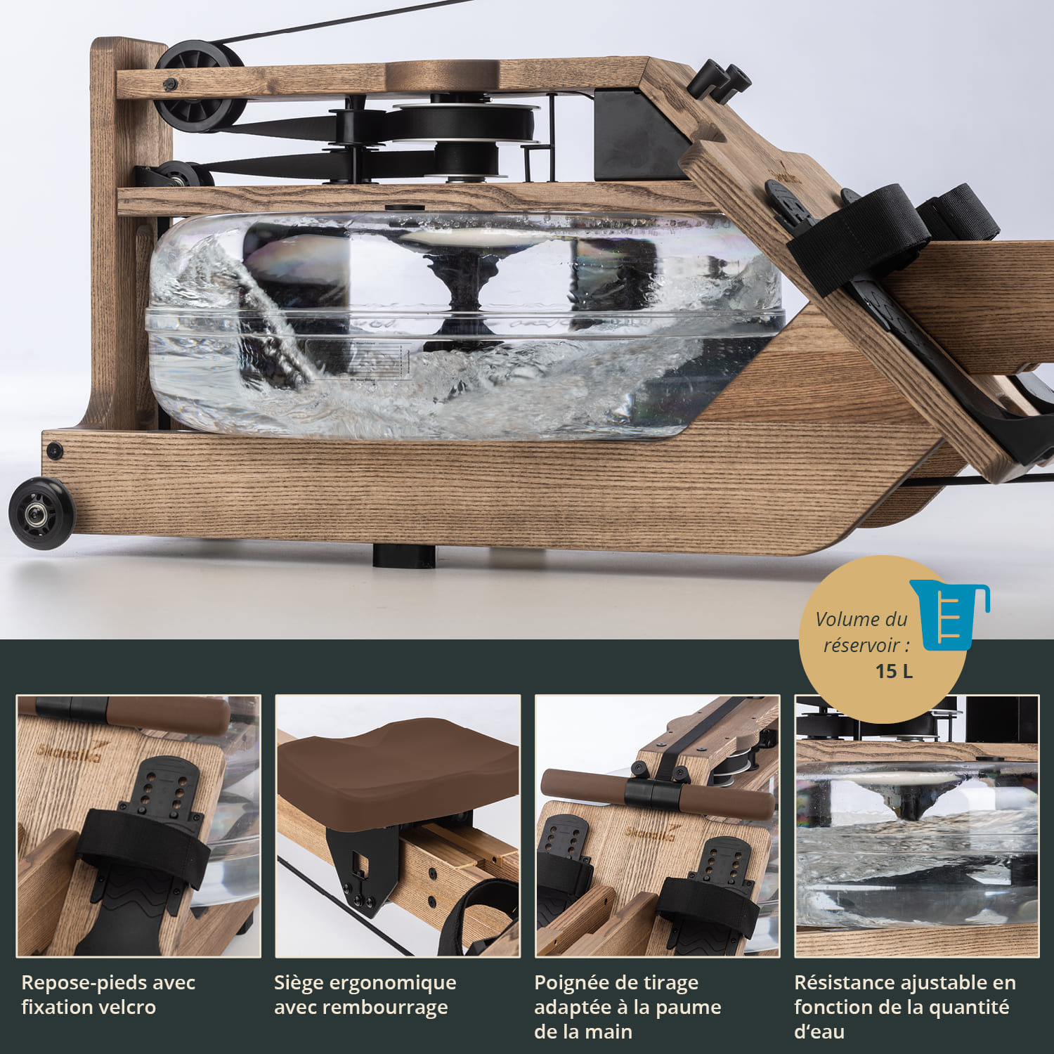 The centrepiece of the Styrke: the water-braked traction system. A paddle works inside the unbreakable water tank. It ensures that rowing on the Styrke feels like rowing. The rowing resistance varies depending on the rowing frequency and the amount of water in the tank. It can be filled with 10 to 15 litres - the fuller the tank, the greater the resistance.