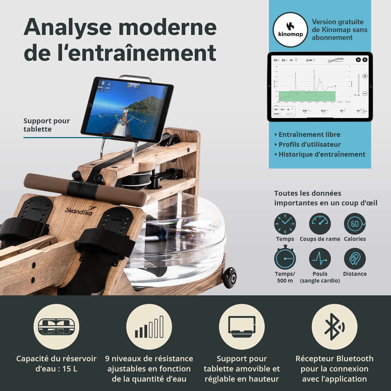 The free Skandika Training Data app for iOS and Android transforms your smartphone or tablet into an exclusive training computer. The intuitive app shows all relevant data such as time, time/500 m, distance, rowing strokes, rowing strokes/min and speed at a glance.