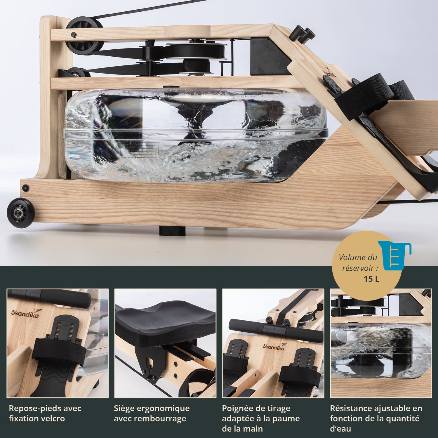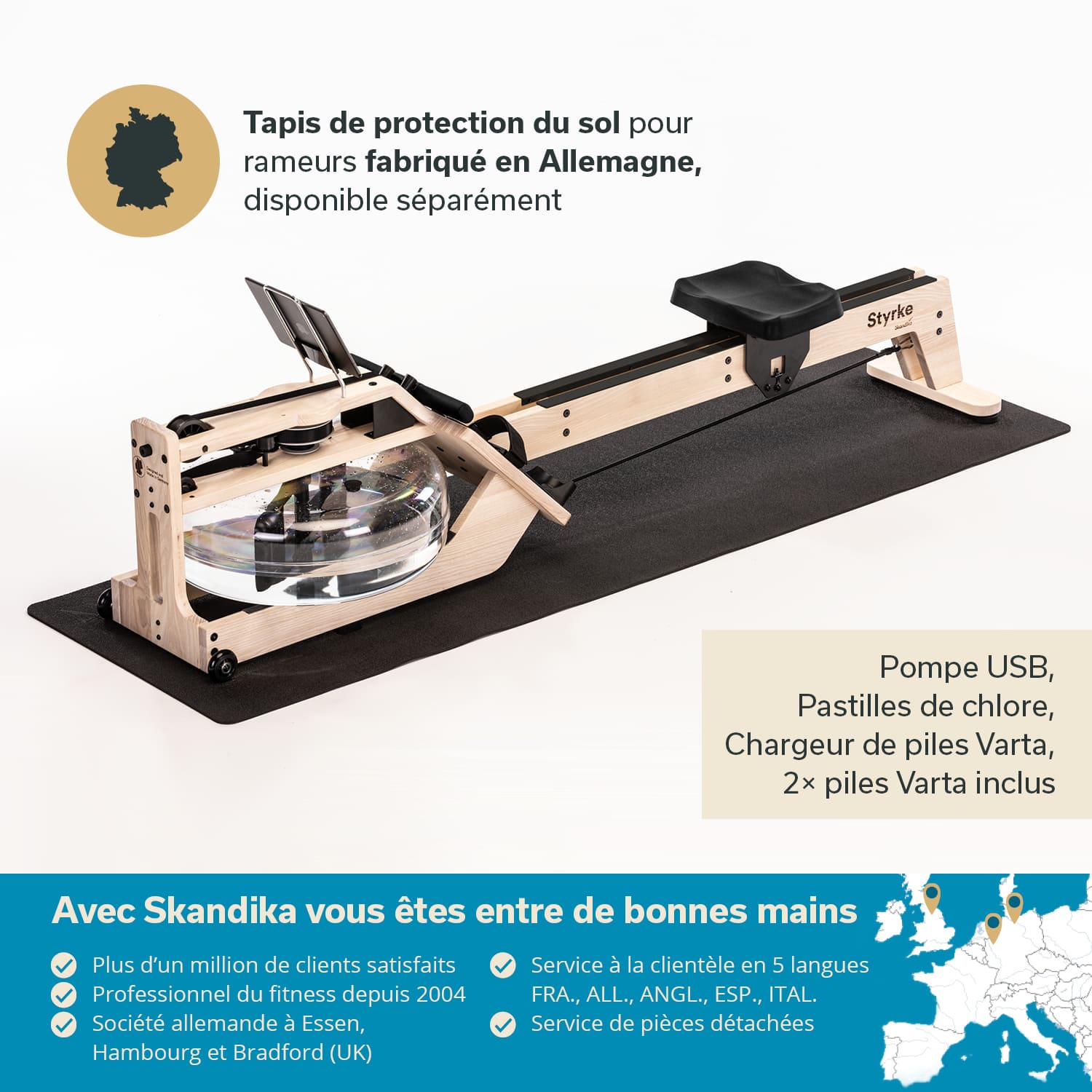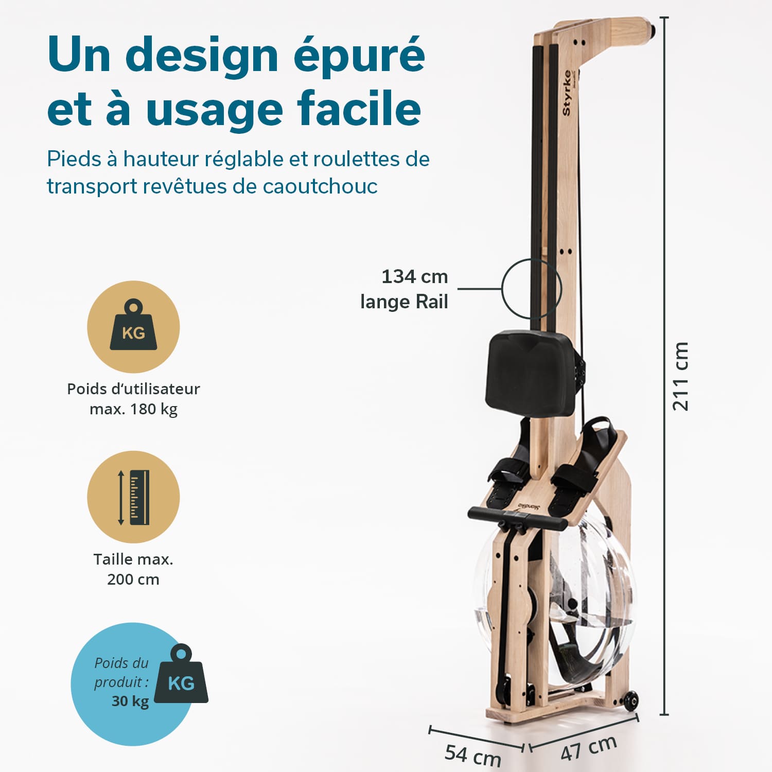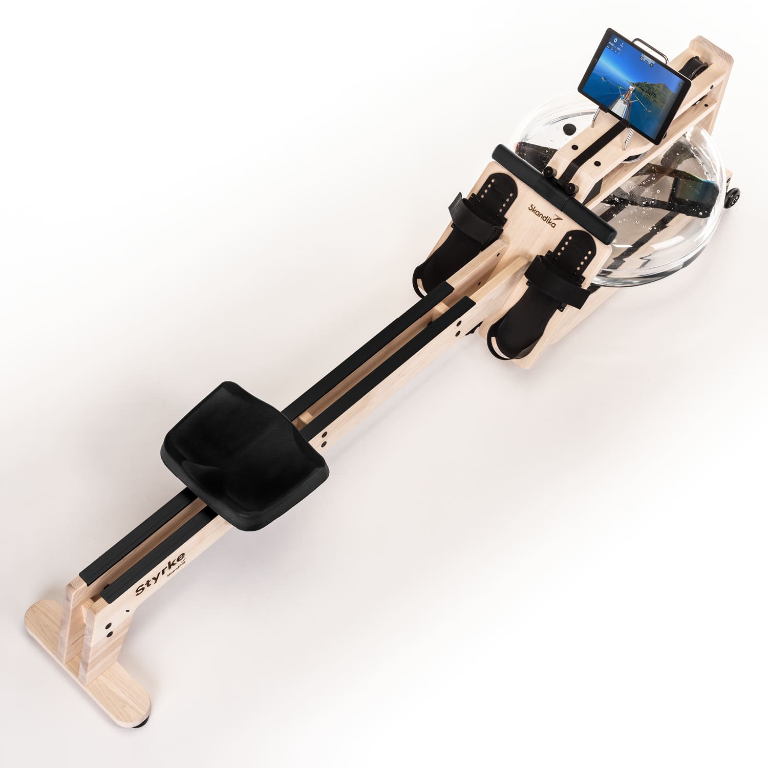 The water-braked pull system with even water noise, the low seating position and our unique double rail with inclination ensure that rowing on the Styrke feels authentic. For those who want to row upstream, need more resistance or are already advanced rowers, a stronger (red marked) pull strap is also included.