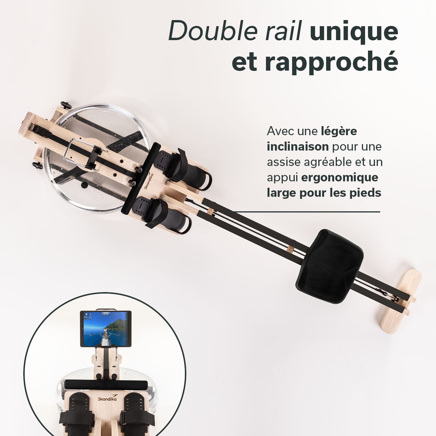 The completely new double rail, which lies together, allows the feet to stand as wide as the pelvis. The result: ergonomically correct movement sequences for pain-free completion of long and intensive sessions. Matching this: an ergonomically shaped, padded seat and the rowing handle with anti-slip coating, which is moulded to fit the palms of the hands.