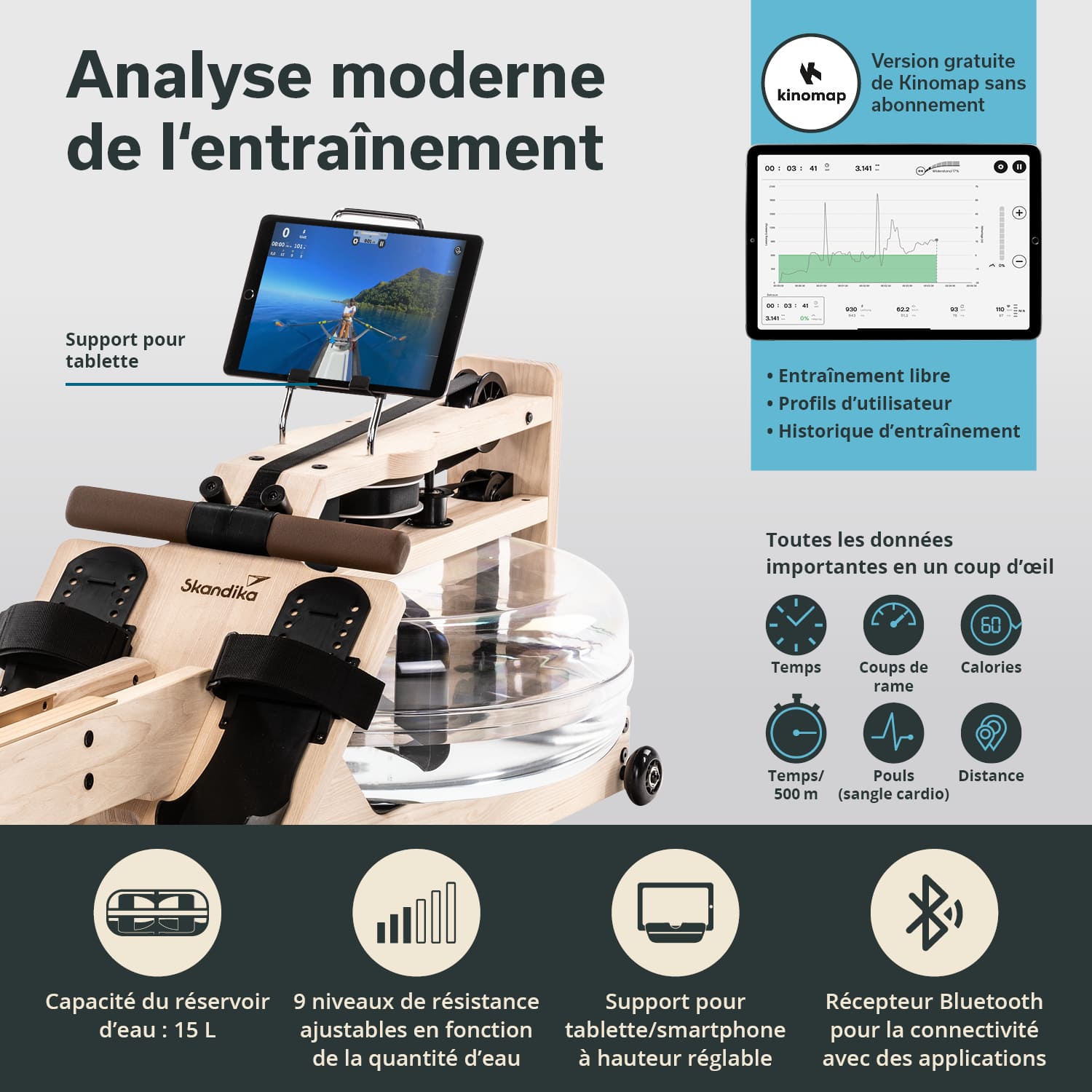The free Skandika Training Data app for iOS and Android transforms your smartphone or tablet into an exclusive training computer. The intuitive app shows all relevant data such as time, time/500 m, distance, rowing strokes, rowing strokes/min and speed at a glance.