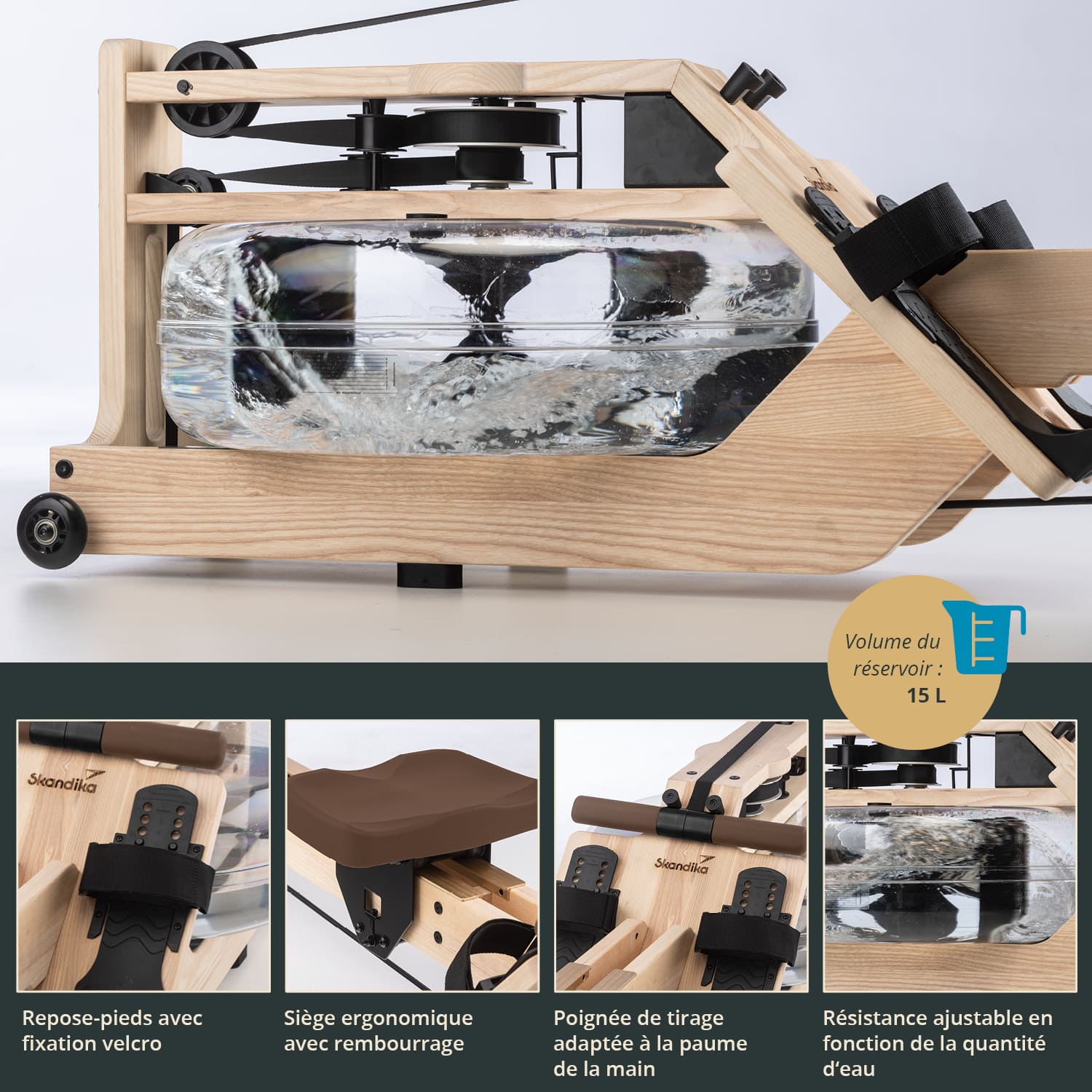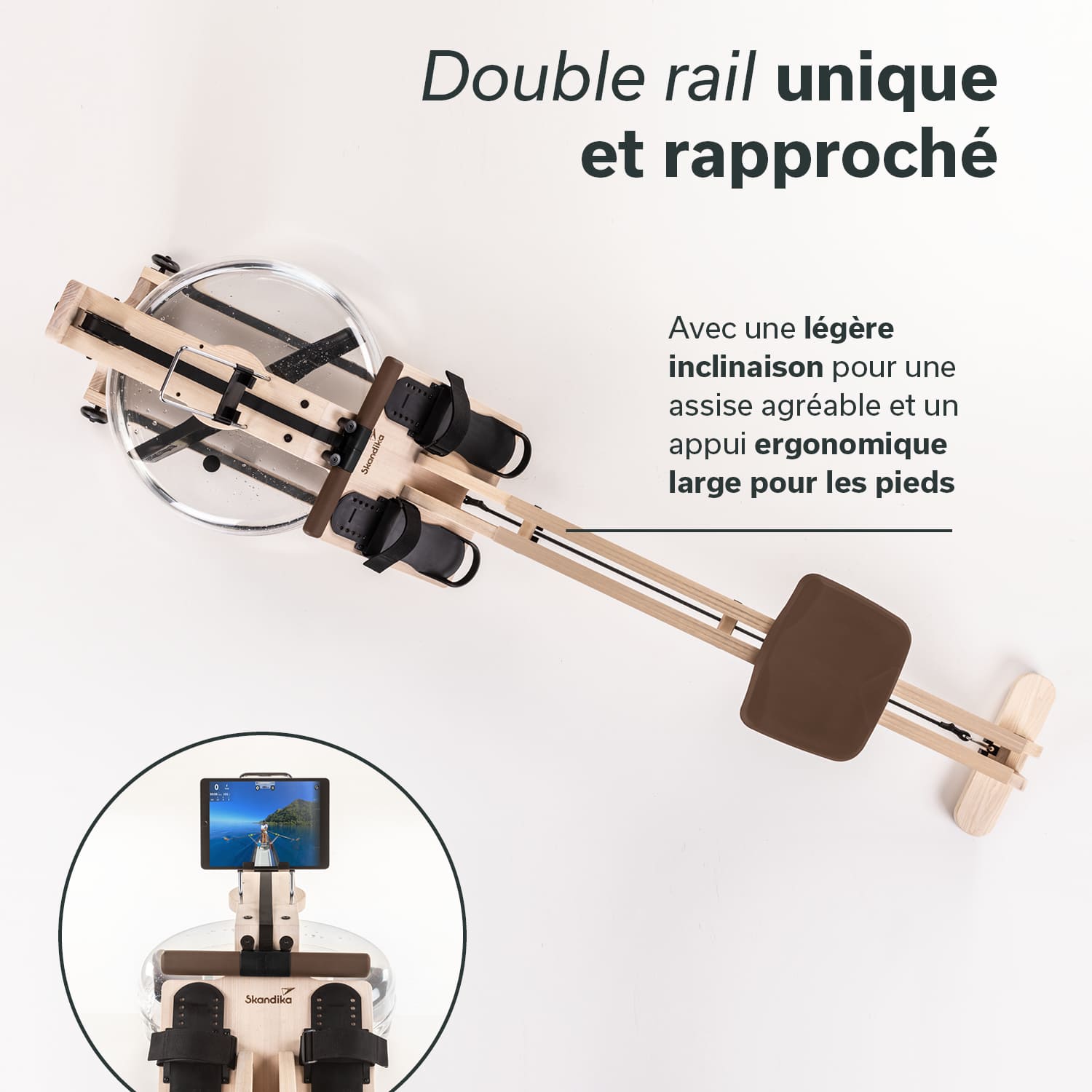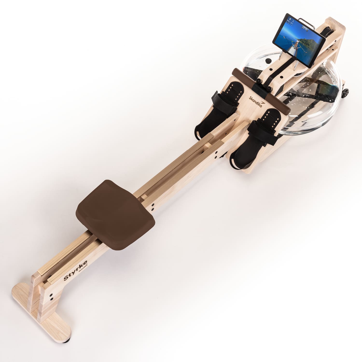 The water-braked pull system with even water noise, the low seating position and our unique double rail with inclination ensure that rowing on the Styrke feels authentic. For those who want to row upstream, need more resistance or are already advanced rowers, a stronger (red marked) pull strap is also included.