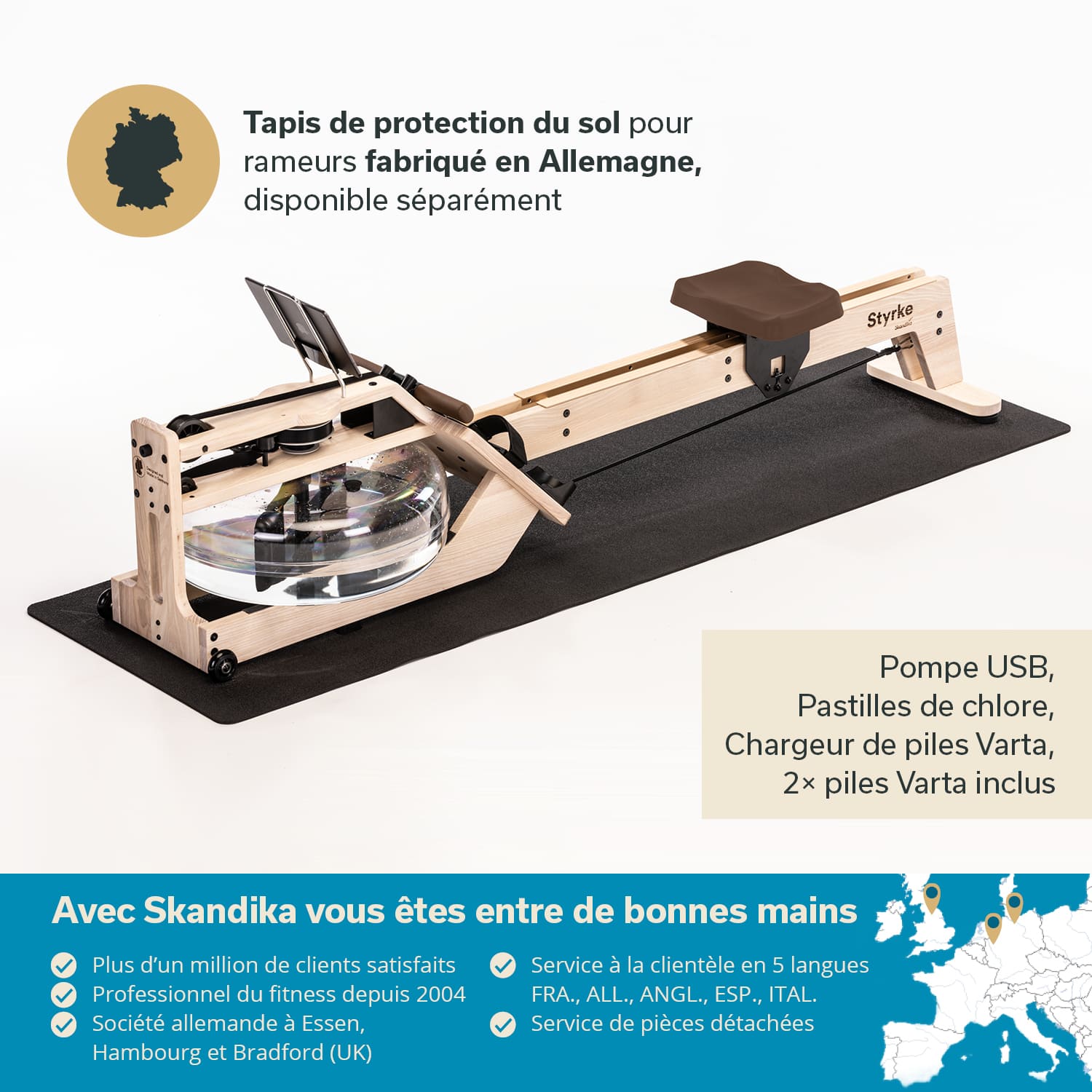 Styrke comes with an electric USB pump and the corresponding Bluetooth receiver. Two AAA Varta rechargeable batteries (incl. Varta quick charger) for the Bluetooth transmitter ensure that Styrke is ready for use immediately after a short set-up time. Detailed instructions are also included in the scope of delivery.
