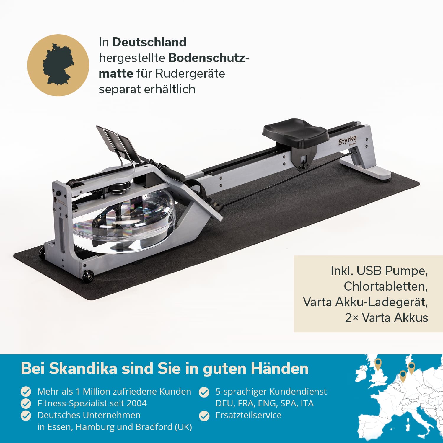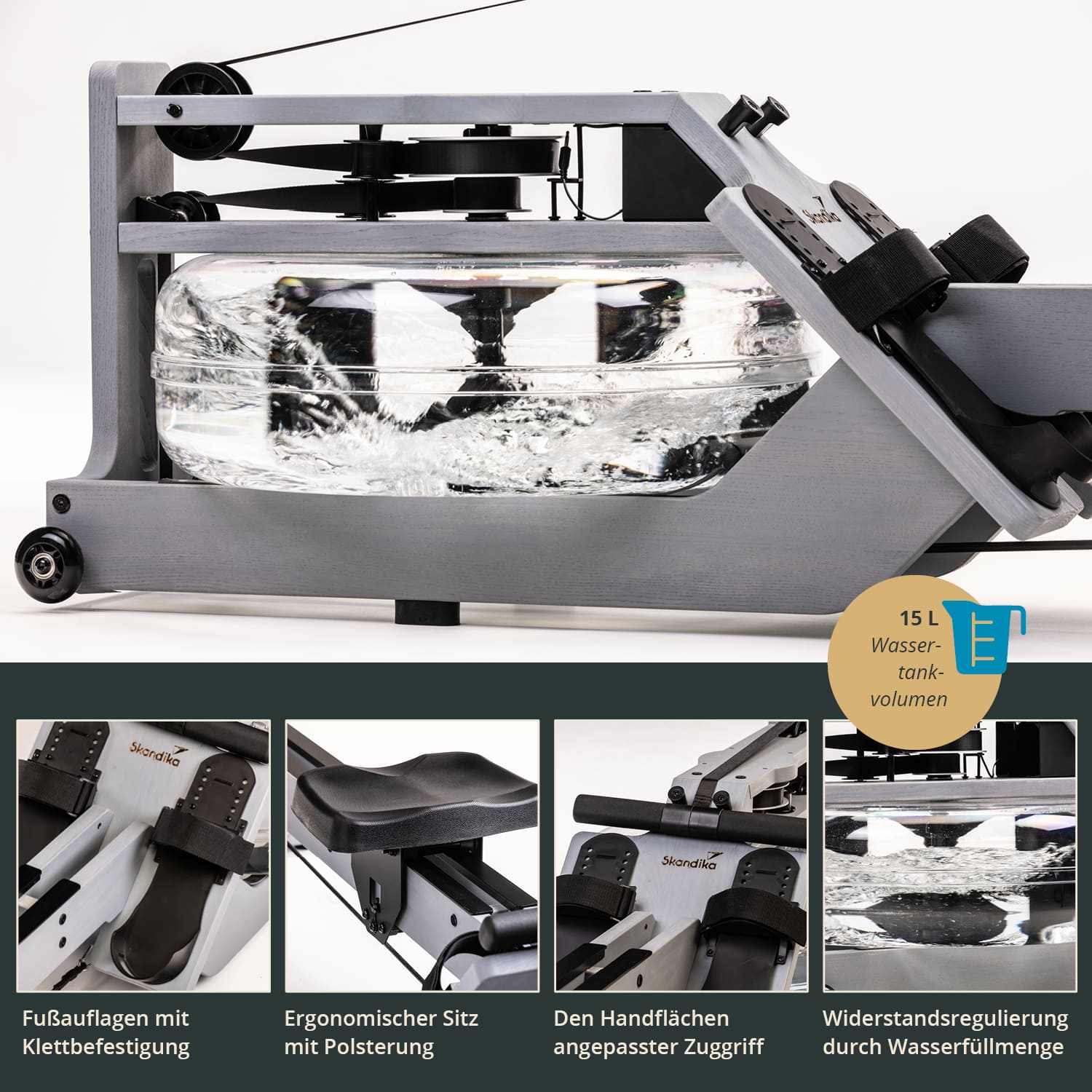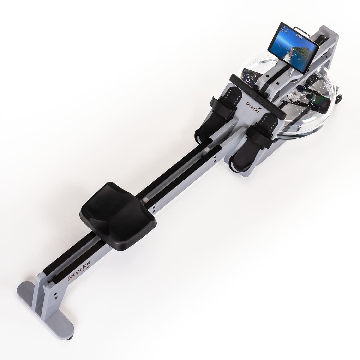 The water-braked pull system with even water noise, the low seating position and our unique double rail with inclination ensure that rowing on the Styrke feels authentic. For those who want to row upstream, need more resistance or are already advanced rowers, a stronger (red marked) pull strap is also included.