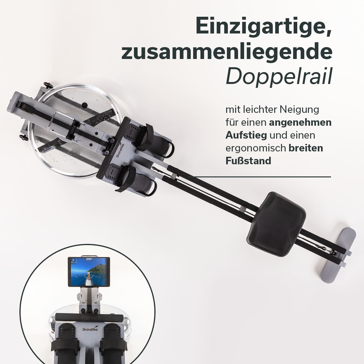 The completely new double rail, which lies together, allows the feet to stand as wide as the pelvis. The result: ergonomically correct movement sequences for pain-free completion of long and intensive sessions. Matching this: an ergonomically shaped, padded seat and the rowing handle with anti-slip coating, which is moulded to fit the palms of the hands.