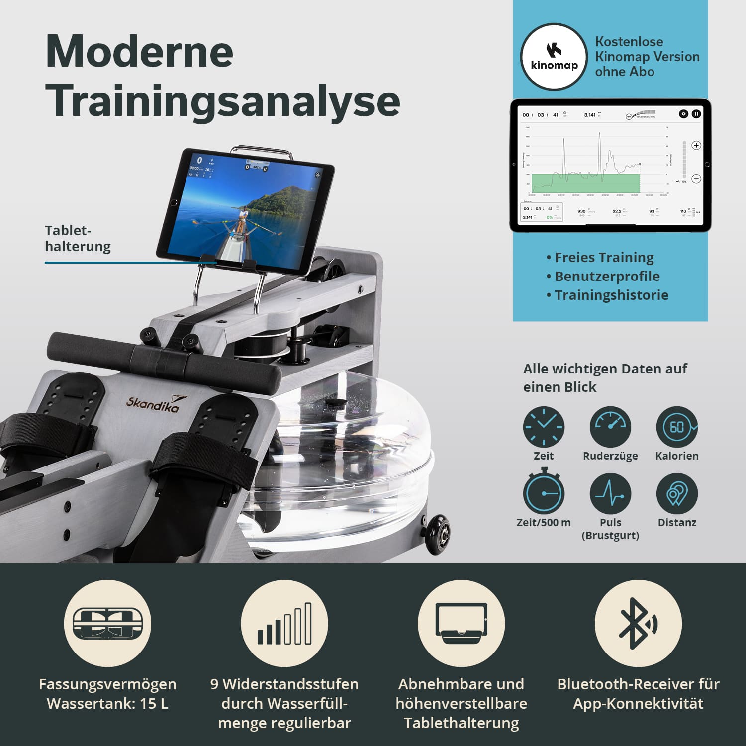 The free Skandika Training Data app for iOS and Android transforms your smartphone or tablet into an exclusive training computer. The intuitive app shows all relevant data such as time, time/500 m, distance, rowing strokes, rowing strokes/min and speed at a glance.