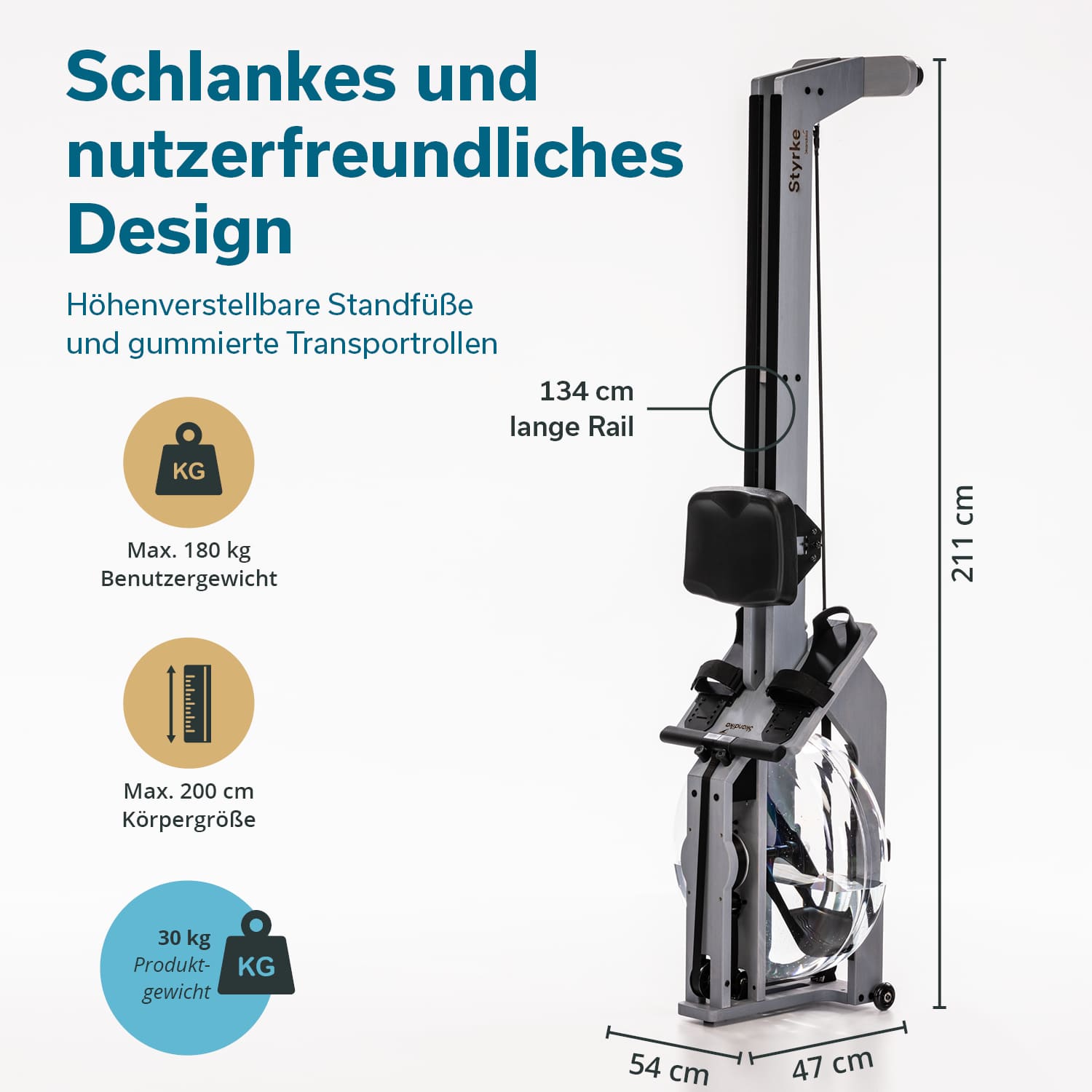 Thanks to the integrated transport rollers, Styrke can be stowed away after your workout in just a few simple steps. The centre of gravity on the water tank and the rounded design of the rear hand supports ensure that the solid rowing machine is easy to set up and can be stored in a particularly space-saving manner.