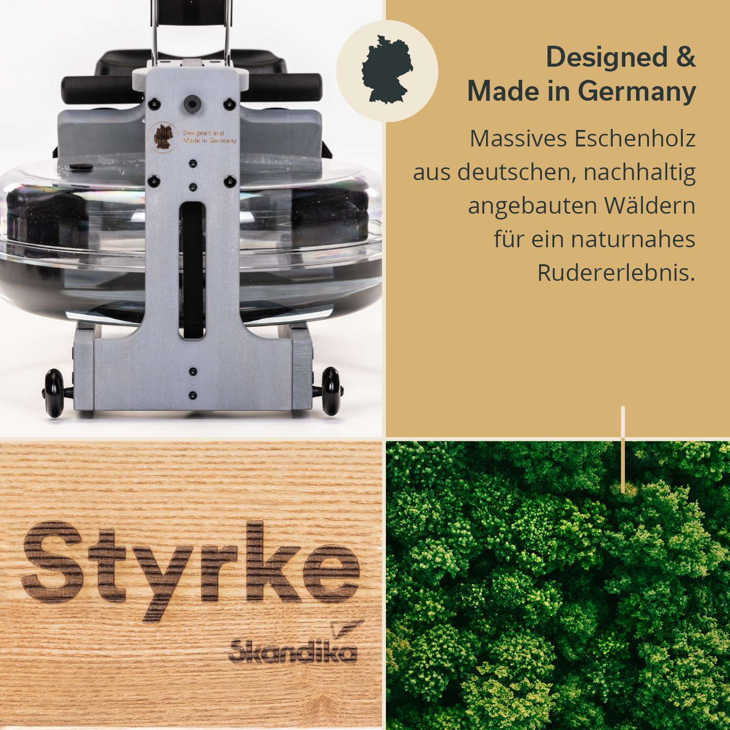 The latest generation of our premium Styrke rowing machine made of solid ash now not only combines stylish design with professional standards of ergonomics, aesthetics and performance, but also raises quality and standards to an even higher level with its "Made in Germany" title. In addition, sustainable, German forests and low-waste, local processing bring awareness of our environment to the fore. The result: a maximally authentic rowing experience in symbiosis with German craftsmanship and a love for our planet.