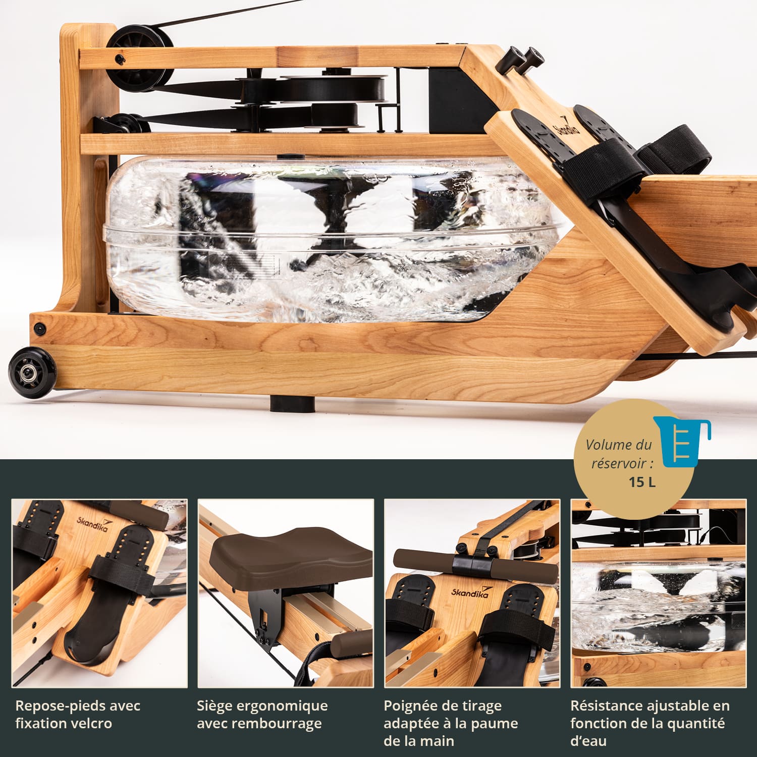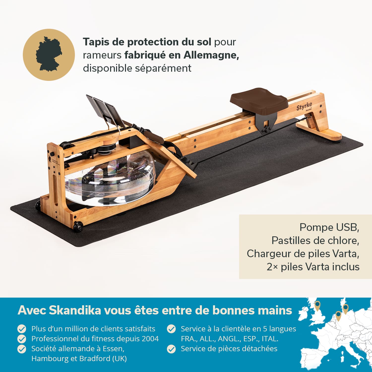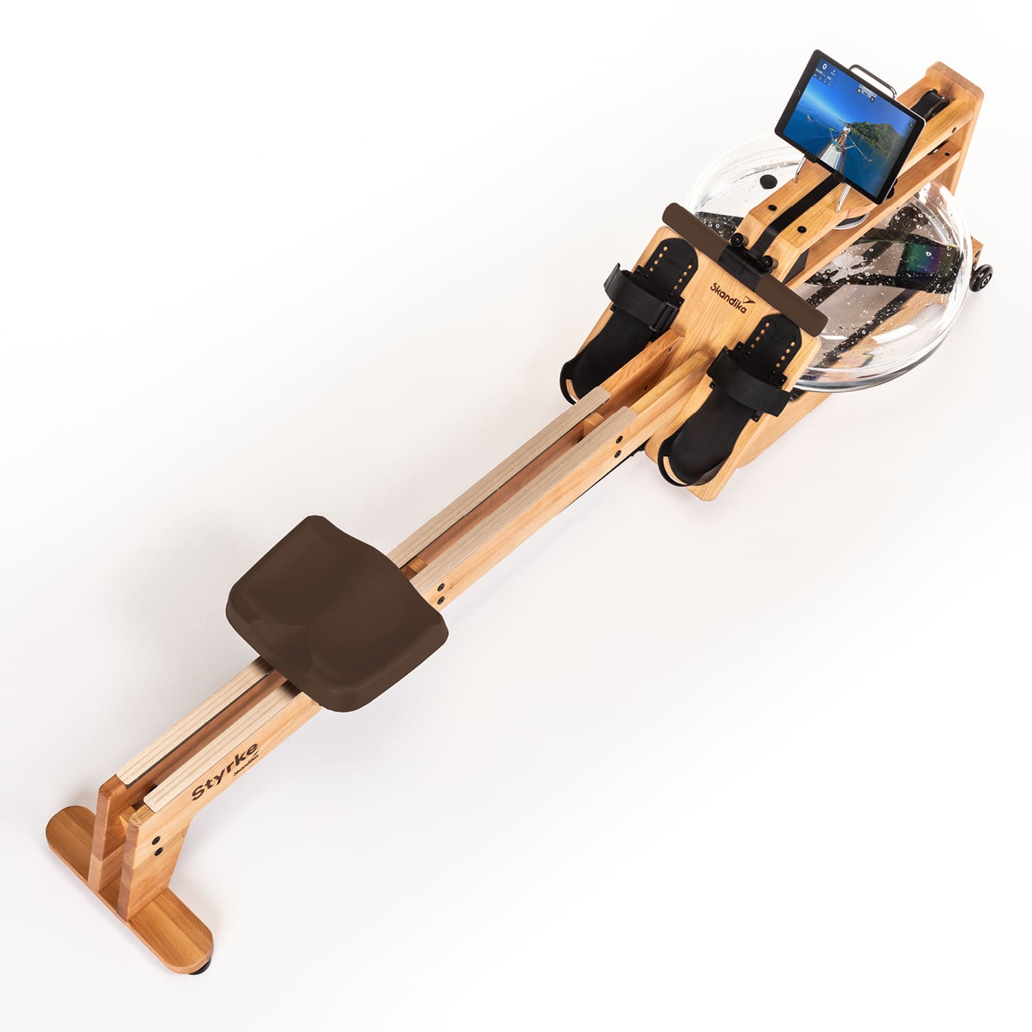 The water-braked pull system with even water noise, the low seating position and our unique double rail with inclination ensure that rowing on the Styrke feels authentic. For those who want to row upstream, need more resistance or are already advanced rowers, a stronger (red marked) pull strap is also included.