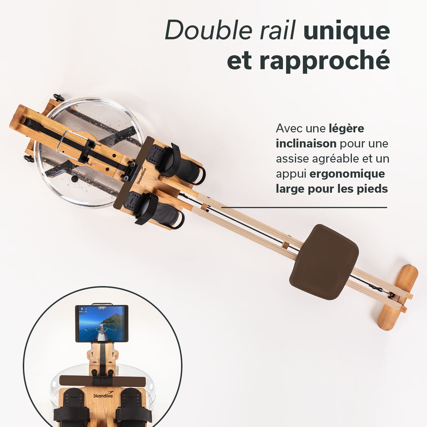The completely new double rail, which lies together, allows the feet to stand as wide as the pelvis. The result: ergonomically correct movement sequences for pain-free completion of long and intensive sessions. Matching this: an ergonomically shaped, padded seat and the rowing handle with anti-slip coating, which is moulded to fit the palms of the hands.