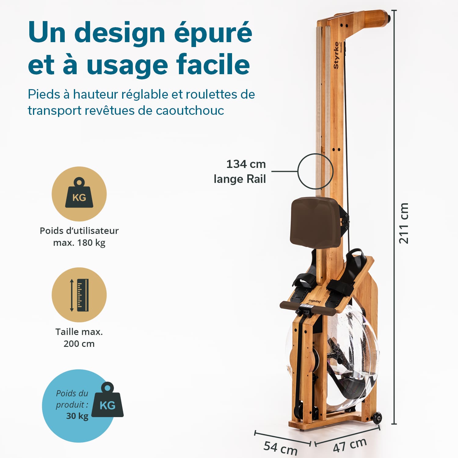 Thanks to the integrated transport rollers, Styrke can be stowed away after your workout in just a few simple steps. The centre of gravity on the water tank and the rounded design of the rear hand supports ensure that the solid rowing machine is easy to set up and can be stored in a particularly space-saving manner.