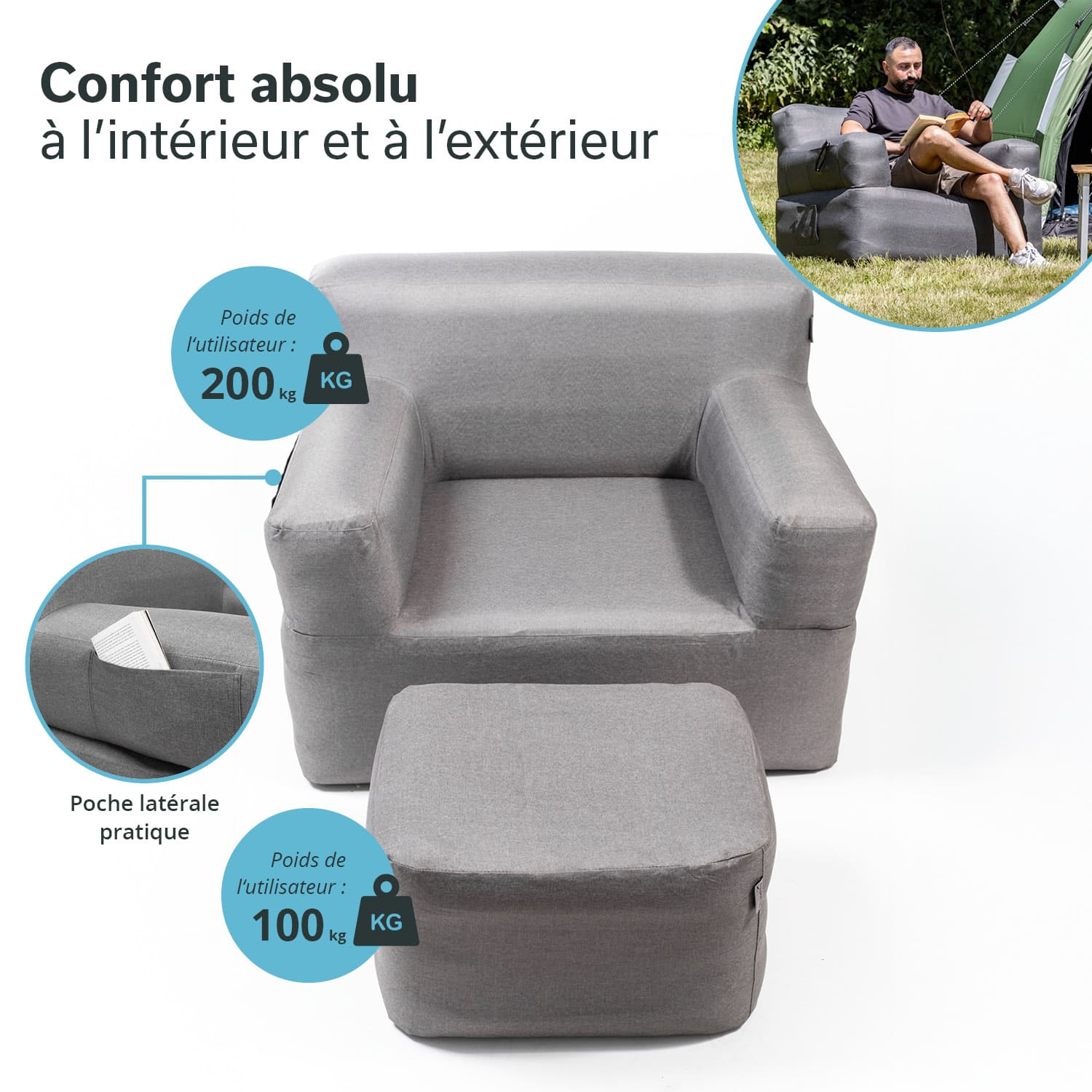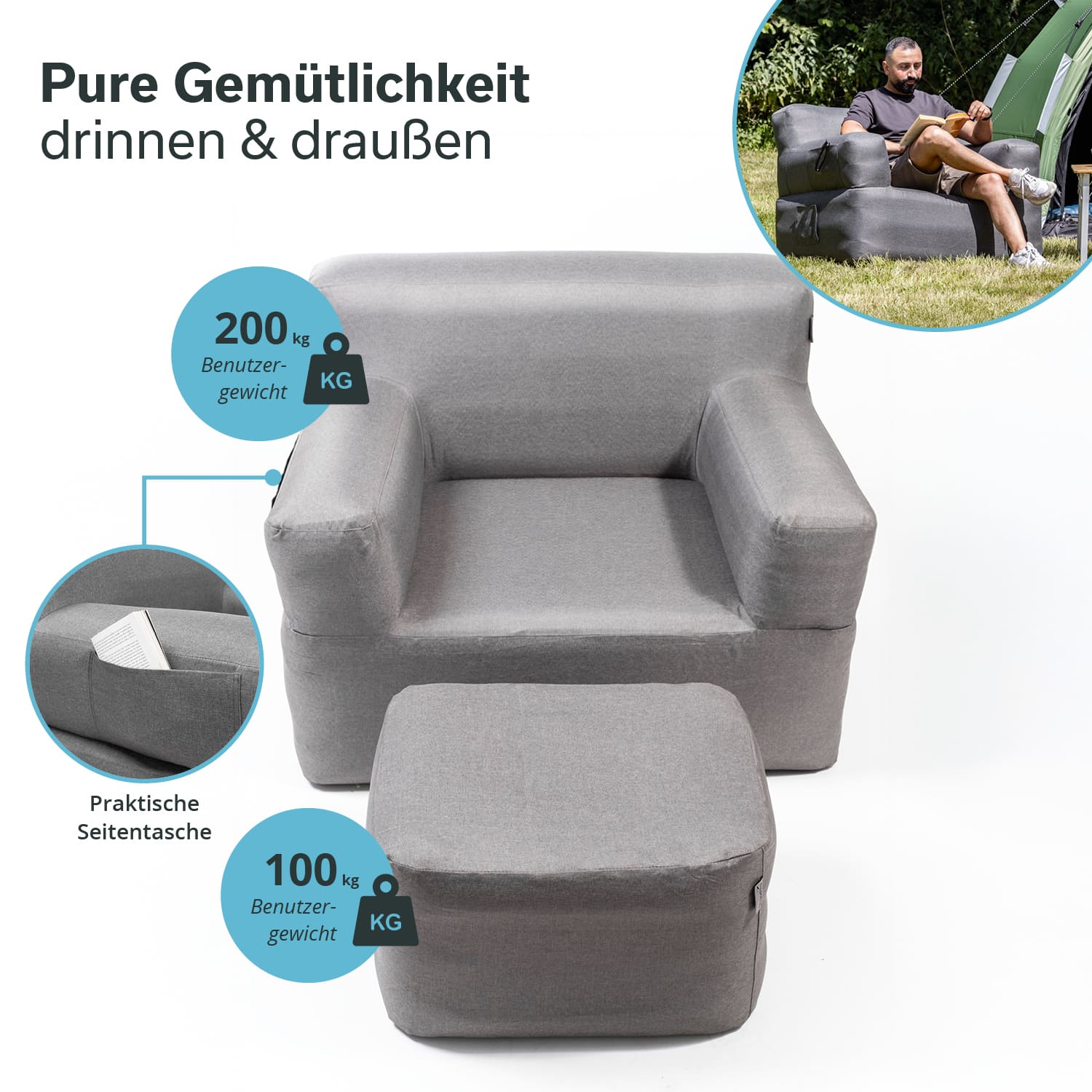 Die Produkte unserer Easy Air Premium Luftmöbelserie vereinen Behaglichkeit, Funktionalität und Stil und sind die idealen Begleiter für Outdoor-Abenteuer, entspannte Stunden im Garten oder gemütliche Abende auf dem Balkon. In diesem Produktpaket sind direkt alle drei Einzelartikel der Serie jeweils einmal enthalten: das Luftsofa, Doppel-Luftsofa und der Lufthocker. Ein unschlagbares Team für bequemes Sitzen und Entspannen zu Hause und auf dem Campingplatz.