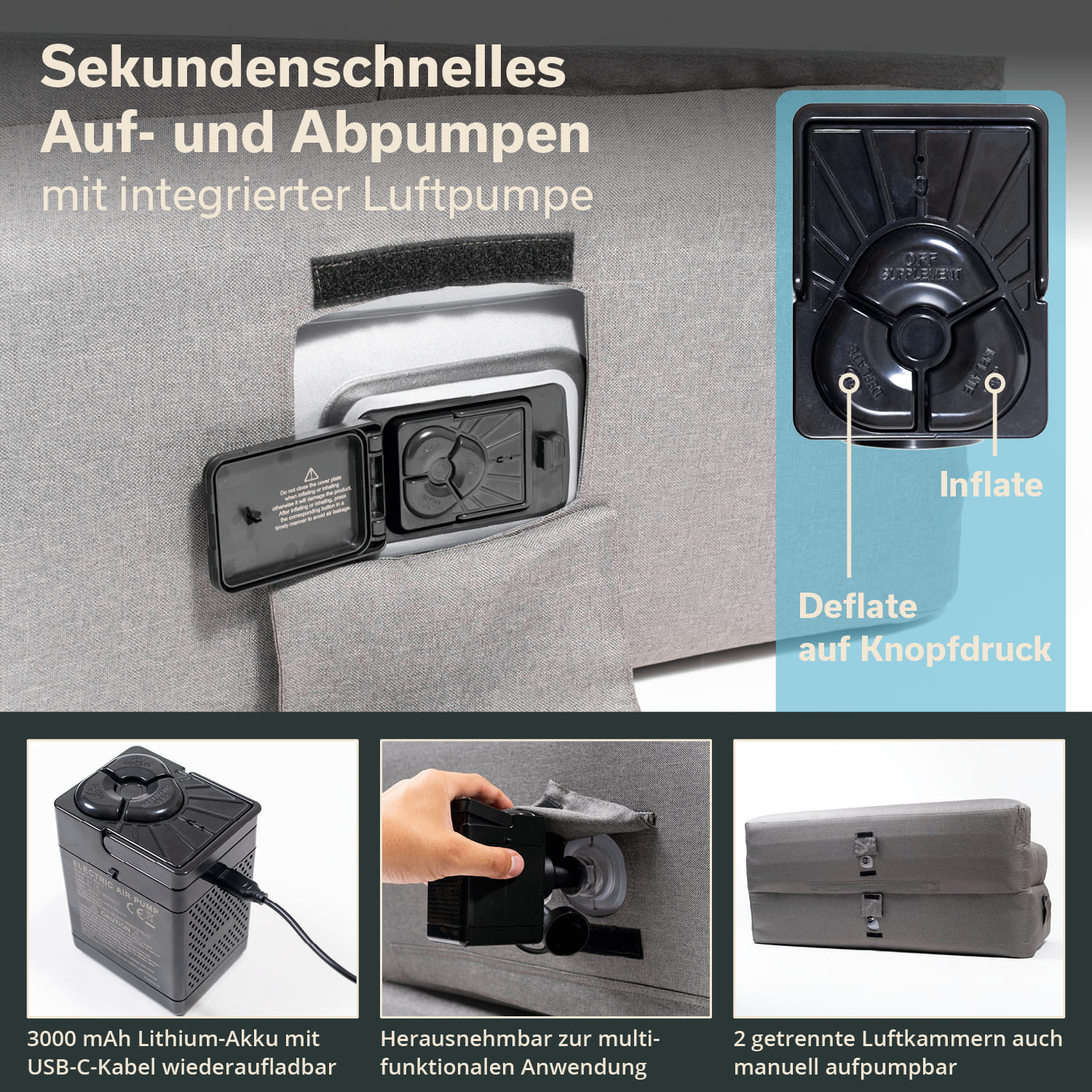 - Kinderleicht: auf Knopfdruck blitzschnell aufgepumpt und auch wieder entleert