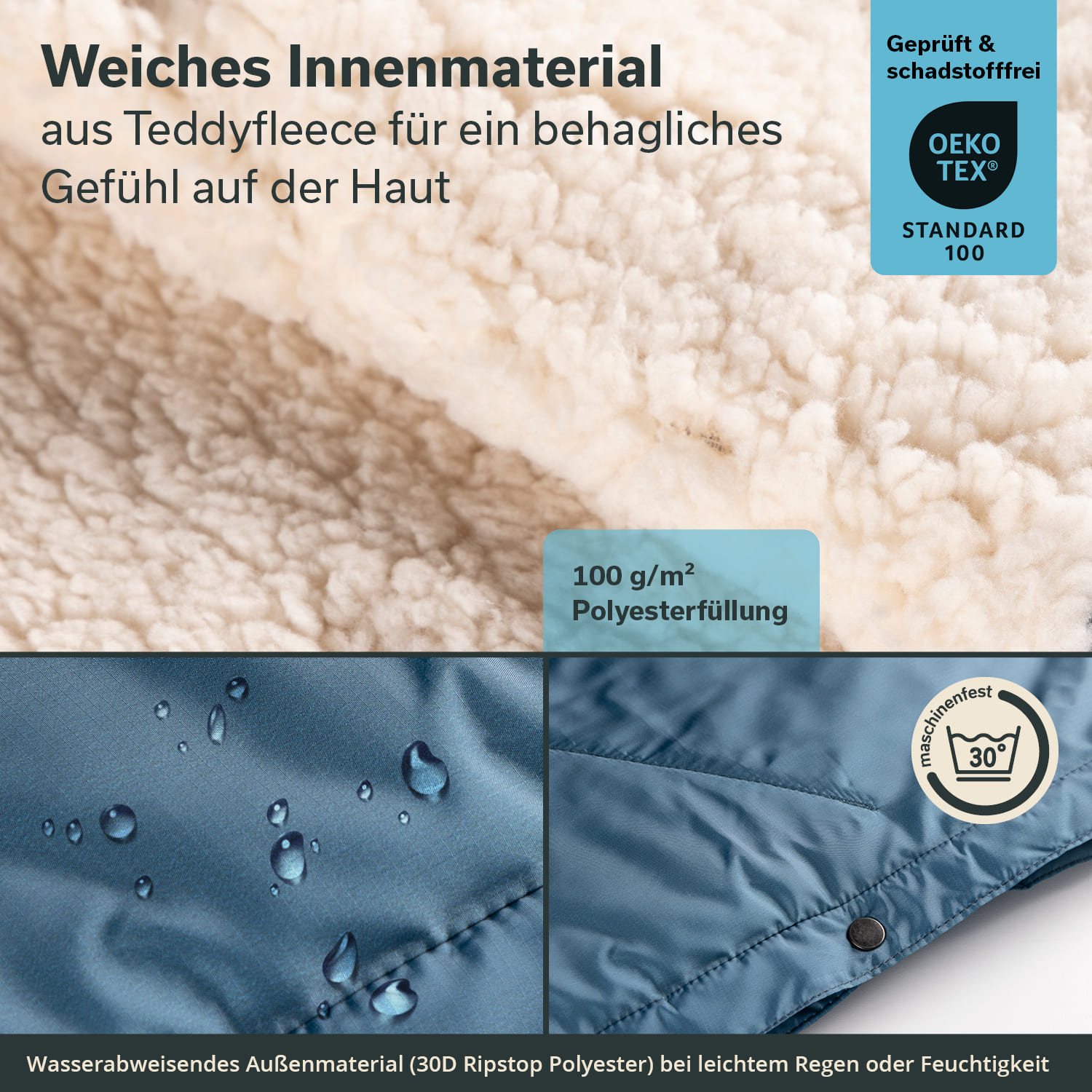 - Oeko-Tex® Standard 100 / maschinenwaschbar (30 °C) / rostfreie Druckknöpfe