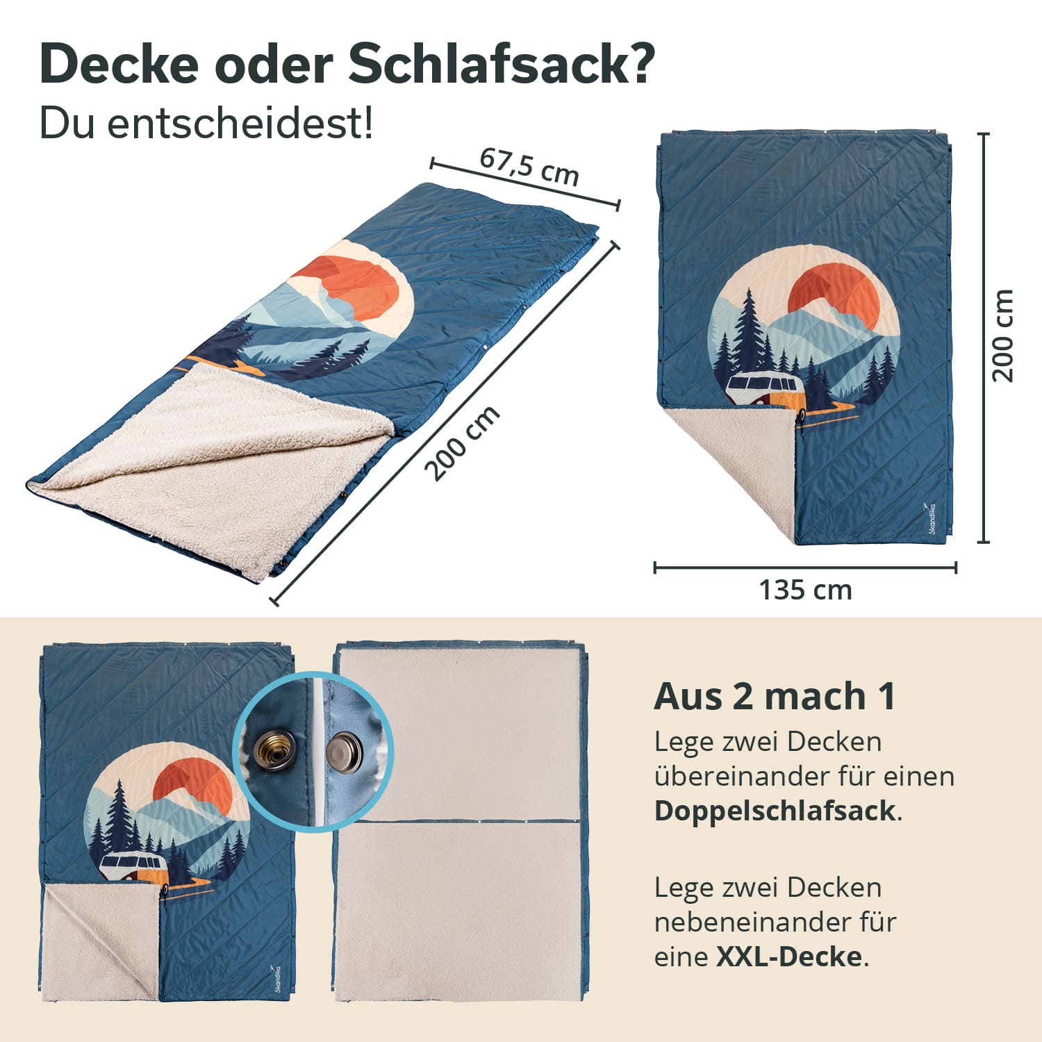 - 2 Decken übereinander geknöpft für einen gemütlichen Doppelschlafsack für 2 Personen