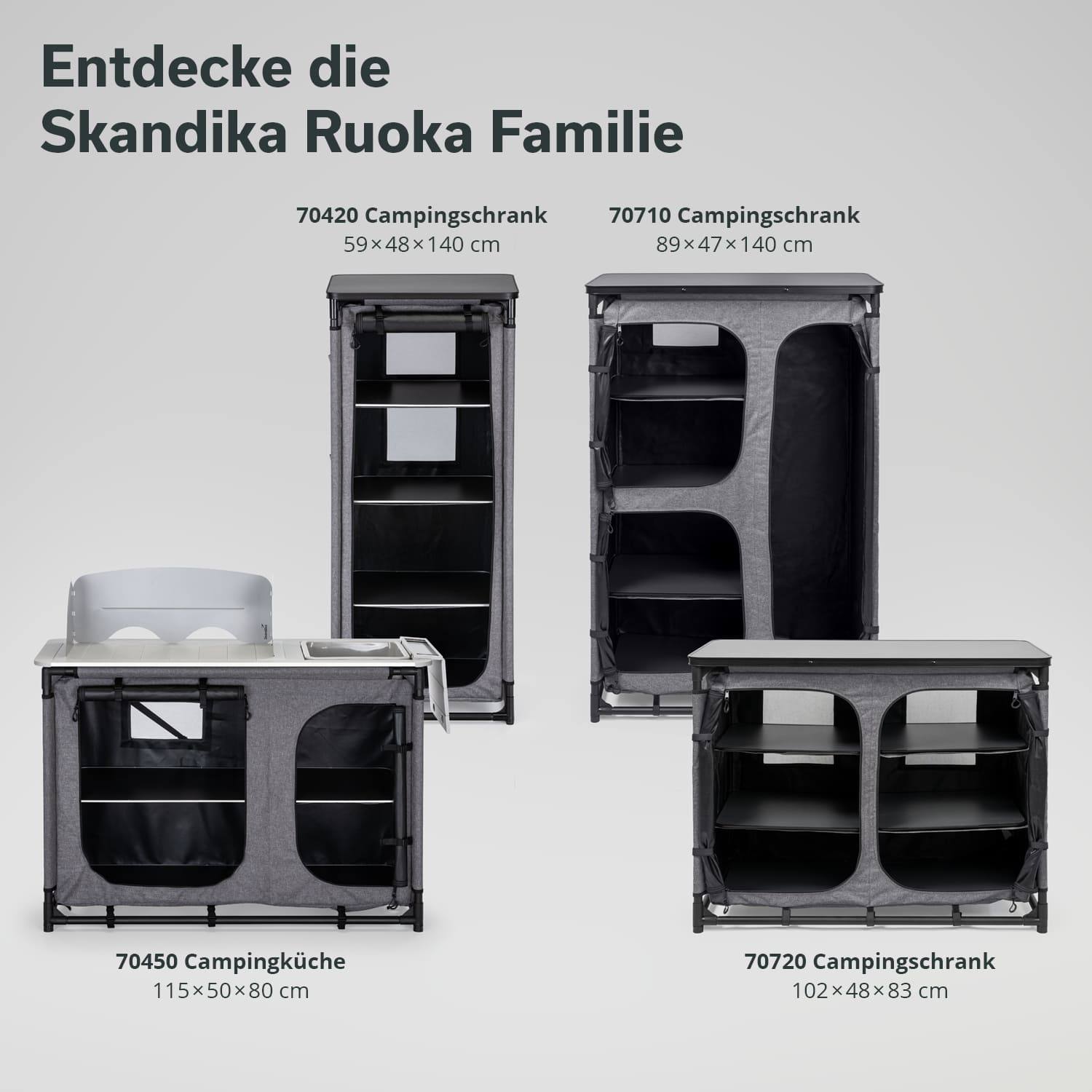 Als Neuzugang der Skandika-Ruoka-Familie bietet dieser Campingschrank im Turmdesign als praktischer Kleiderschrank besonders viel Stauraum und belegt dabei nur wenig Bodenfläche im Zelt. Er ist die ideale Lösung, wenn Platz und Bewegungsfreiheit hoch auf der Prioritätenliste stehen, aber gleichzeitig Ordnung erwünscht ist. Mit seinem schicken Aussehen macht Ruoka sogar zu Hause als Pop-Up-Kleiderschrank im Gästezimmer oder als Garderobenschrank im Flur eine gute Figur.