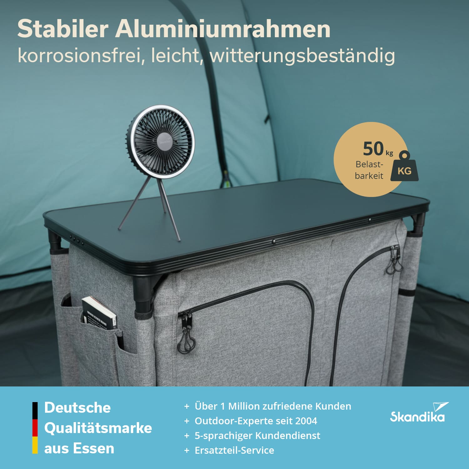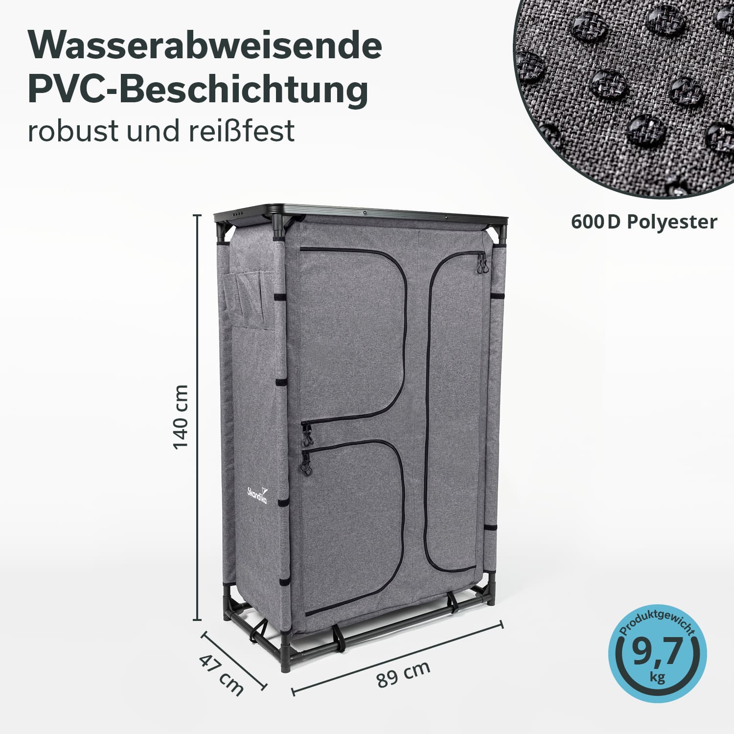 Mit einer Gesamttraglast von 50 kg ist der Campingschrank bestens geeignet, um Kleidung, Ausrüstung und Zubehör sicher zu verstauen.