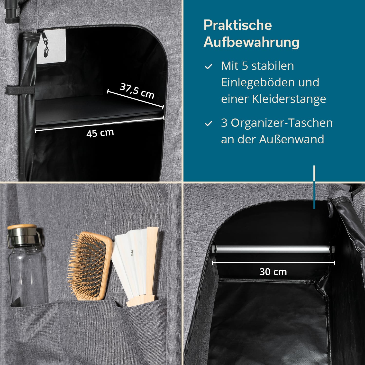 - Links mit 4 großen Staufächern, rechts mit einer praktischen Kleiderstange versehen