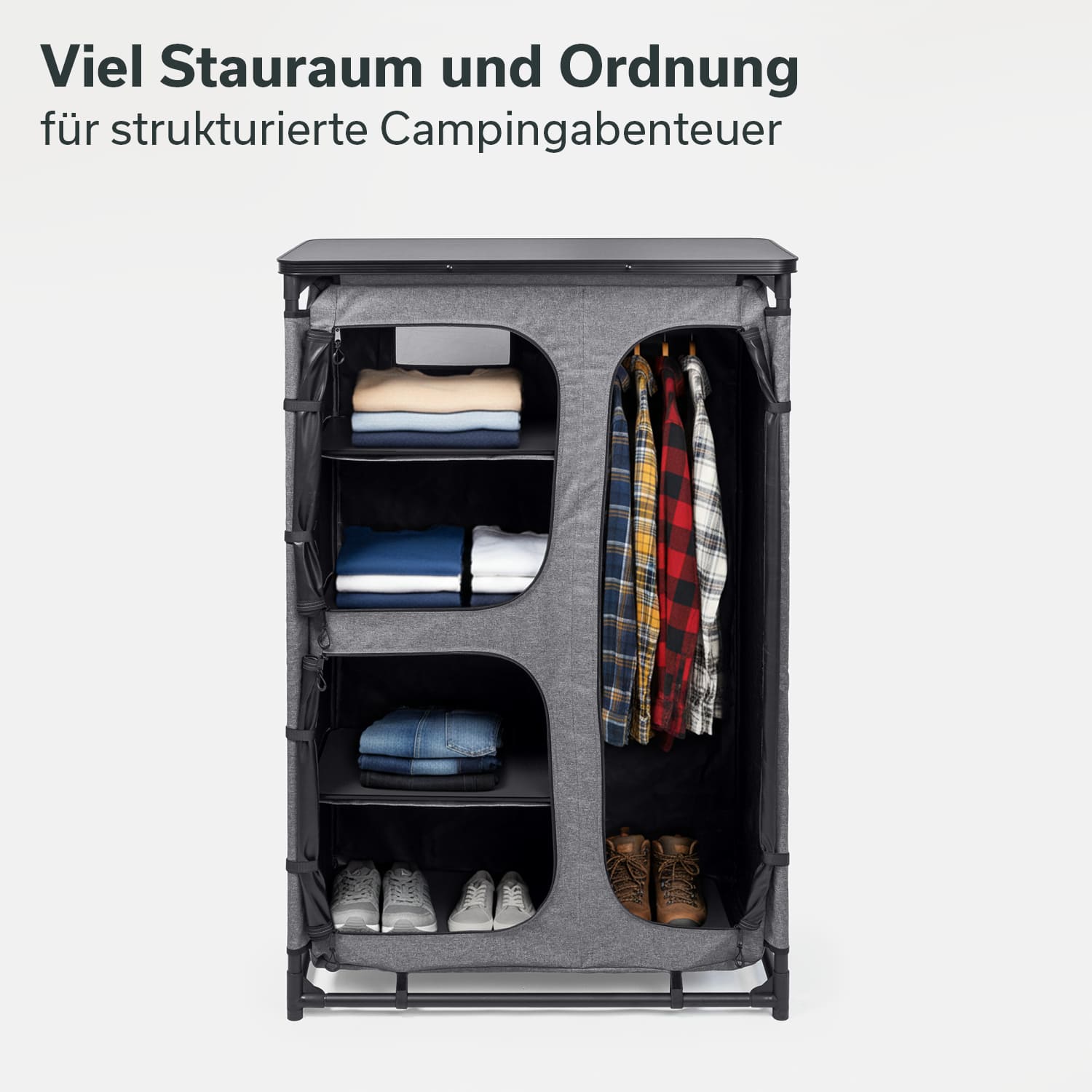 Vier stabile Regalfächer auf der linken Seite und ein Bereich mit Kleiderstange auf der rechten Seite schaffen eine flexible Aufteilung für Kleidung und Campingutensilien.