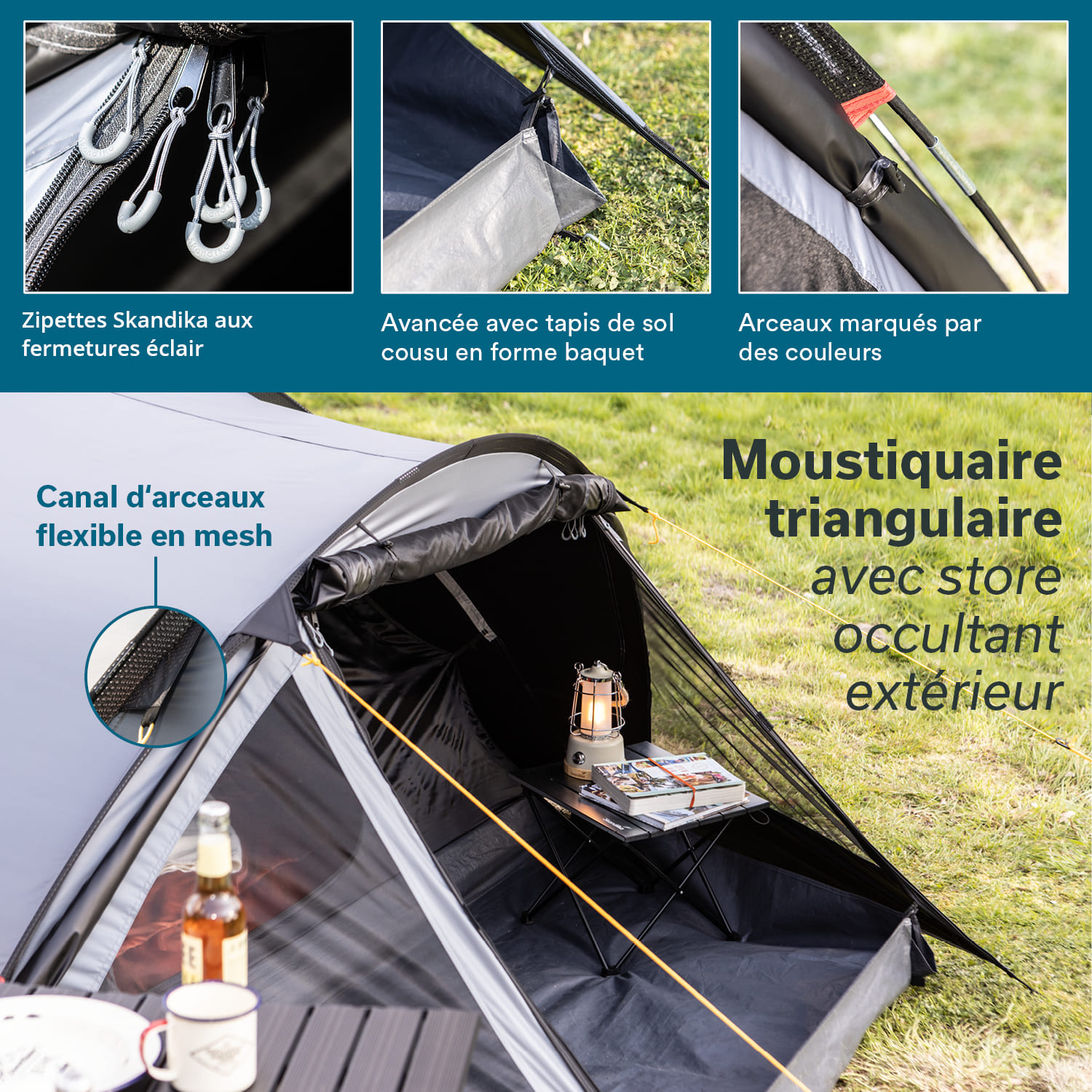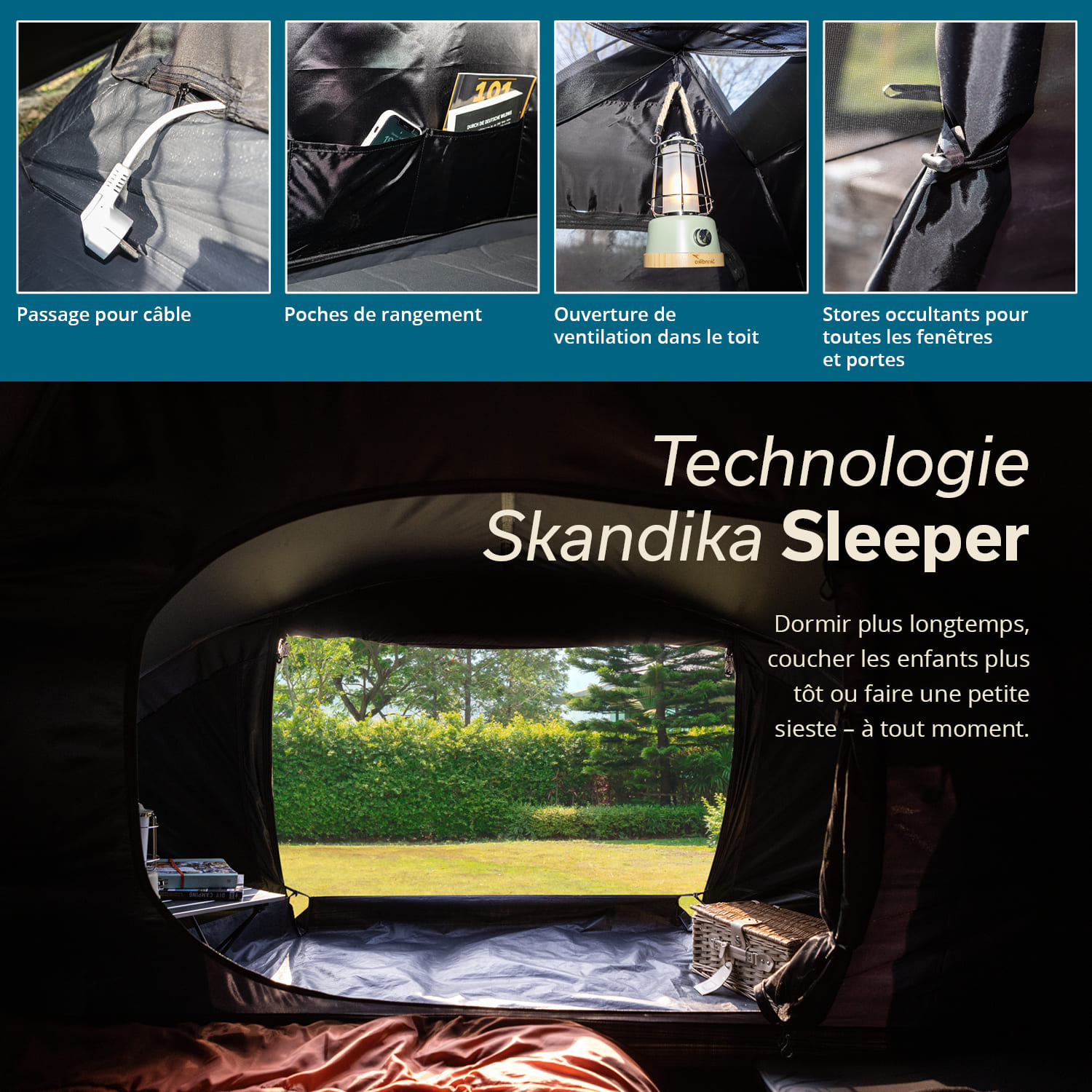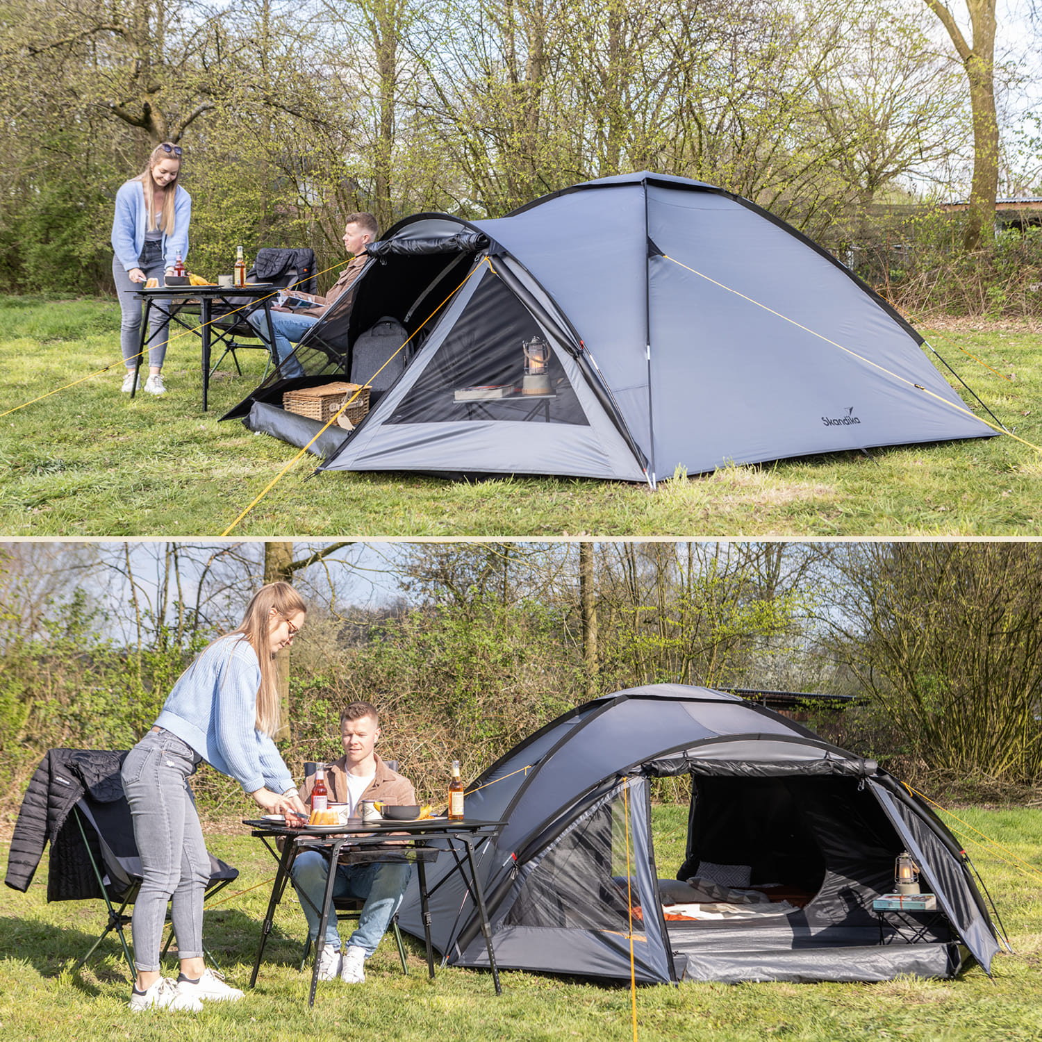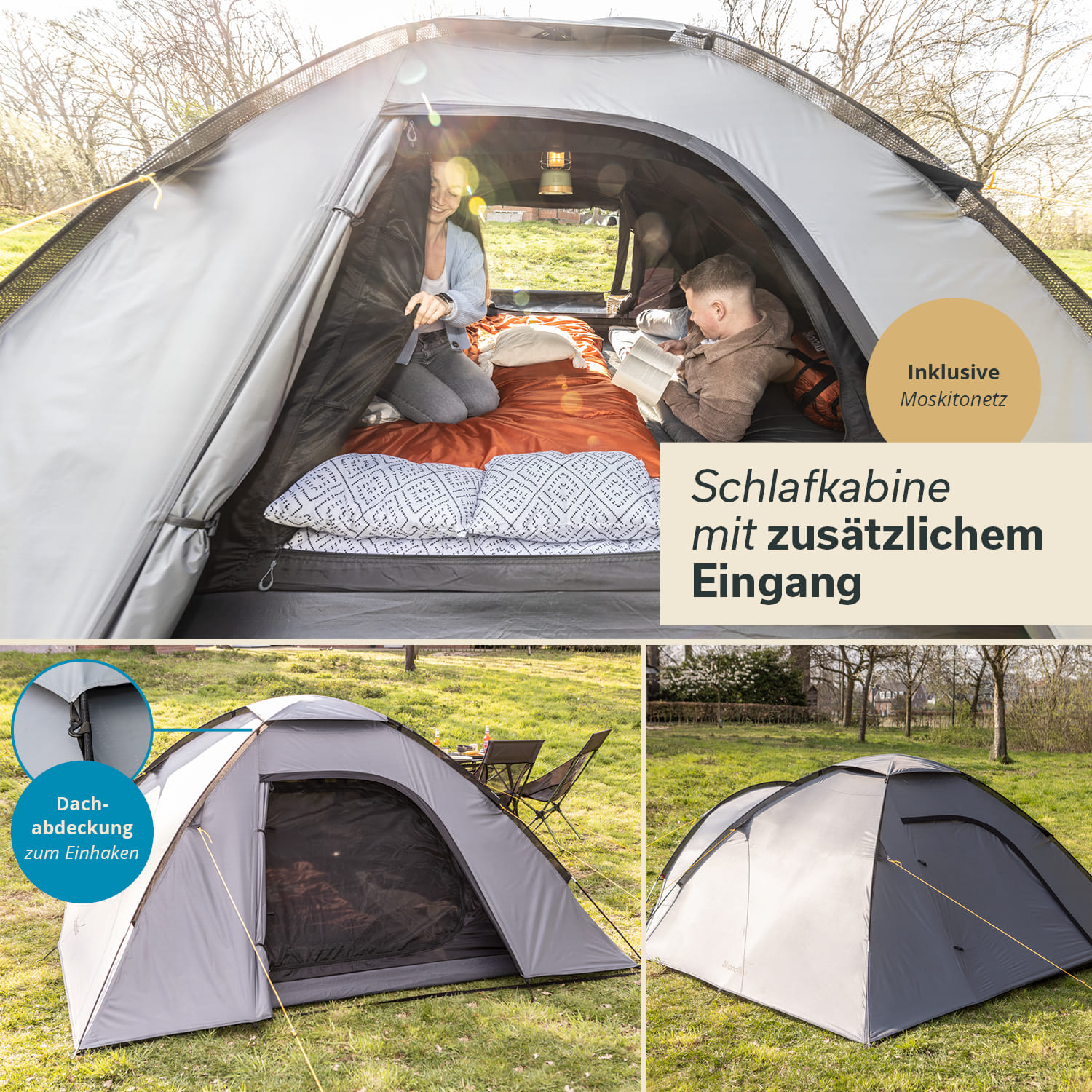 Igloo tents are particularly popular for outdoor adventures of all kinds, because the dome shape makes pitching child's play and helps to ensure that the tents are particularly stable. However, our smart Skandika Dale dome tents have much more to offer! They are super well thought-out and perfectly equipped for the best protection against wind and rain as well as strong sunlight. The compact tent offers plenty of space for up to 3 people in the sleeping cabin and additional storage space in the weatherproof vestibule. Two entrances give more flexibility, with the rear entrance allowing direct access to the sleeping cabin without having to go through the vestibule first. In this version of our Dale tent with Skandika Sleeper technology, the cabin is black and a special coating has been applied to the flysheet which absorbs almost 100% of the sunlight. Want to sleep in longer or take a nap at lunchtime? Everything is possible in the completely dark sleeping cabin thanks to our Skandika Sleeper technology in the Dale 3 Sleeper! If complete darkness is not required, the cabin can also be closed with just a mosquito net for more flexibility, so that fresh air can circulate and it is not quite so dark. The vestibule of the new Dale has been particularly well designed, because it is more flexible and comfortable than ever before! A weatherproof groundsheet is sewn to the cabin and is attached to the sides of the flysheet with toggles and loops - no more slipping! The floor is tub-shaped with high sides and helps enormously to keep moisture and creepy-crawlies out of the tent - luggage and shoes remain well protected and dry. Particularly clever: the side of the floor can be folded down near the entrance door to make it easier to get in. The front door is another highlight. It can be opened completely and rolled upwards. If desired, an inner door made of mosquito net can be closed at the same time, allowing air in but keeping insects out. If the weather turns bad, the door can be closed completely weatherproof. It consists of a large foil window to let in plenty of daylight even on grey days, but can be darkened to make it opaque if required. So, whatever the weather and no matter how much light and visibility you need - the front door of the Dale can do it all! To the side of the entrance door are triangular windows made of mosquito net, which can also be darkened and closed with weatherproof zips. The Dale 3 Sleeper scores points for high temperatures and intense sunlight with a UV protection factor of 50+. This special treatment of the fabric prevents the flysheet from becoming brittle or cracked and contributes significantly to the longevity of the tent. Another major advantage: the tent does not heat up so quickly in the sun and a pleasant inner tent climate is favoured. A variety of clever extras make the igloo tent extremely practical and increase comfort. Colour-coded poles make pitching easier and the wind-permeable pole channels made of elastic fabric ensure increased tear resistance. In the cabin there is a hook for a lamp and organiser pockets for mobile phones and the like, and a cable feed-through provides the necessary power supply from outside. The dome tent is supplied in a robust carry bag for dust-free storage and easy transport. Compact, lightweight, spacious, practical and comfortable, our Dale 3 Sleeper is the perfect tent for the campsite, festival site or simply your own garden.