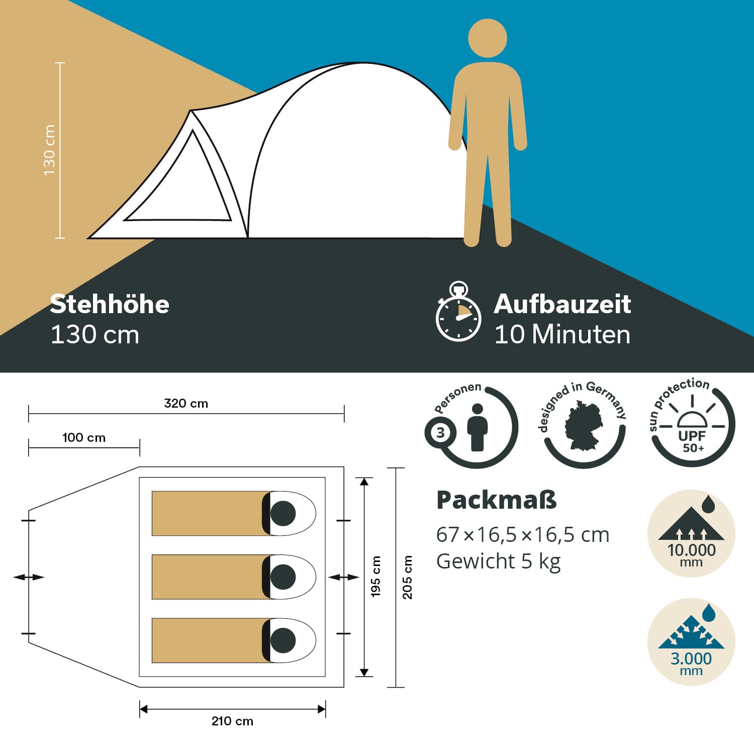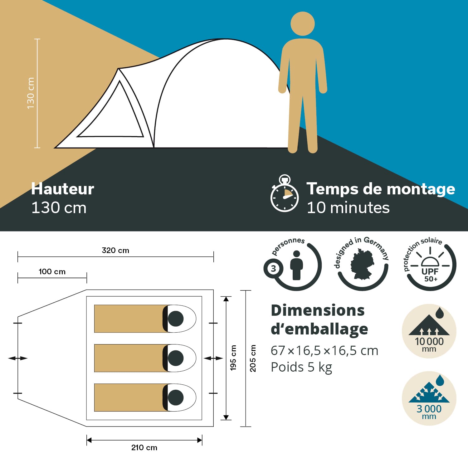 - Water column (flysheet): 3,000 mm