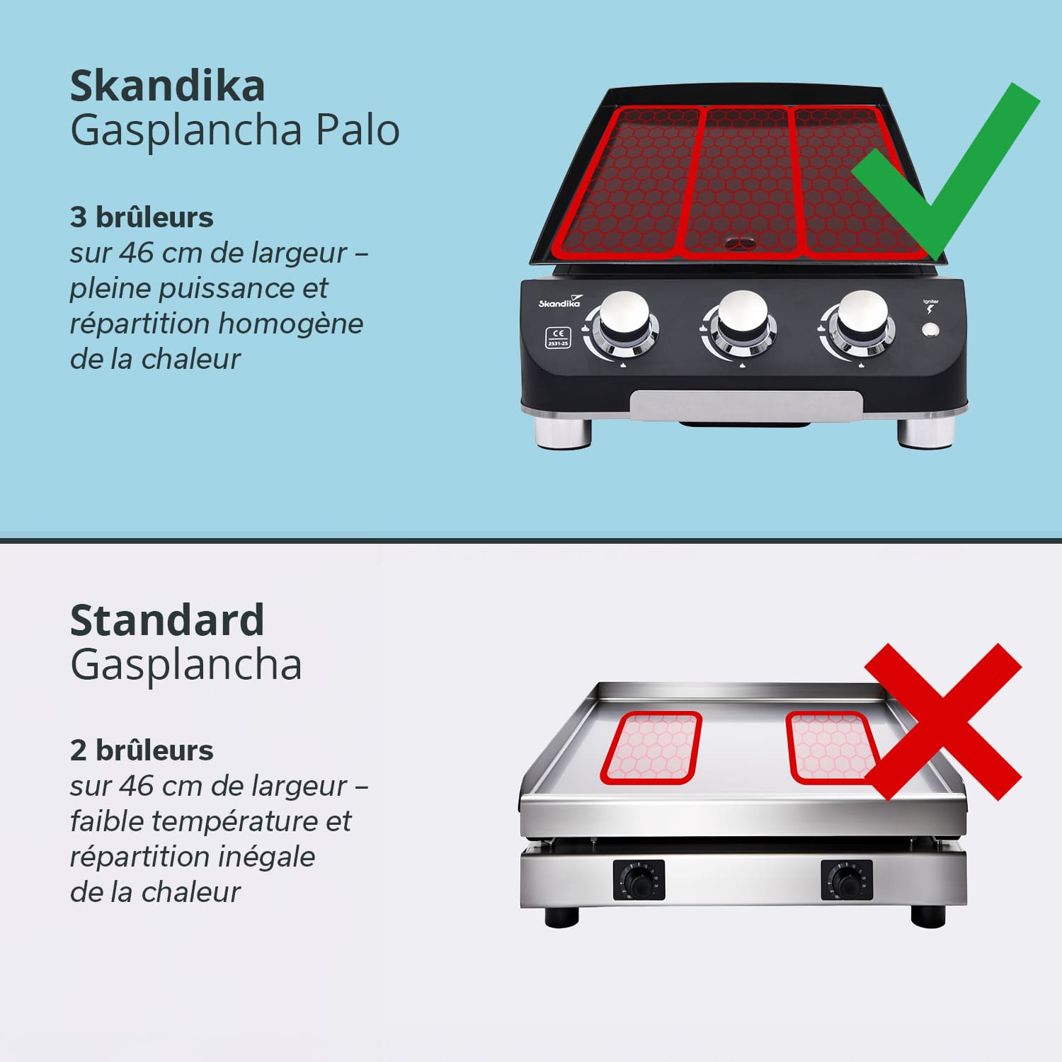 - Separat gesteuerte Brenner ermöglichen unterschiedliche Hitzezonen auf der Plancha-Platte