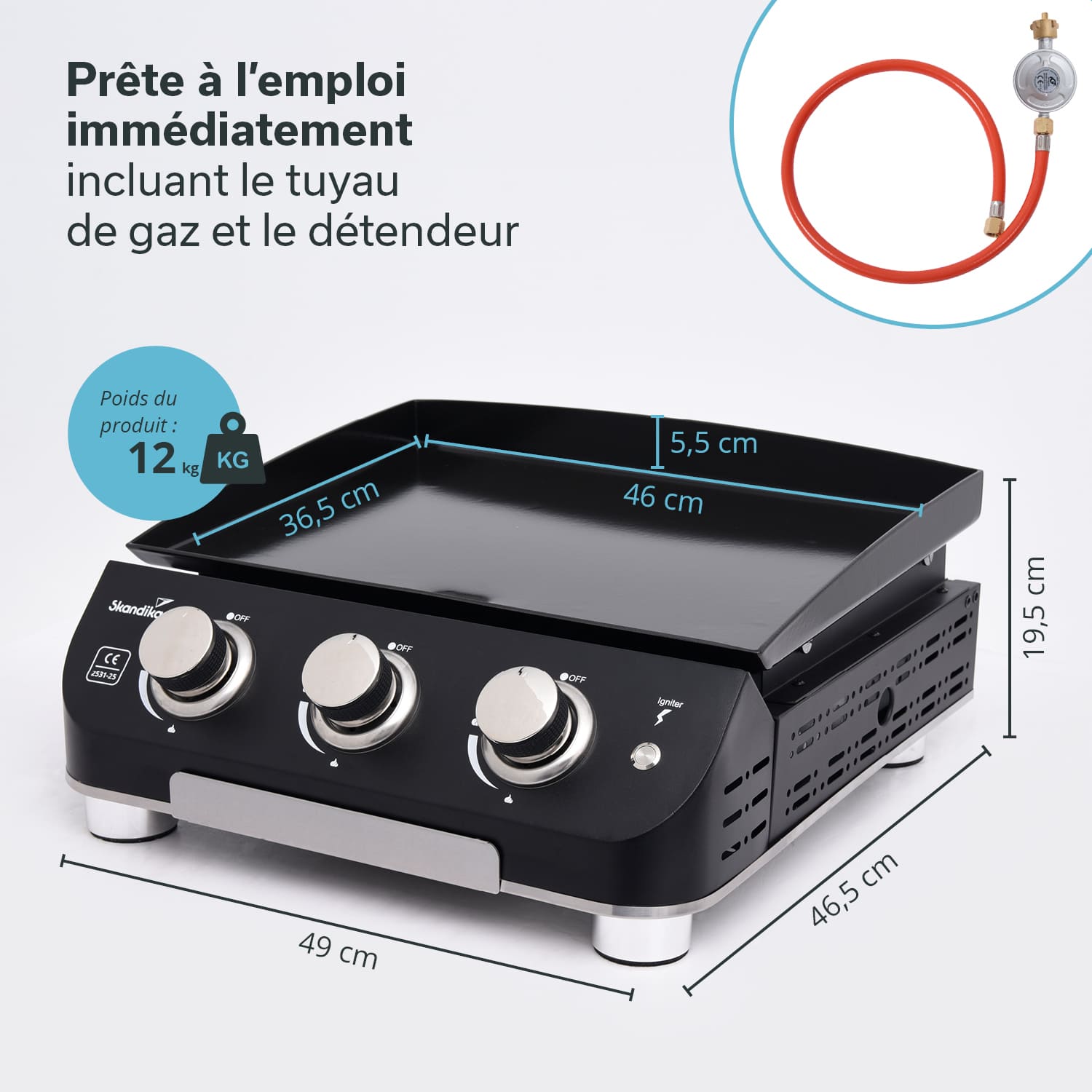 Die Plancha ist mit einer handelsüblichen I3B/P (50) Gasflasche kompatibel (nicht im Lieferumfang enthalten) und ein passender Gasschlauch mit Regler wird direkt mitgeliefert. Höhenverstellbare Füße sorgen für einen sicheren Stand während des Kochvorgangs und seitliche Belüftungsöffnungen dienen als Überhitzungsschutz.
