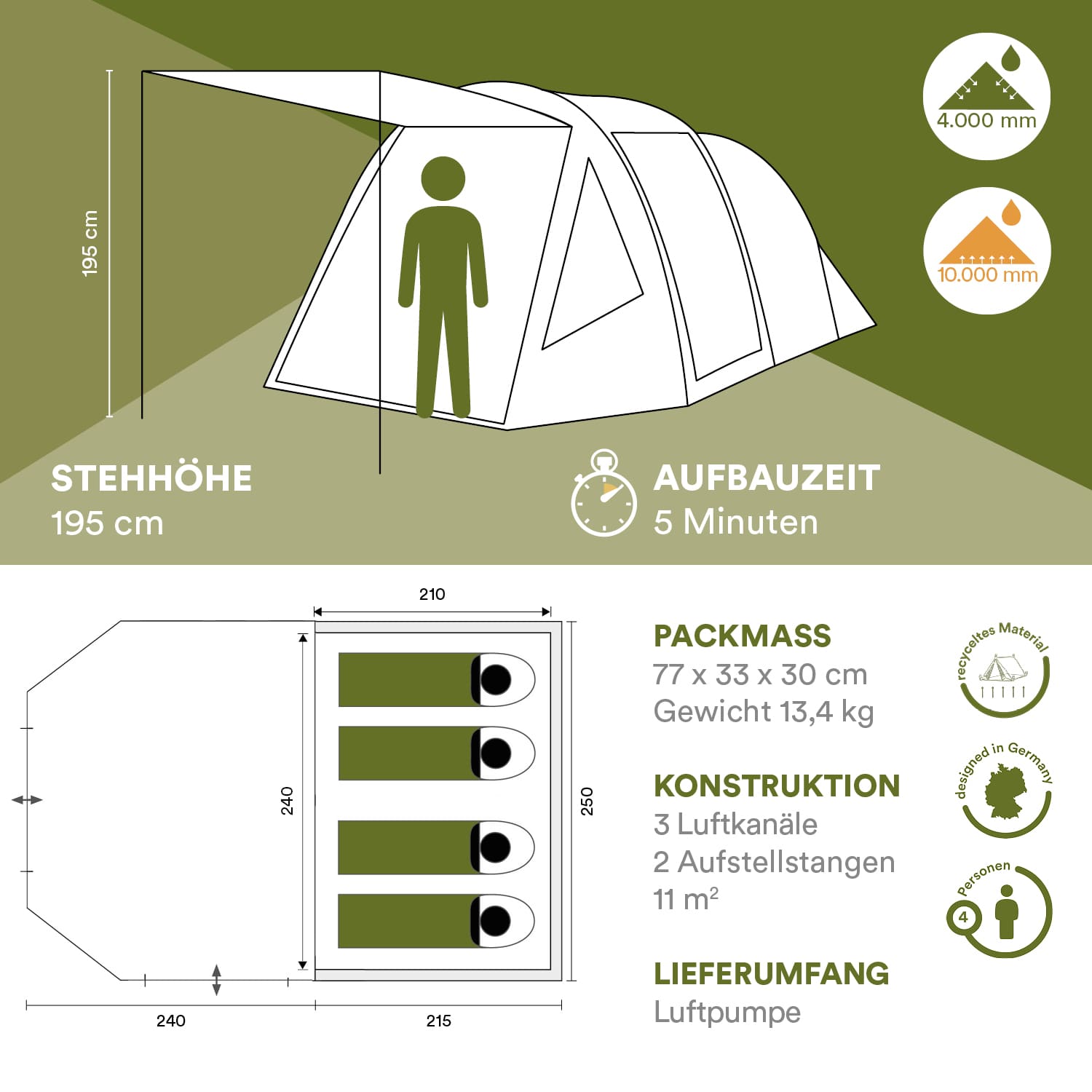- Stylish air tent for up to 4 people - perfect for the campsite, your own garden or the festival site