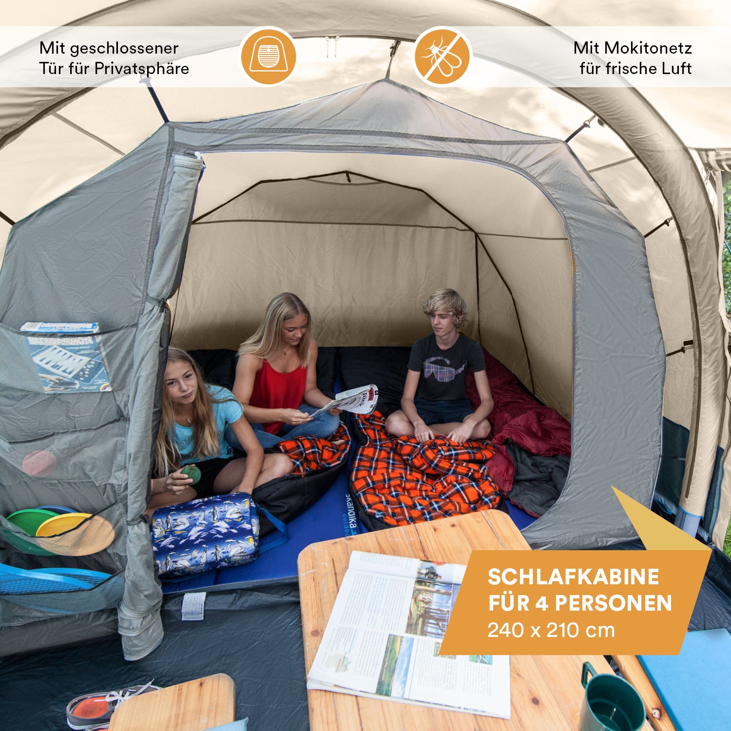 The large sleeping cabin is located at the rear of the tent and offers space for up to 4 people. Breathable material ensures pleasant air and the practical organiser pockets next to the entrance keep important small items to hand at all times.