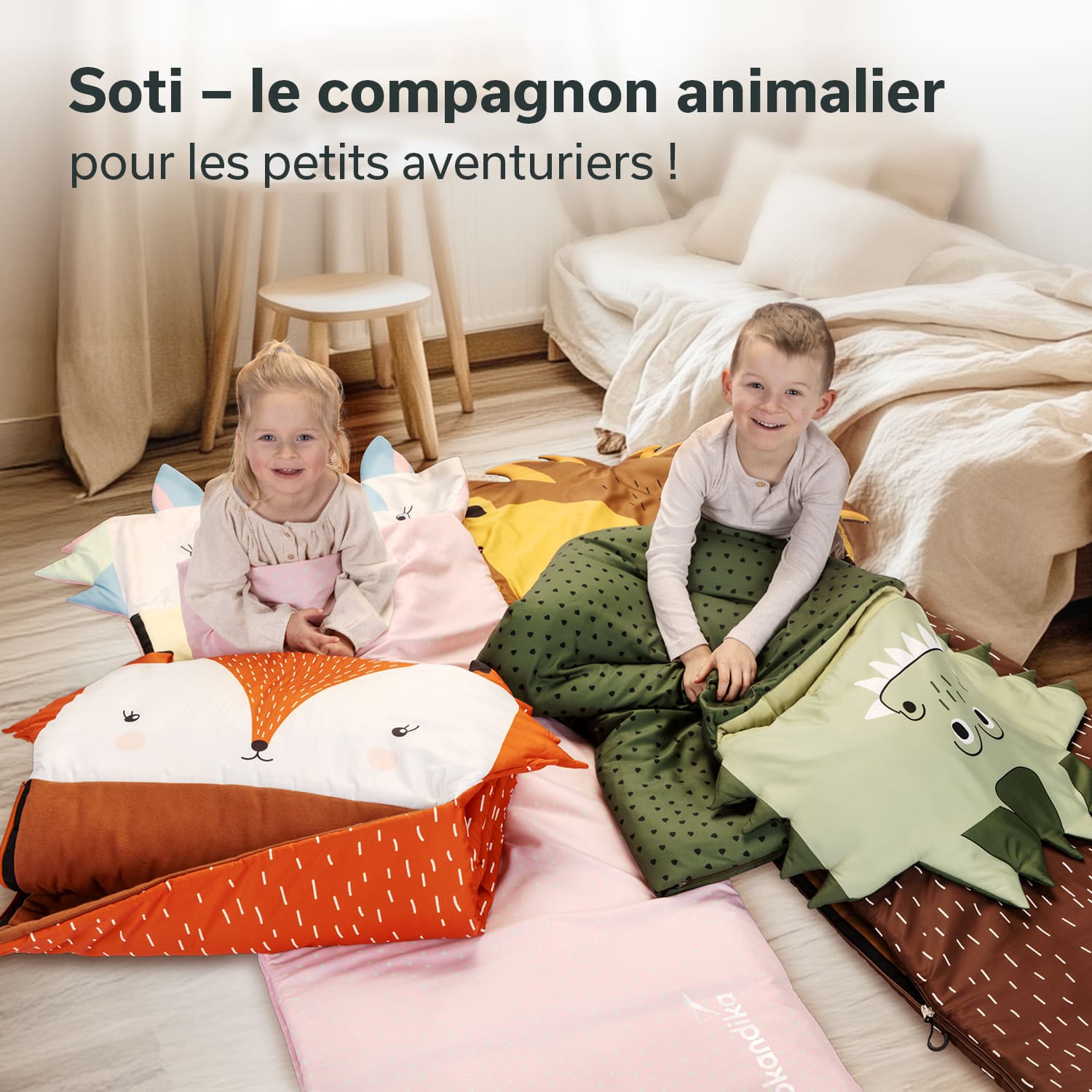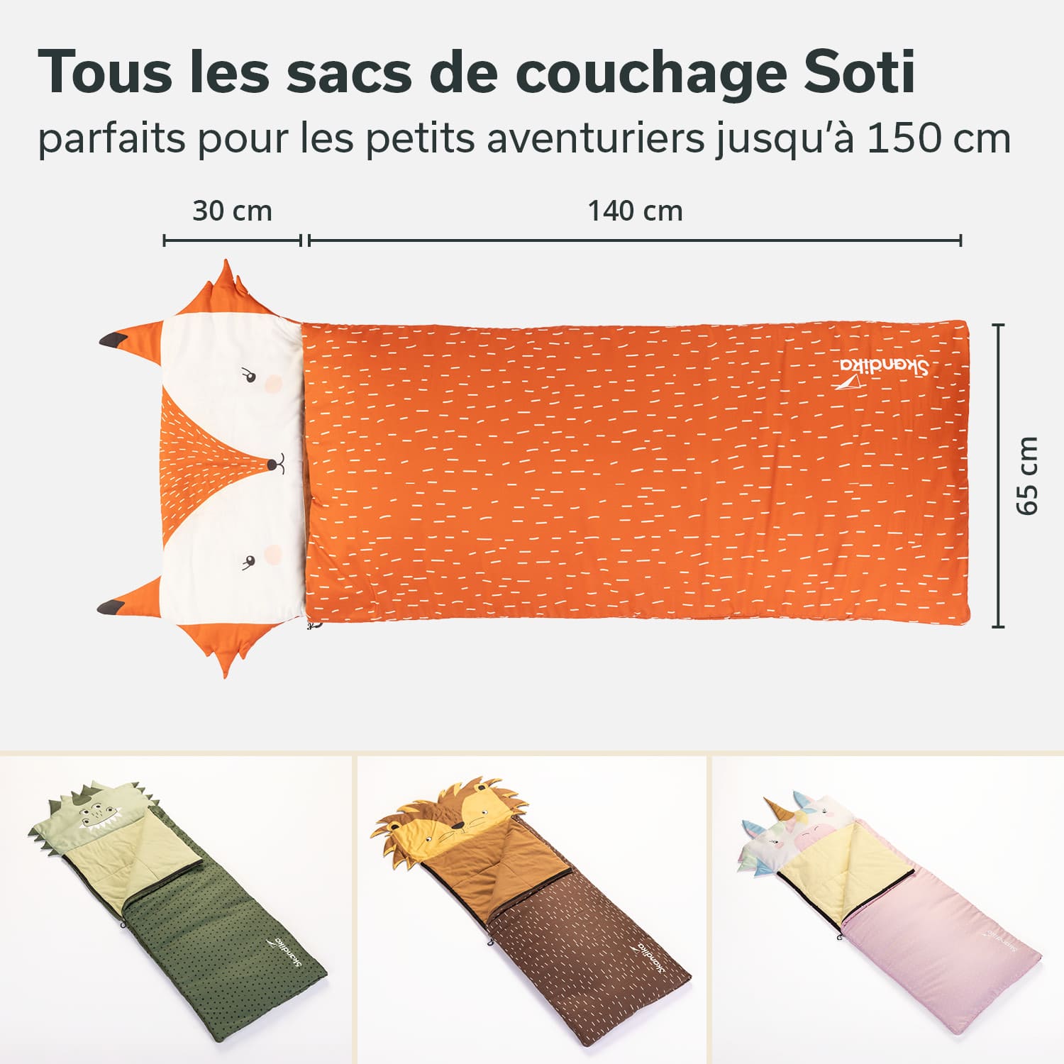 Auswärts übernachten macht Spaß! Ob in den Ferien bei Oma und Opa, auf einer Übernachtungsparty bei Freunden aus dem Kindergarten oder als Outdoor-Profi mit den Eltern auf dem Campingplatz. Die farbenfrohen Schlafsäcke fallen mit ihrem großen Kopfteil mit putzigem Tierkopf ganz besonders ins Auge. Schluss mit langweiligen, einfarbigen Designs. Bei den Skandika Sotis helfen Löwe, Dinosaurier, Einhorn und Fuchs dabei, die Angst im Dunkeln zu vertreiben, und sorgen für jede Menge Spaß. Soti – der tierisch gute Begleiter für kleine Abenteurer!