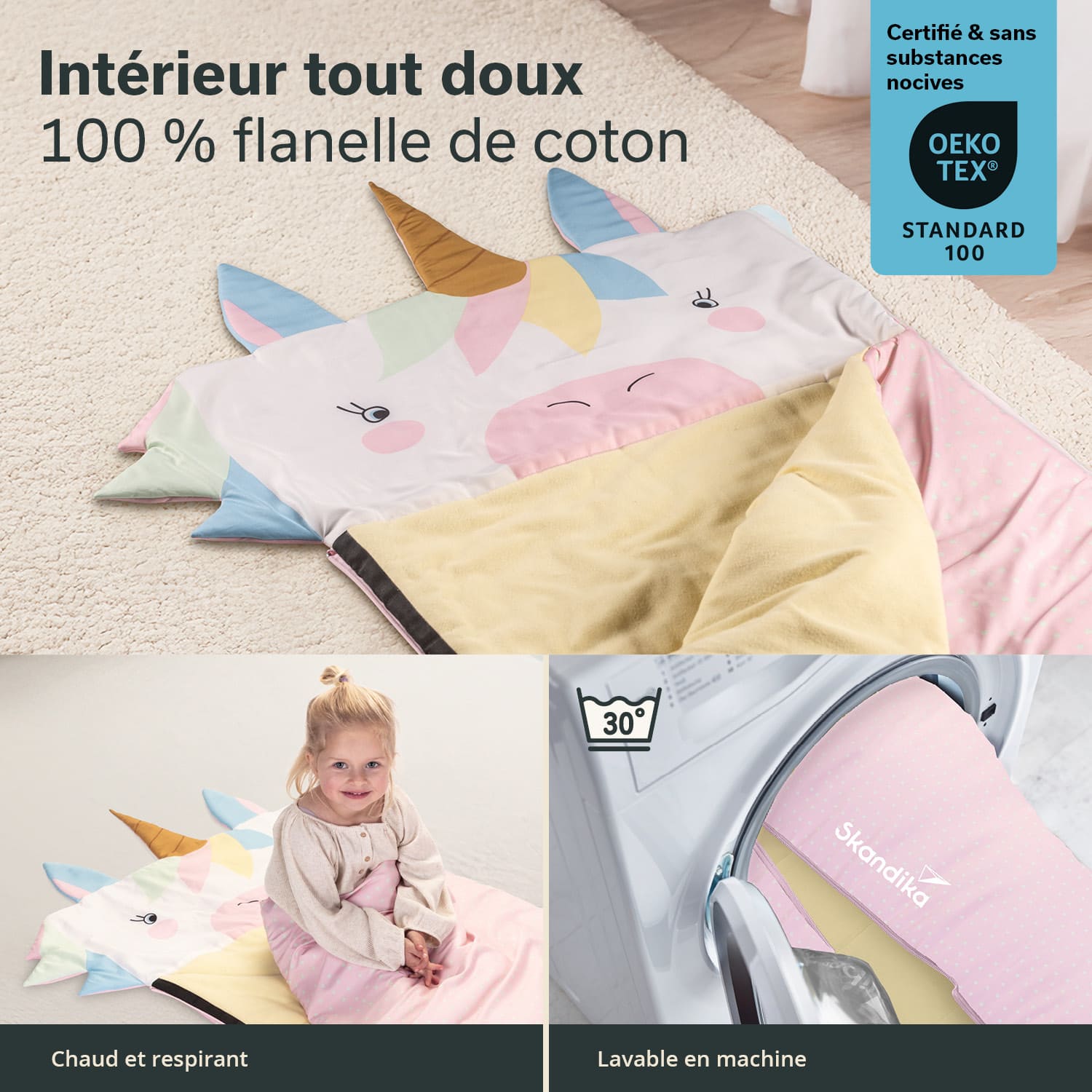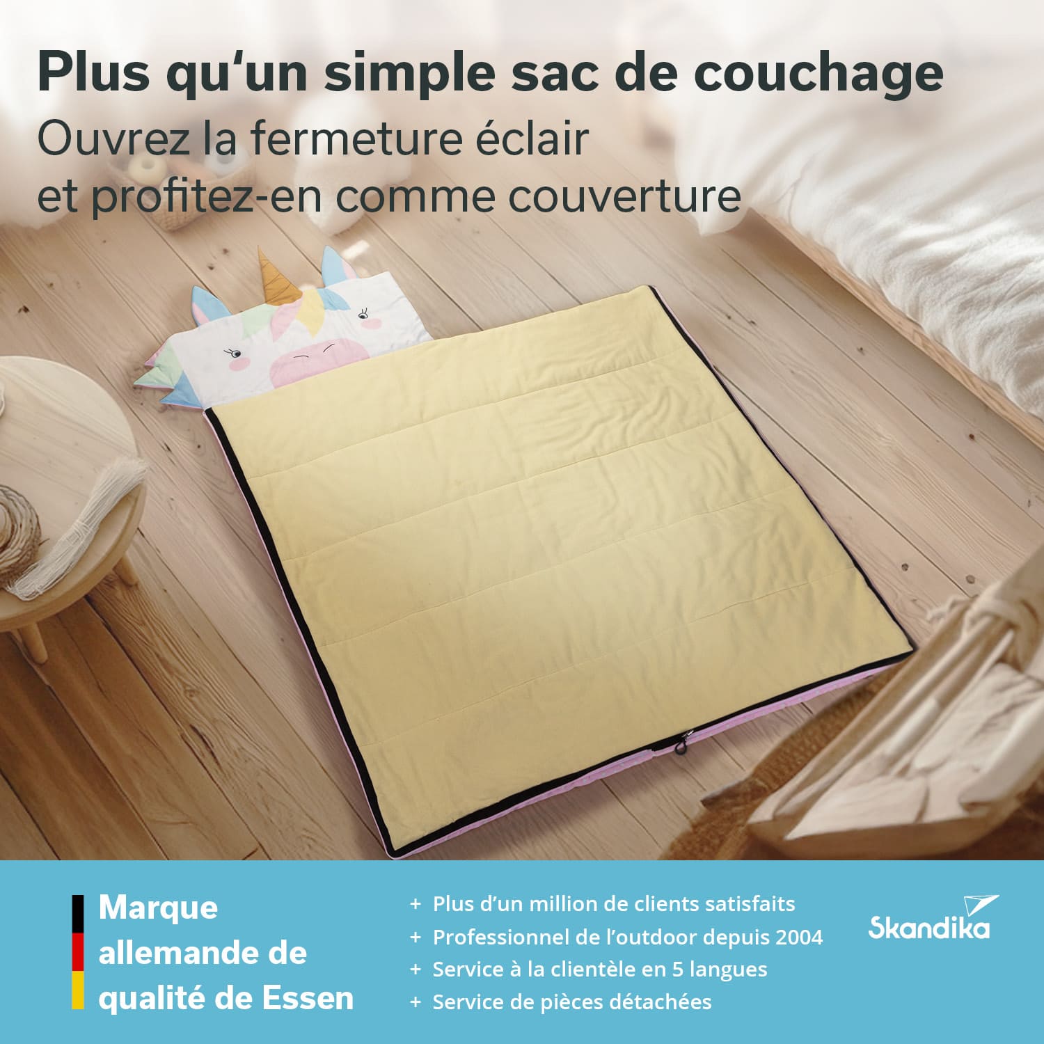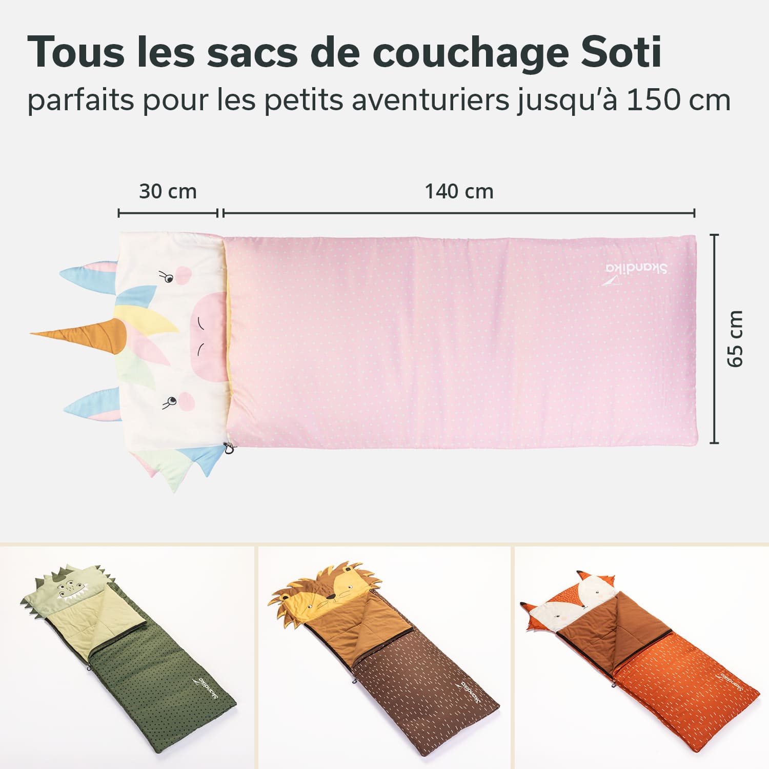 Auswärts übernachten macht Spaß! Ob in den Ferien bei Oma und Opa, auf einer Übernachtungsparty bei Freunden aus dem Kindergarten oder als Outdoor-Profi mit den Eltern auf dem Campingplatz. Die farbenfrohen Schlafsäcke fallen mit ihrem großen Kopfteil mit putzigem Tierkopf ganz besonders ins Auge. Schluss mit langweiligen, einfarbigen Designs. Bei den Skandika Sotis helfen Löwe, Dinosaurier, Einhorn und Fuchs dabei, die Angst im Dunkeln zu vertreiben, und sorgen für jede Menge Spaß. Soti – der tierisch gute Begleiter für kleine Abenteurer!