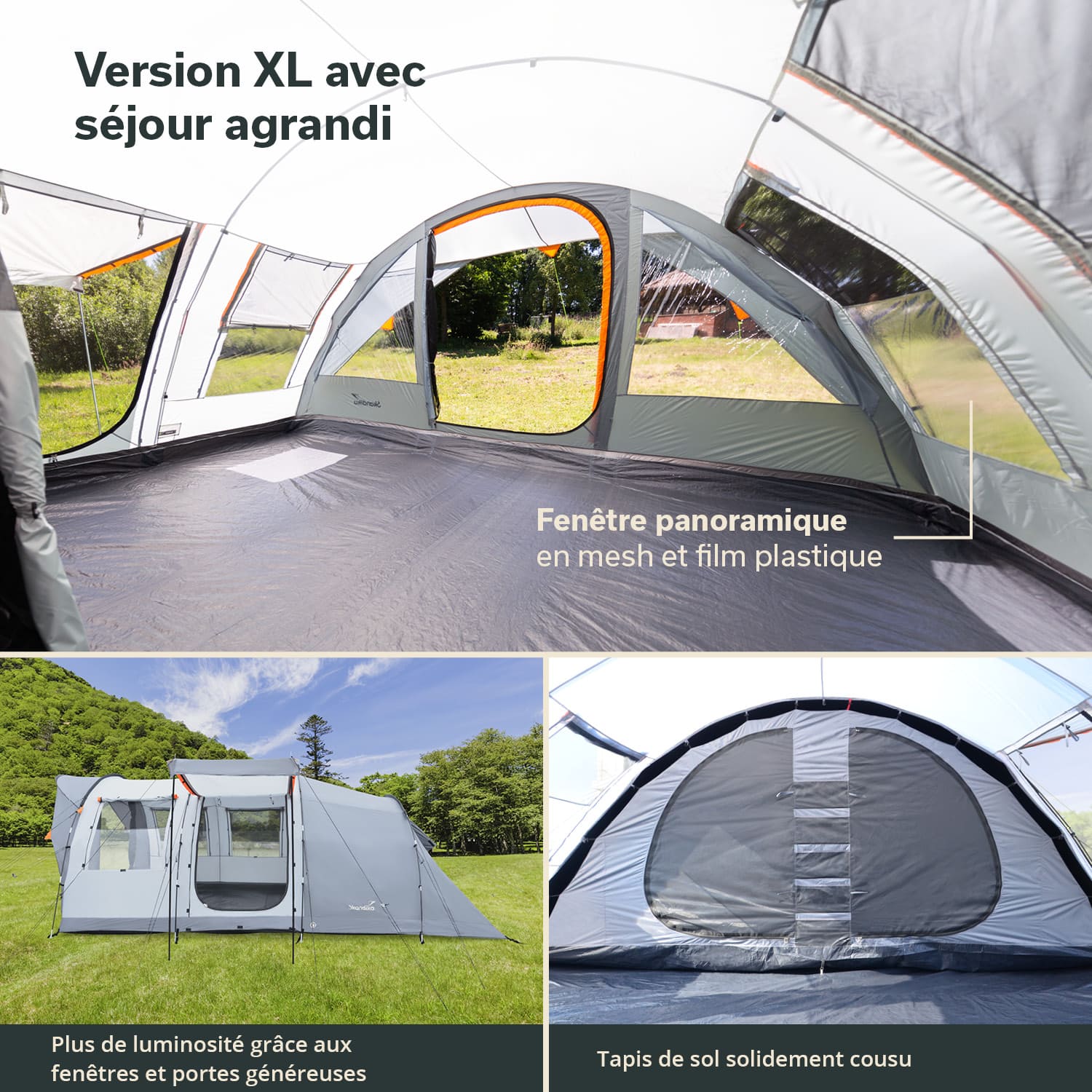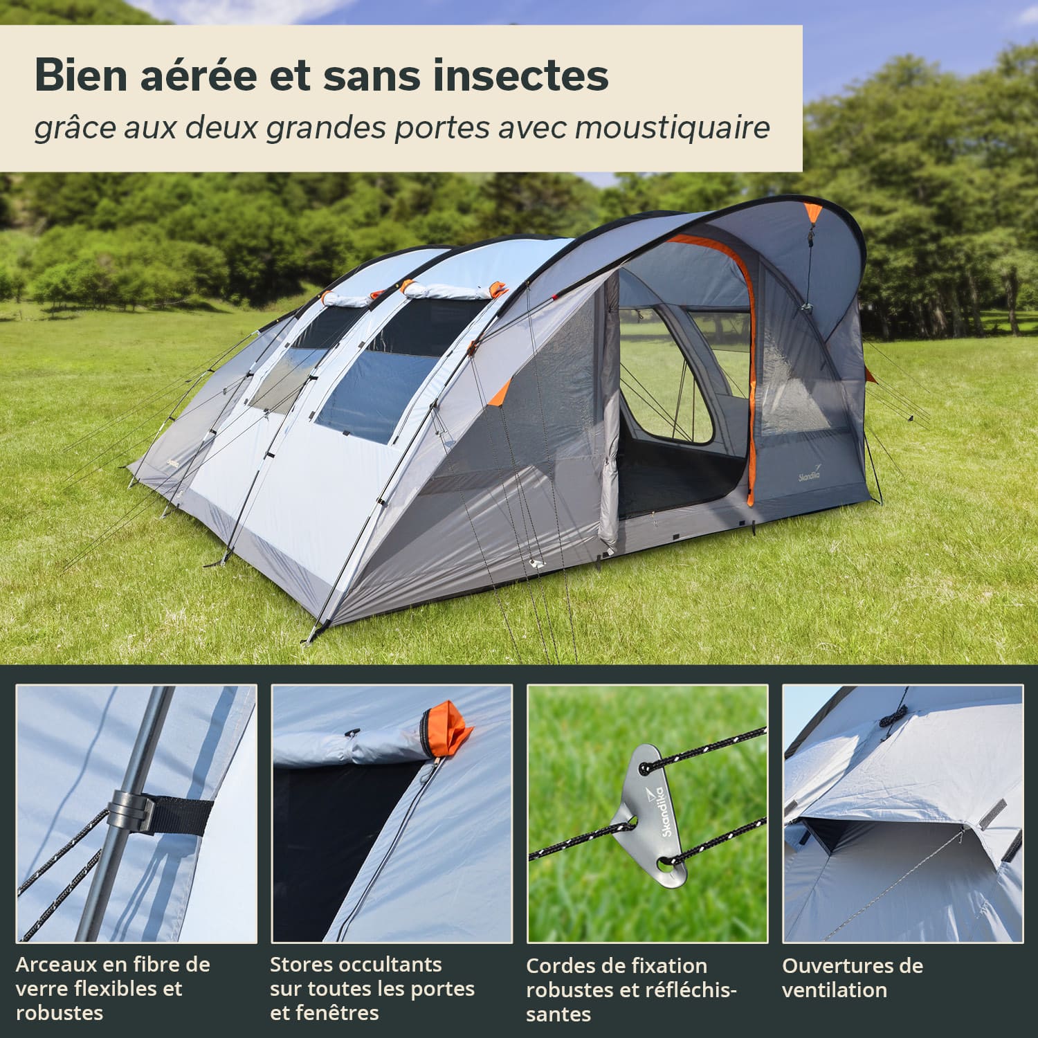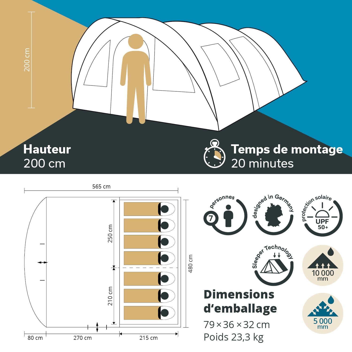 Geräumiges Tunnelzelt für 7 Personen mit noch größerem Wohnraum für das kleine Extra an Komfort. Im Nu aufgestellt und mit einer bequemen Stehhöhe von 200 cm ermöglicht das Zelt tolle Outdoor-Abenteuer für Familien mit Kindern oder Gruppen von Freunden.