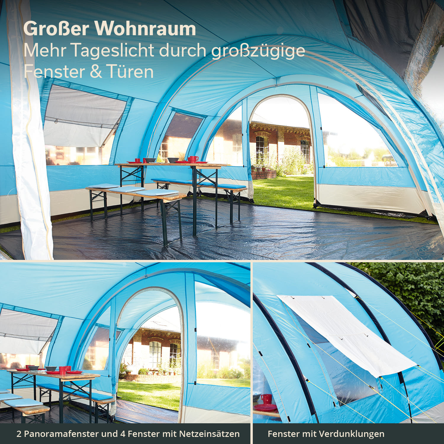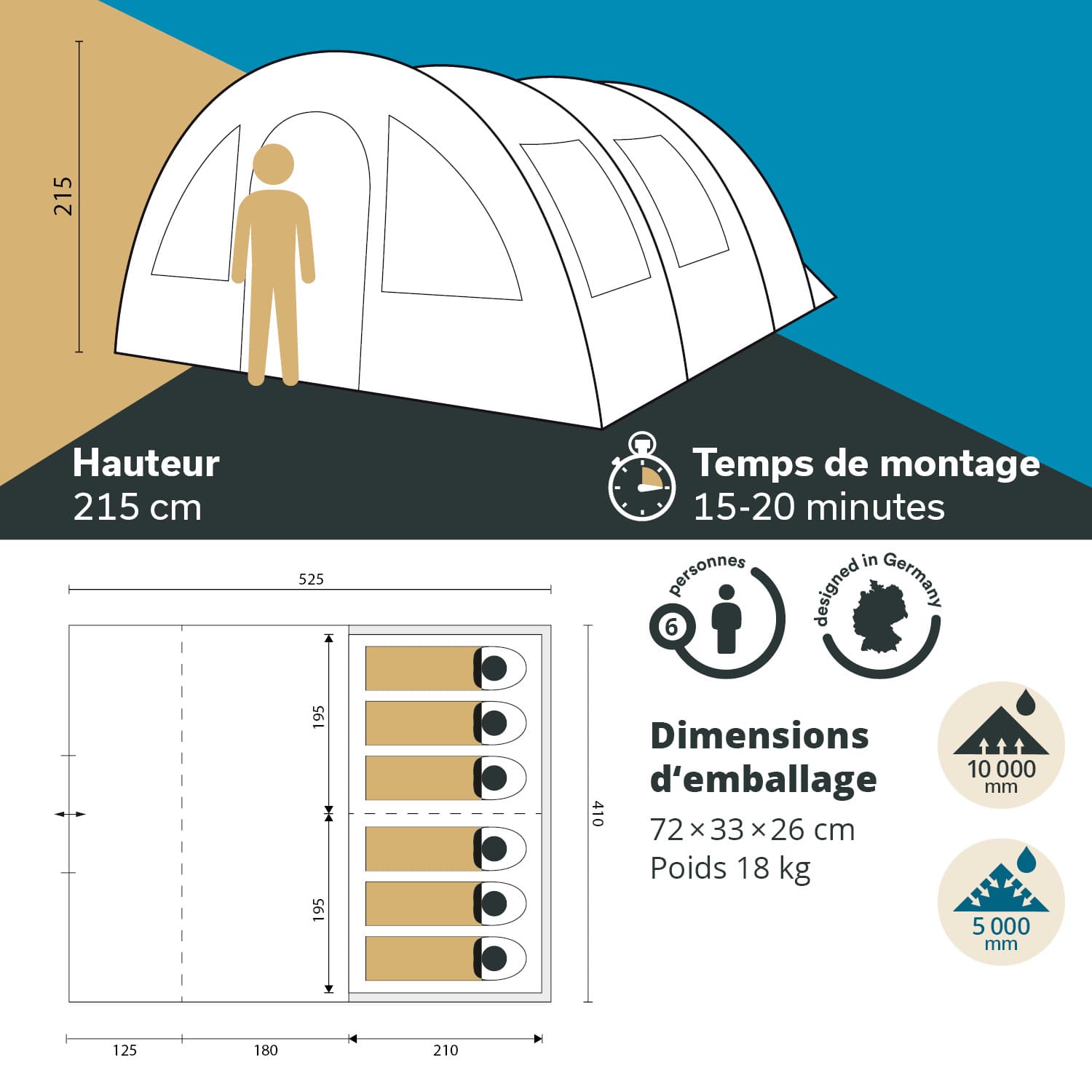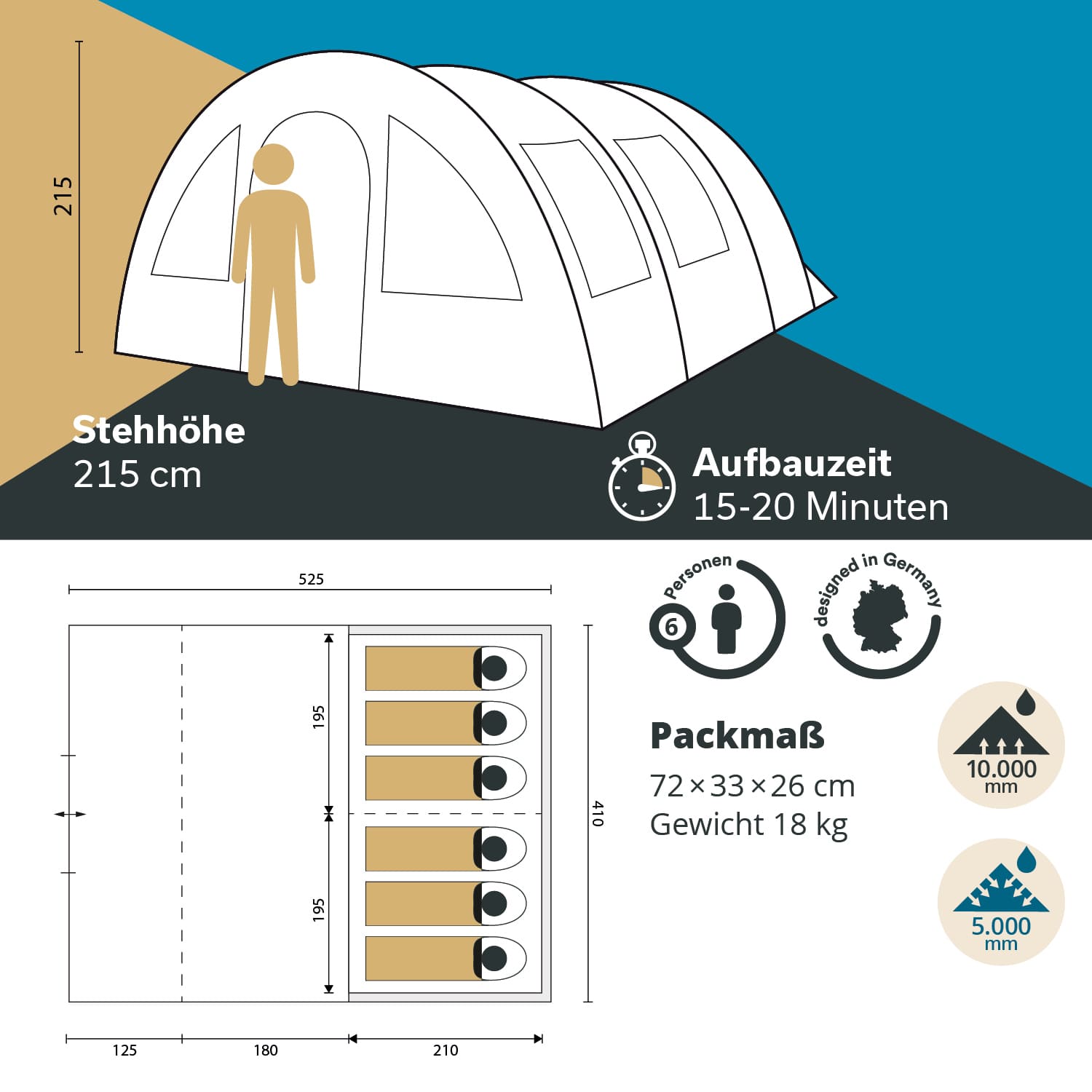 At the rear is the sleeping cabin, which is fitted with a partition wall so that it can also be used as two smaller areas. Thanks to the zip-out front wall, the HELSINKI boasts either a surprisingly large living area or a spacious canopy, which can be used as a retreat protected from the wind and sun, a play area or a cooking area. Two groundsheets are included so that you can utilise the versatility of this practical tent with dry and clean feet. The water column values of a tent provide information about the quality and strength of its waterproofness, whereby a tent is considered waterproof from 1200 mm. The HELSINKI offers you a water column of 5000 mm and therefore very good weather protection. The tent poles of the HELSINKI are made of unbreakable fibreglass and are extremely stable yet flexible: an extremely welcome combination. The robust construction of the tent with tear-resistant material, sealed seams and reinforced eyelets and flaps make the HELSINKI a good investment. A practical packing bag with detailed assembly instructions, extensive accessories (guy ropes, pegs, etc.) and a repair kit are included just in case!