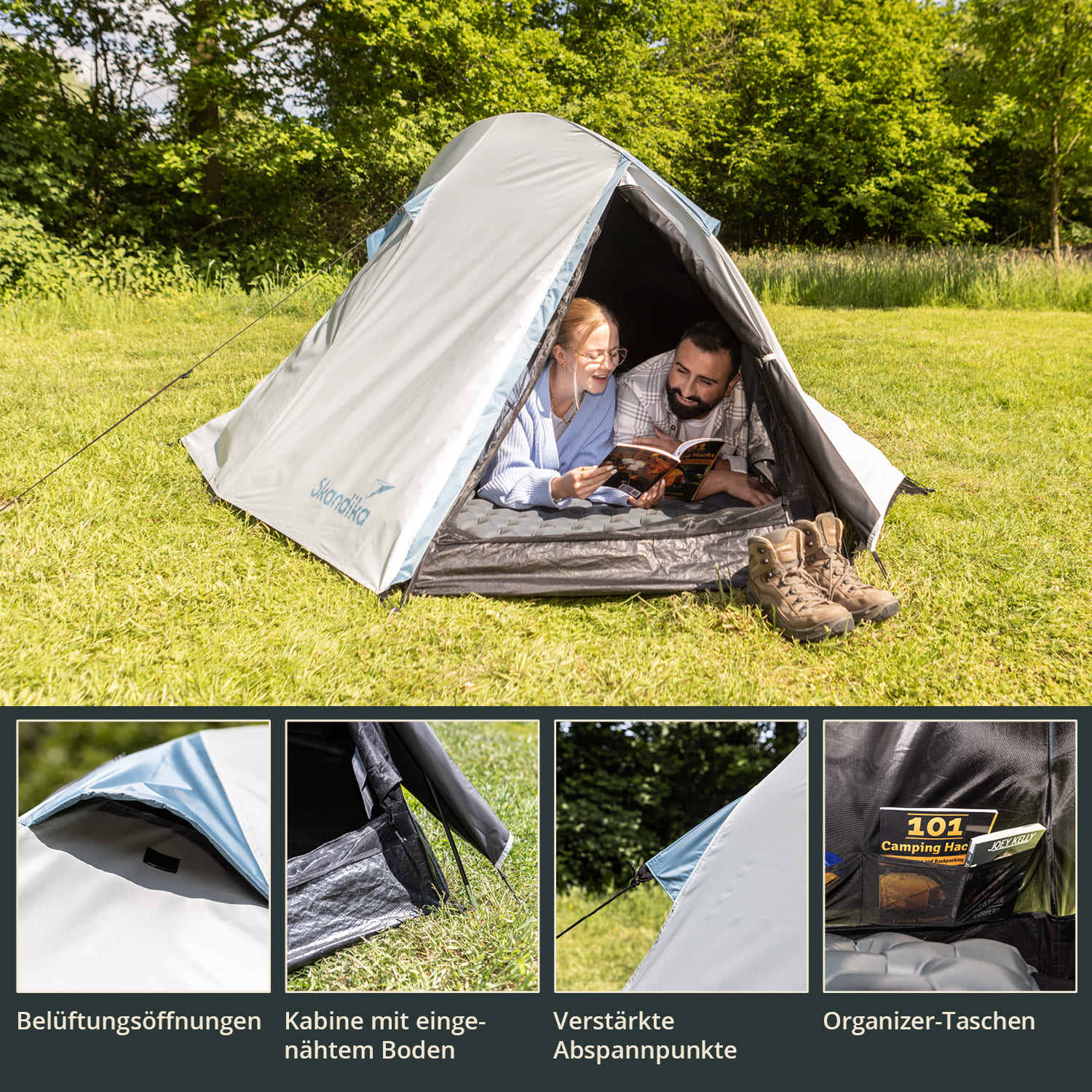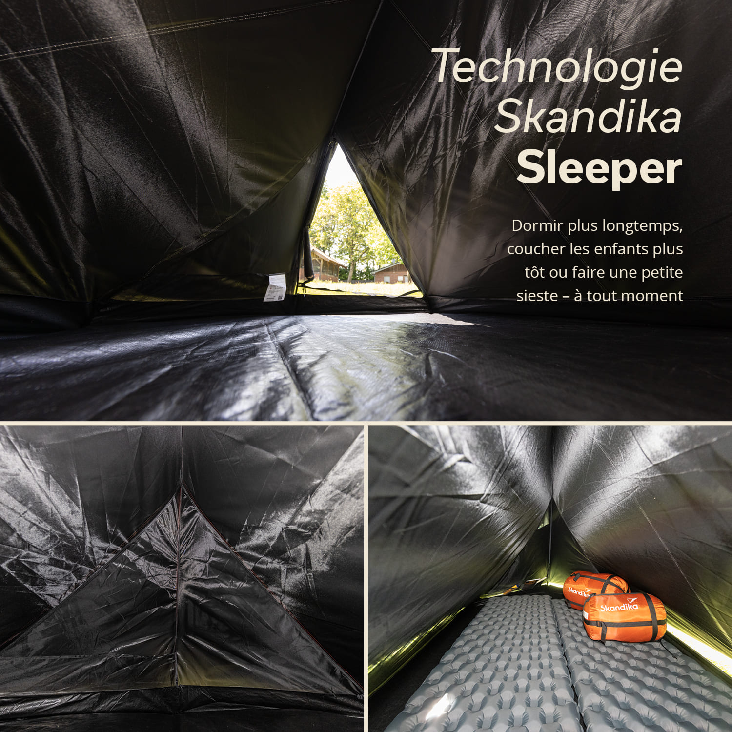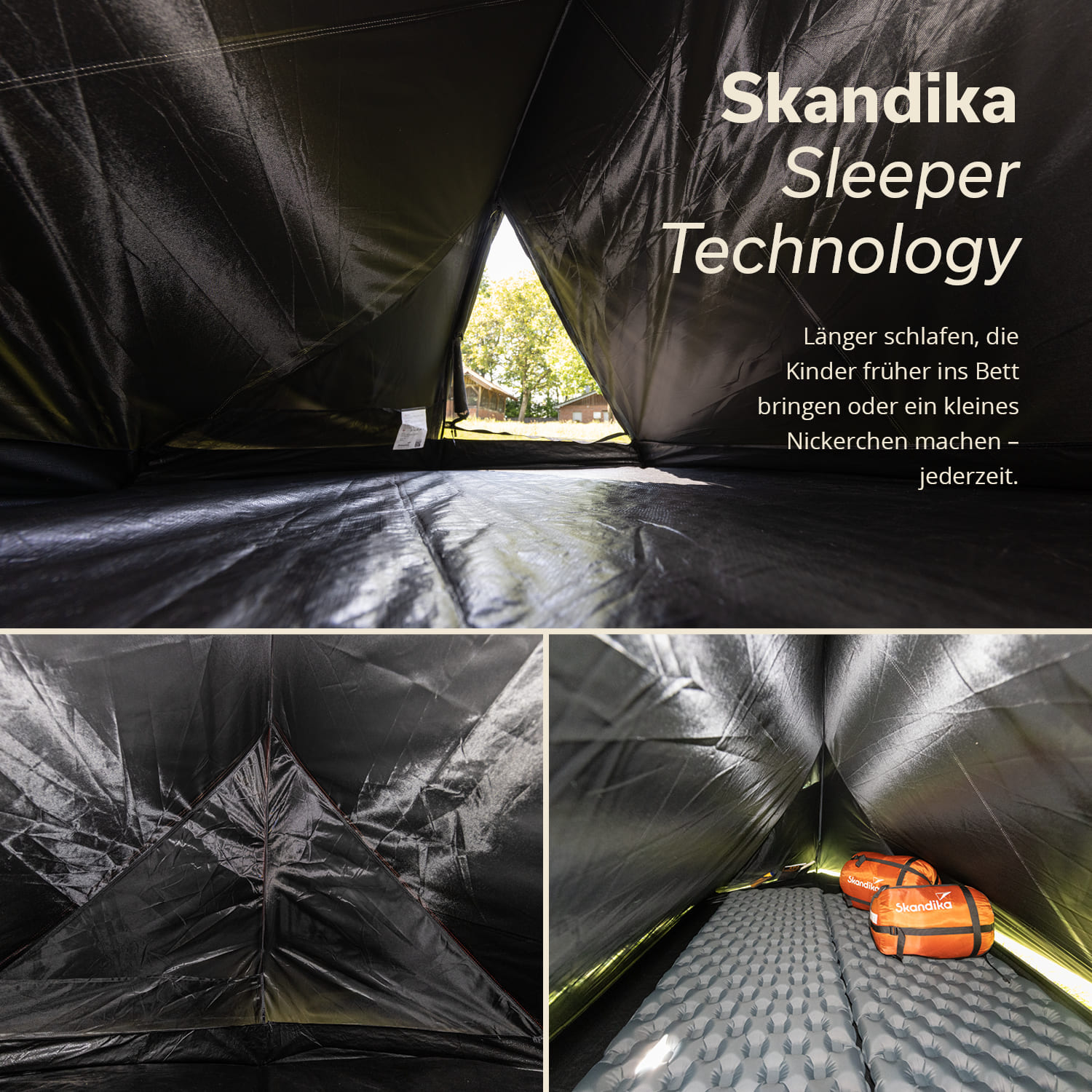 The clever tent with Skandika Sleeper technology has a special coating on the flysheet that absorbs almost 100% of the sunlight. Want to sleep in longer or take a nap at lunchtime? Everything is possible in the completely dark Hemus thanks to Skandika Sleeper technology!