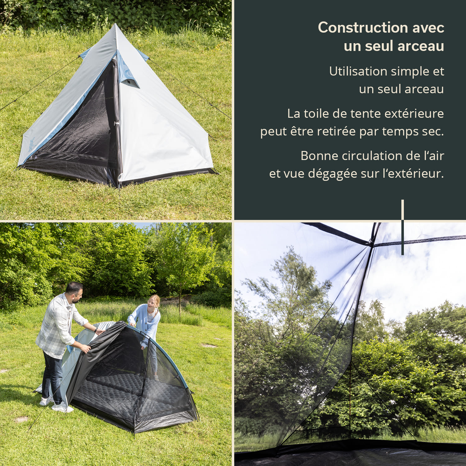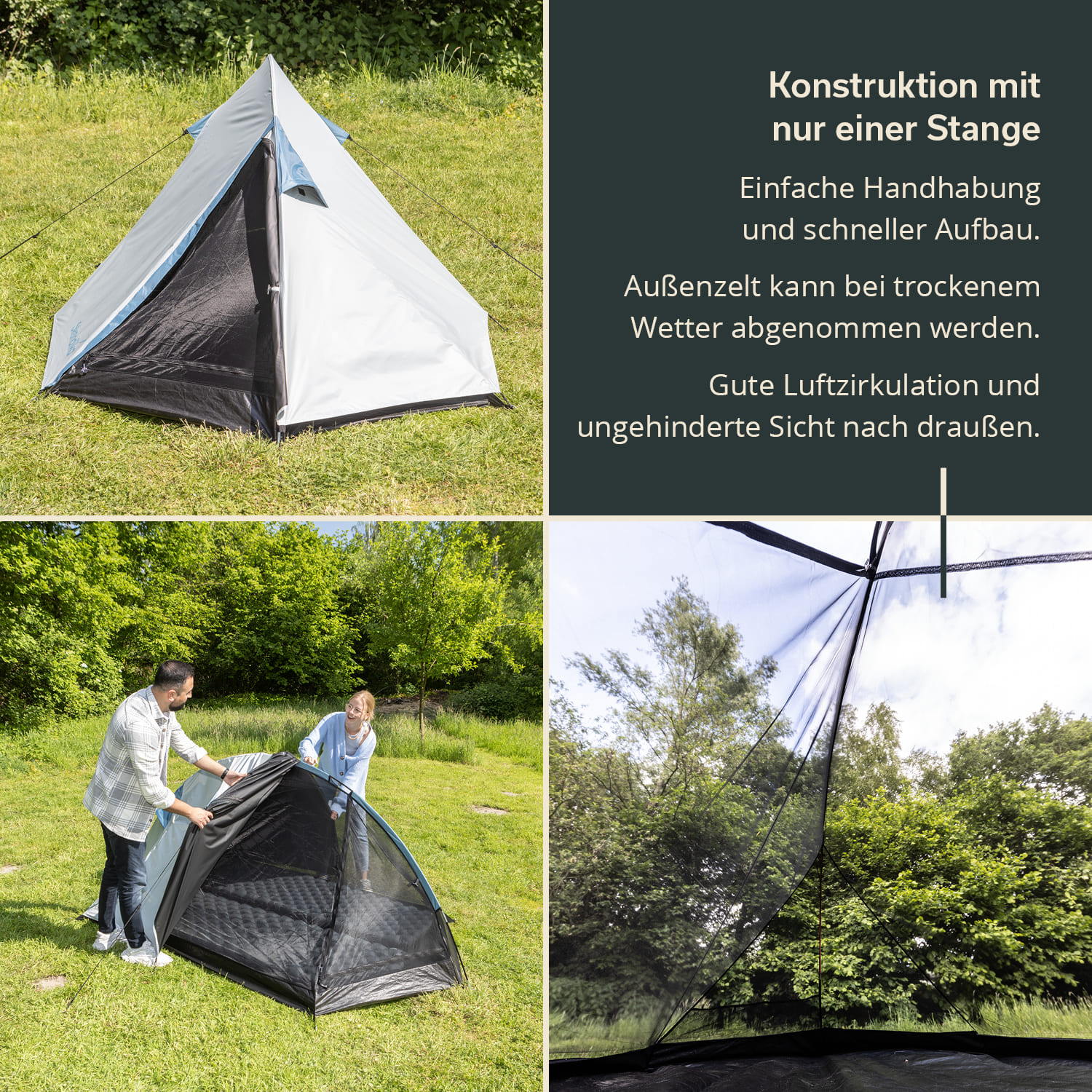 In addition, the Skandika Hemus Sleeper is ideally equipped for all weather conditions, whether sunshine or rain. Equipped with robust fibreglass poles and an outer tent with a 3000 mm water column, the tent offers excellent protection from even the worst weather. When temperatures rise, the outer tent can be removed for perfect air circulation, as the inner tent is made entirely of mesh. The unobstructed view outside with simultaneous protection from pesky insects is an absolute highlight.