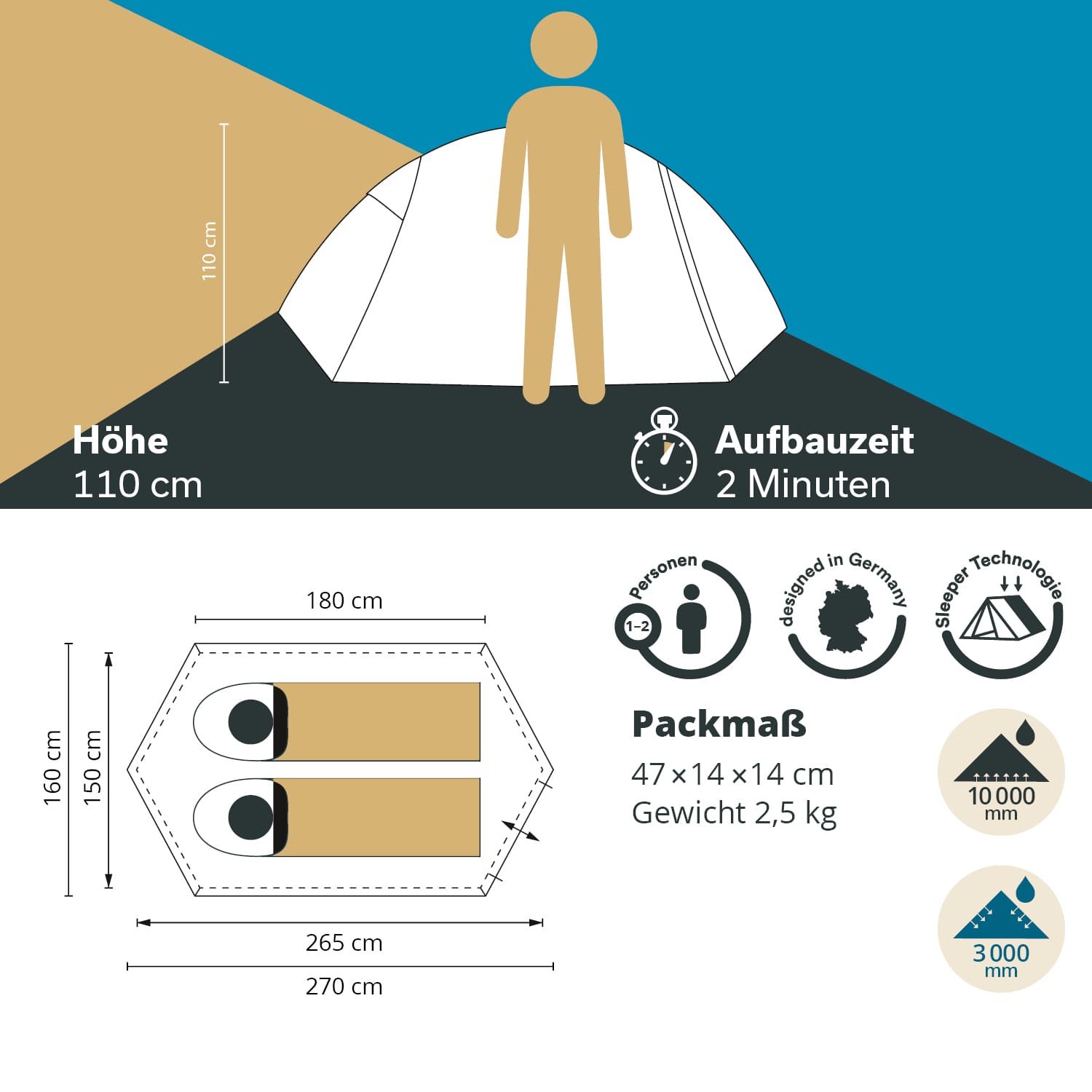 With dimensions of 270 x 160 cm and a height of 110 cm, the Hemus Sleeper offers enough space to stretch out and relax. Despite its compact size, the tent offers a spacious interior that is optimised for the comfort of one or two people.