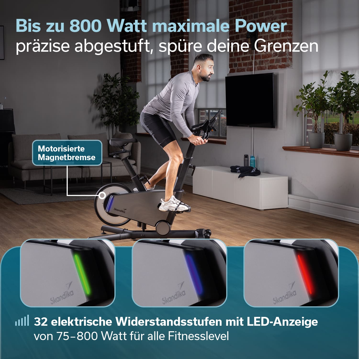 Das Skandika Speedbike Kliva 800-S überzeugt mit bis zu 800 Watt Trainingsleistung und hebt Indoor-Cycling auf ein völlig neues Level. Das Besondere: Dieses smarte Speedbike simuliert Steigungen und Gefälle nicht nur virtuell über den Widerstand, sondern bewegt sich auch tatsächlich. Der integrierte Steigungsmotor neigt das gesamte Bike vor und zurück und schafft damit ein authentisches Fahrgefühl, das dem echten Rennradtraining auf der Straße so nah kommt wie bei kaum einem anderen Indoor-Bike.