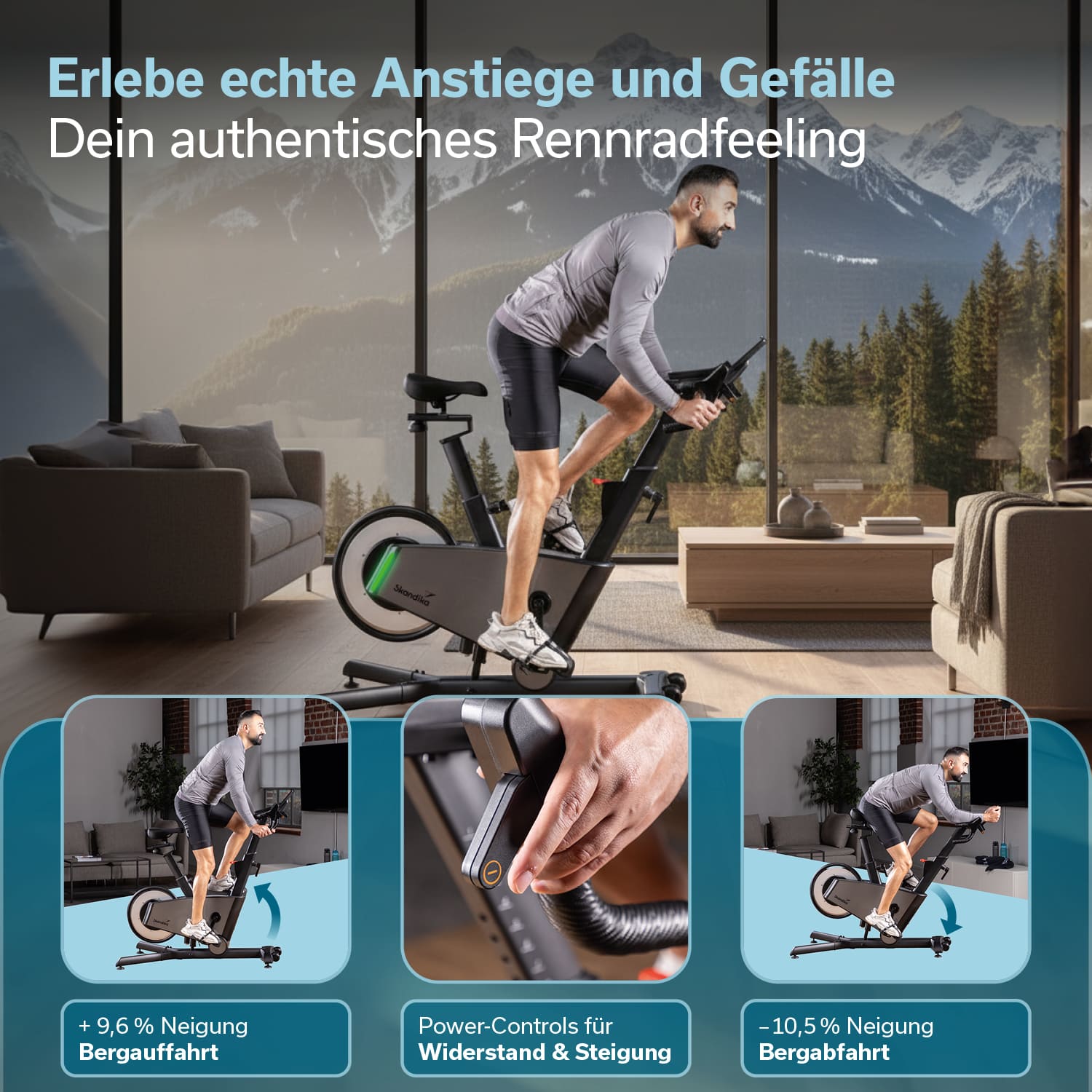 - Motorisierte Steigungsfunktion mit 16 Stufen von -10,5 % bis + 9,6 % für authentisches Rennrad-Feeling