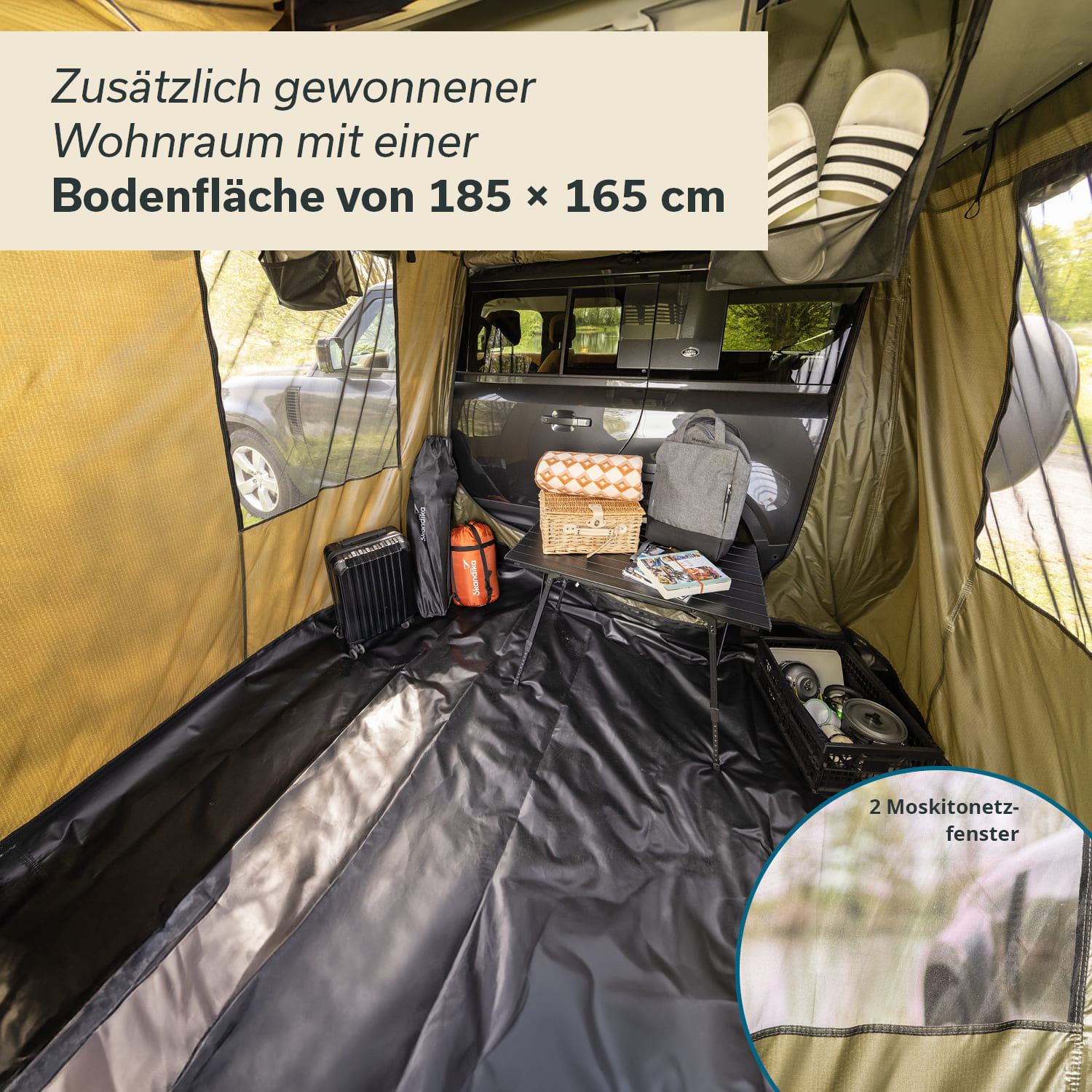 - Geräumiges Vorzelt für den Bereich unter dem Vorbau des Skandika Freeland 3 Dachzelts