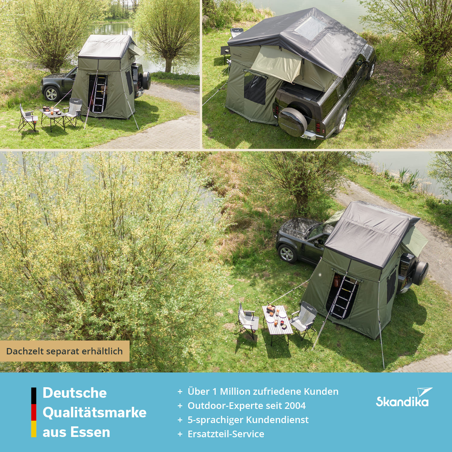 - Das passende Skandika Freeland 3 Dachzelt ist nicht inklusive, sondern separat erhältlich